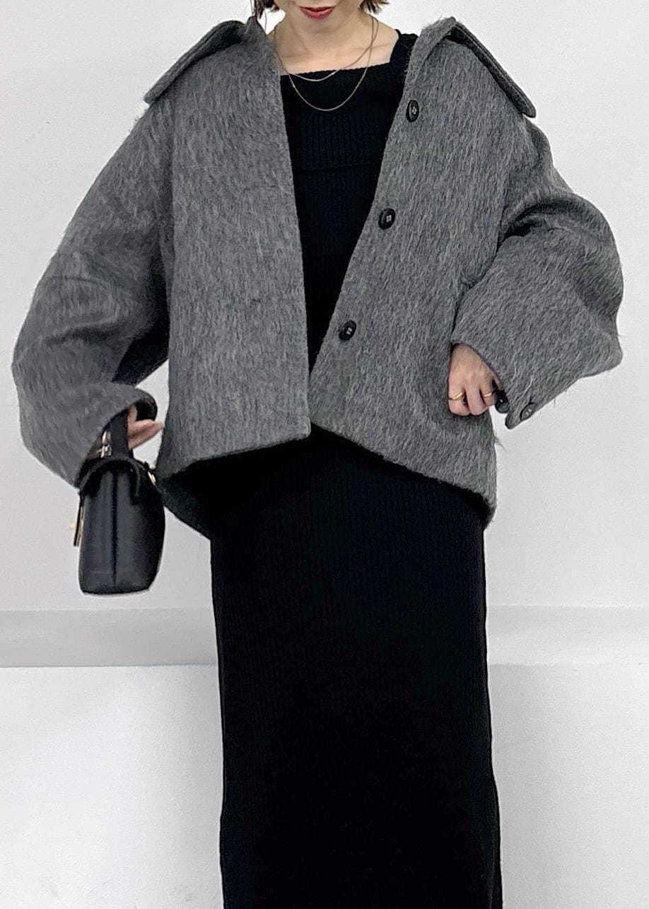 ビックカラーが大人可愛いショートコート♪ゆったりデザインで、大きめな襟が小顔効果抜群です。モモンガシルエットでたぷっとした袖周りが女性らしい。お尻がちょうど隠れる長さなのも安心◎季節を感じるウール混のふわっとした生地で、暖かくて着やすいです。全体的にゆったりめ、着丈は腰、お尻が隠れる長さでした。
