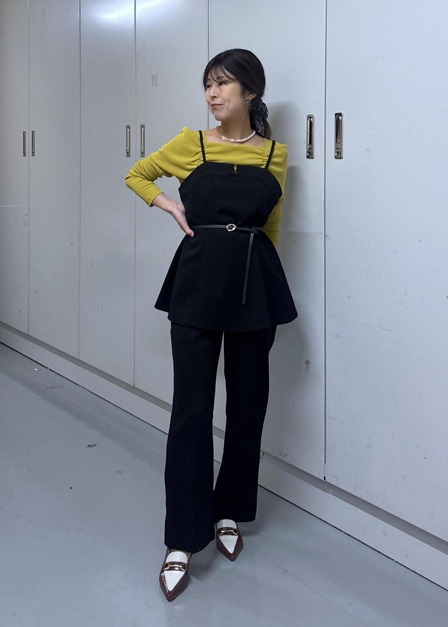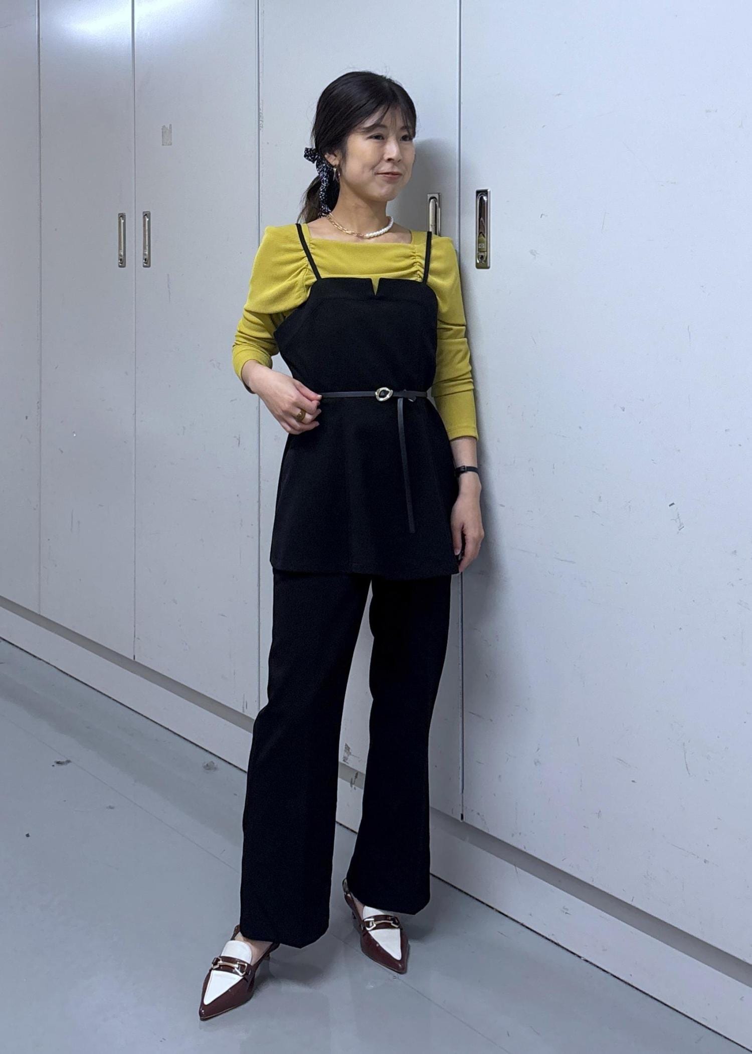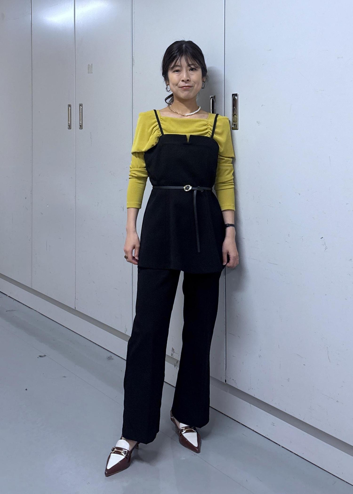 色味をしっかり見せたくて合わせるアイテムは黒系でまとめました♪トーンが落ち着いているカラシ色なので黒と合わせても柔らかい印象になりますよ☺︎