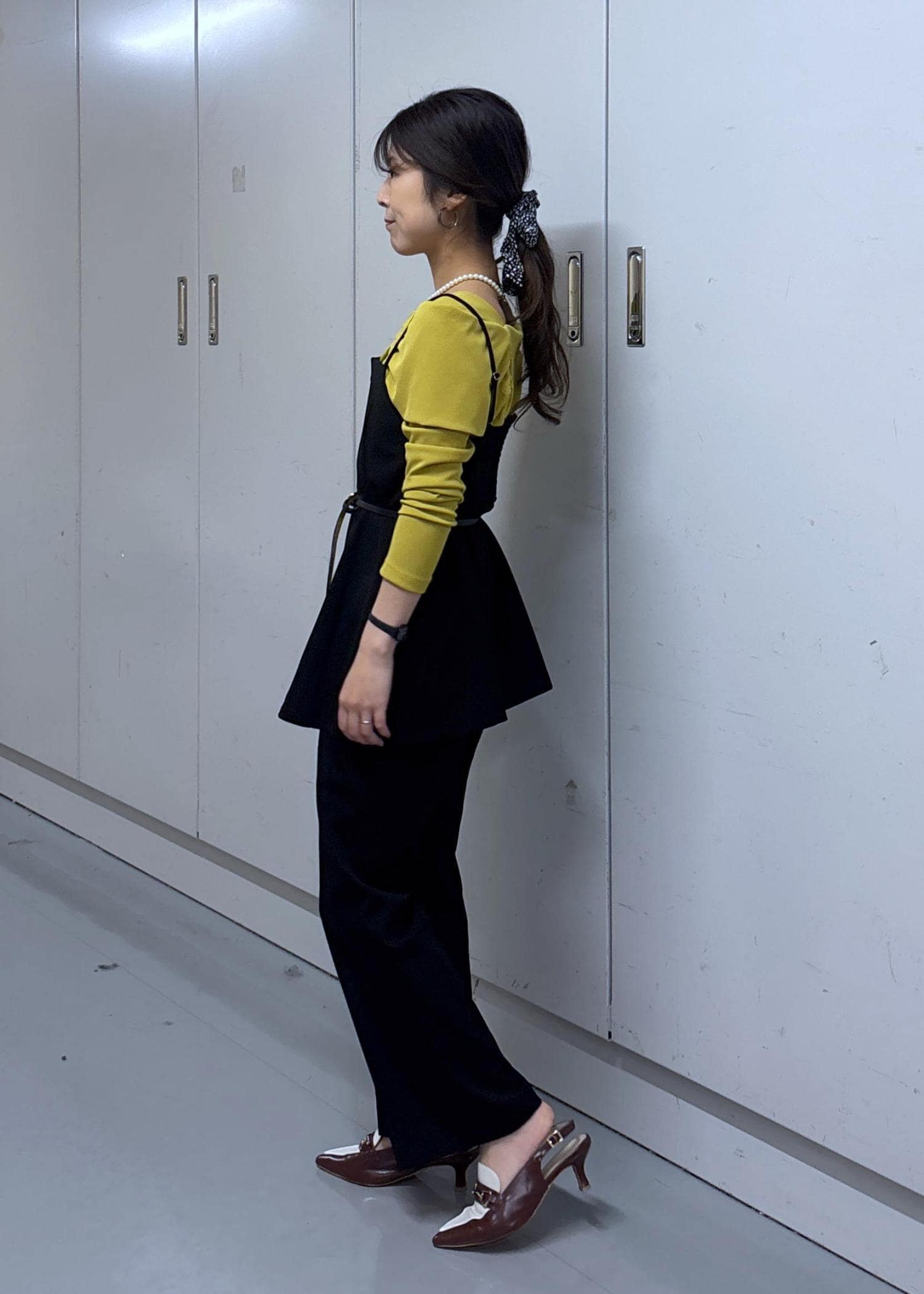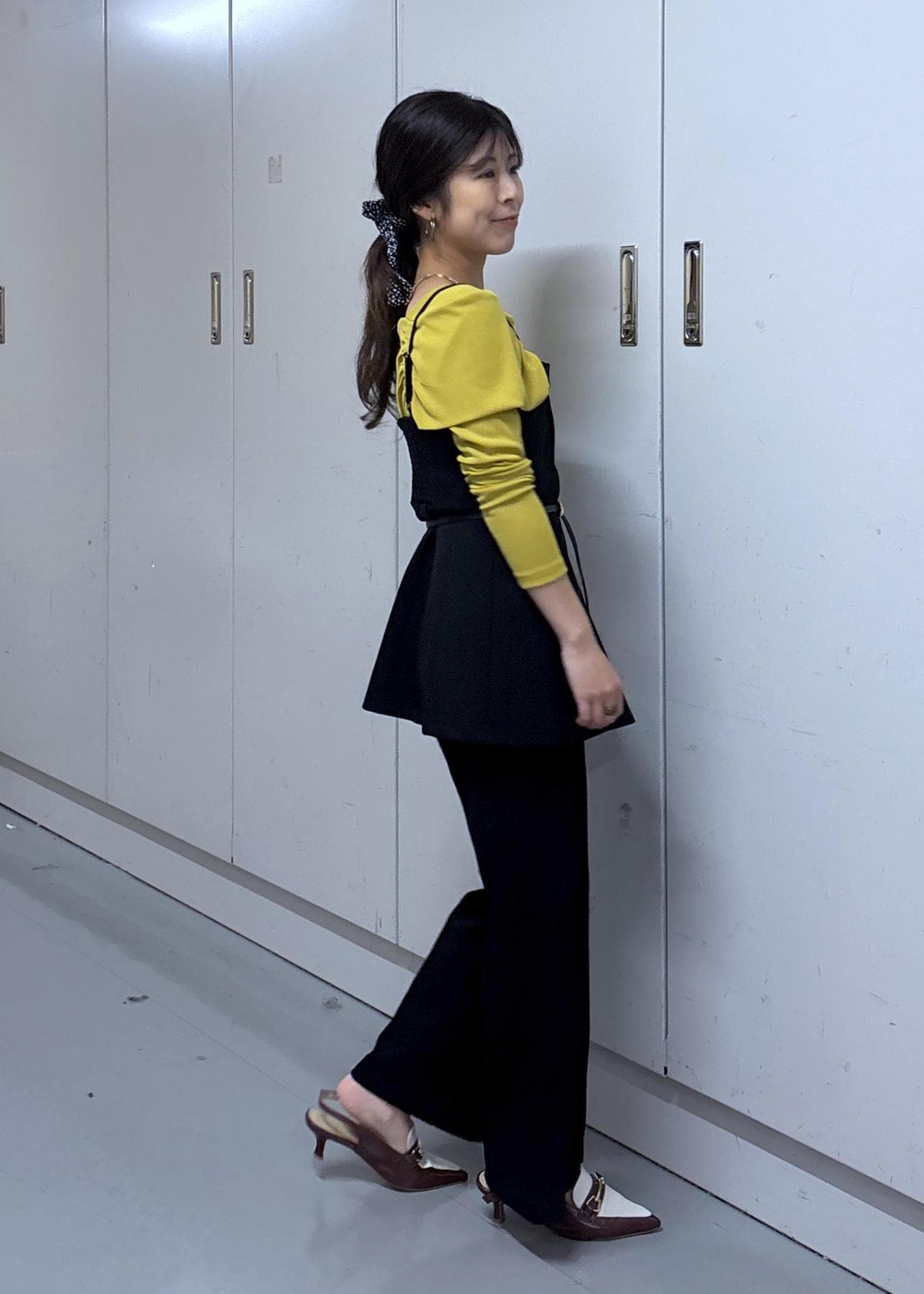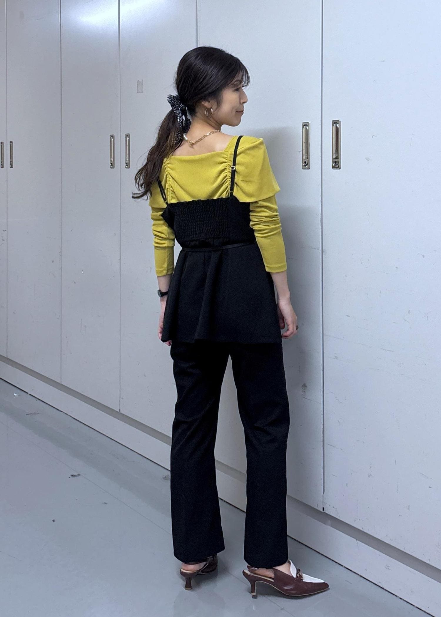 色味をしっかり見せたくて合わせるアイテムは黒系でまとめました♪トーンが落ち着いているカラシ色なので黒と合わせても柔らかい印象になりますよ☺︎