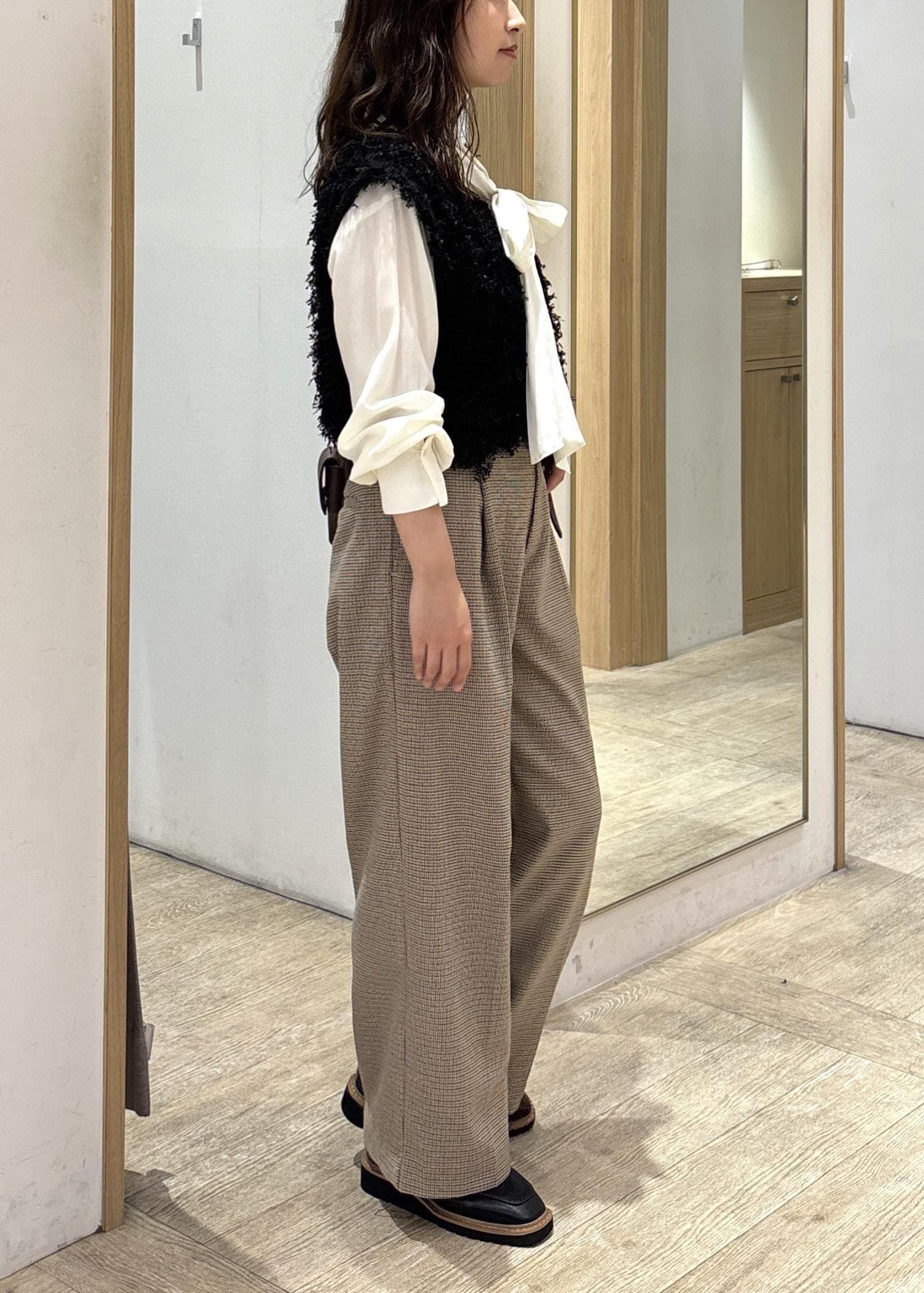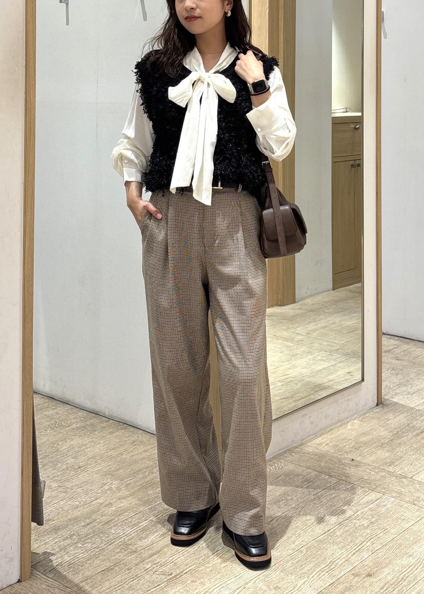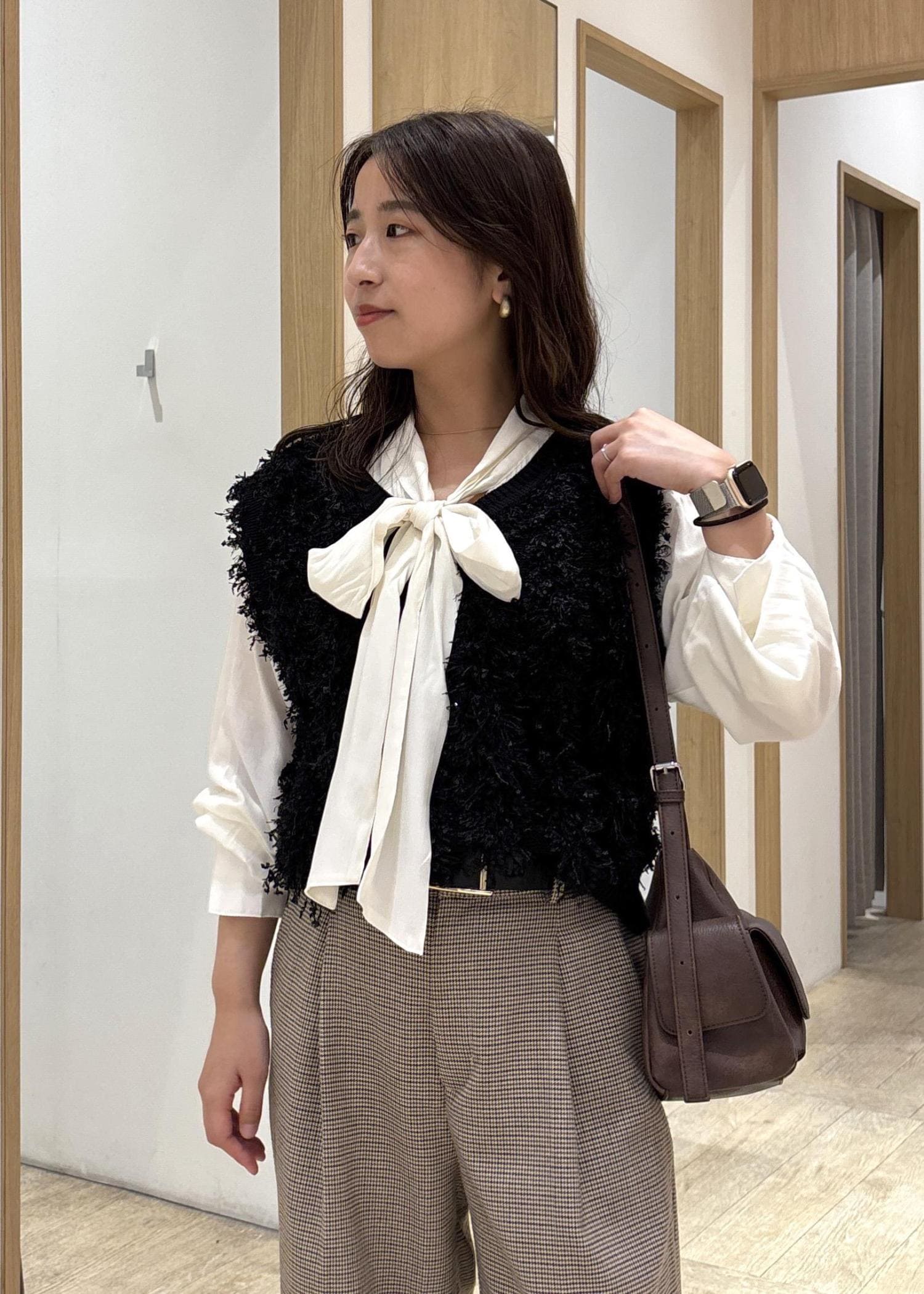目線が上がるリボンタイと小柄さんに嬉しいSSサイズのパンツでスッキリスタイルアップ!