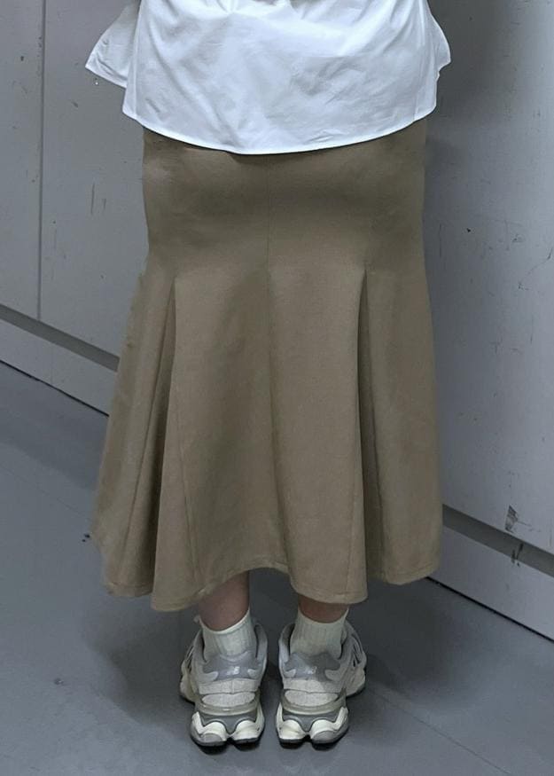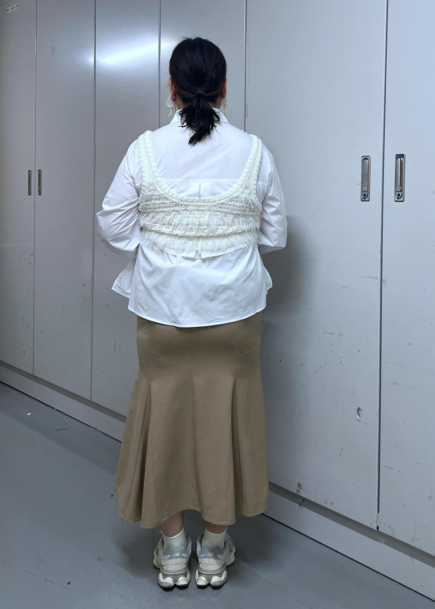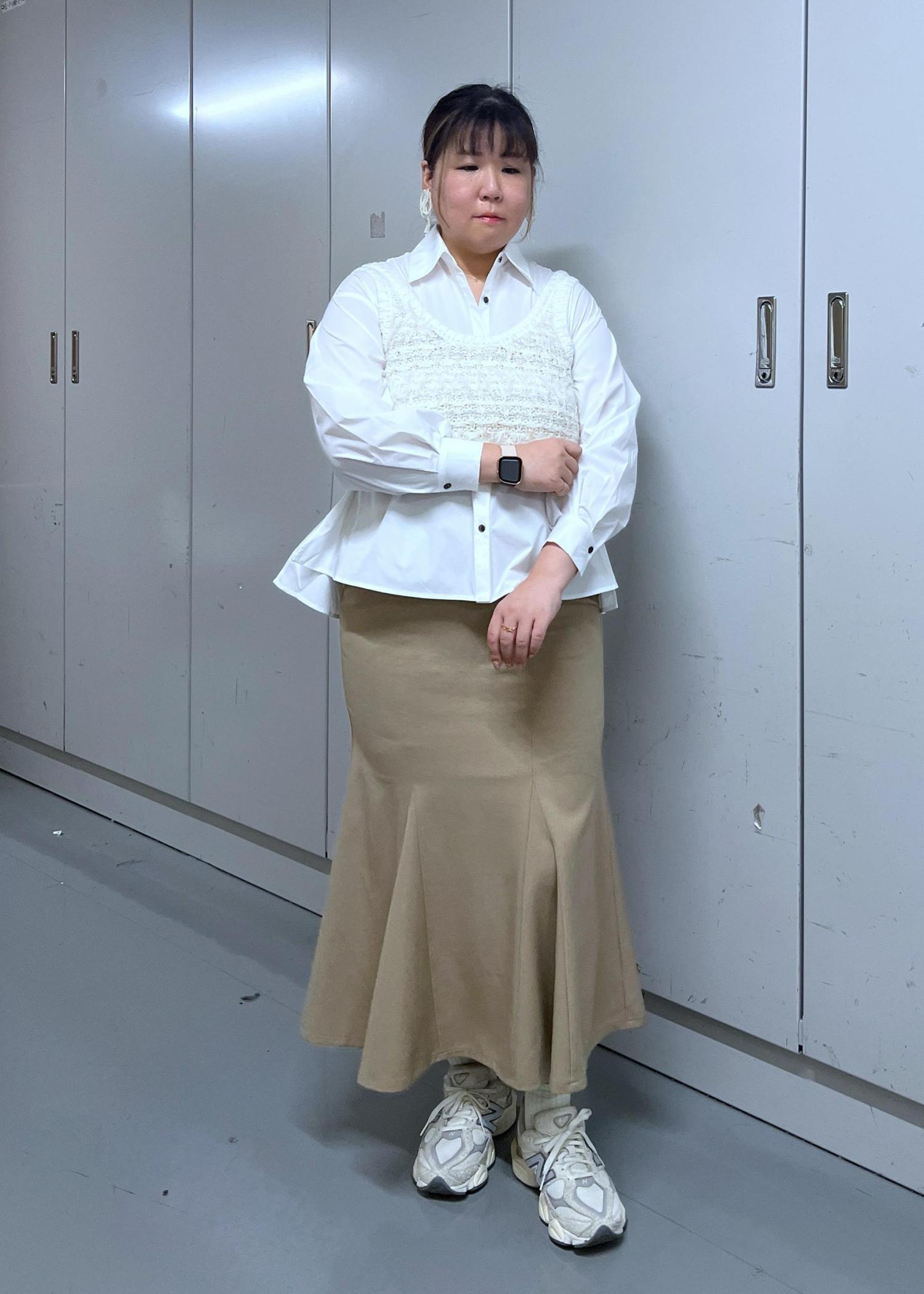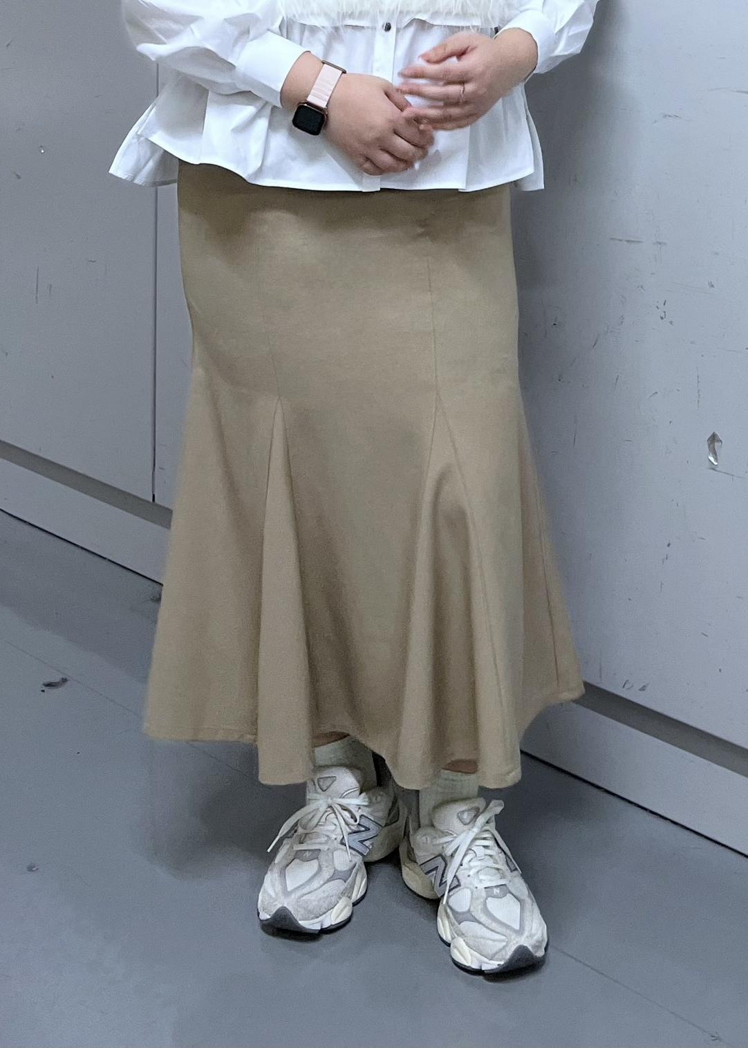 腰回りはややタイトで裾はフレアなので女性らしいラインになります。