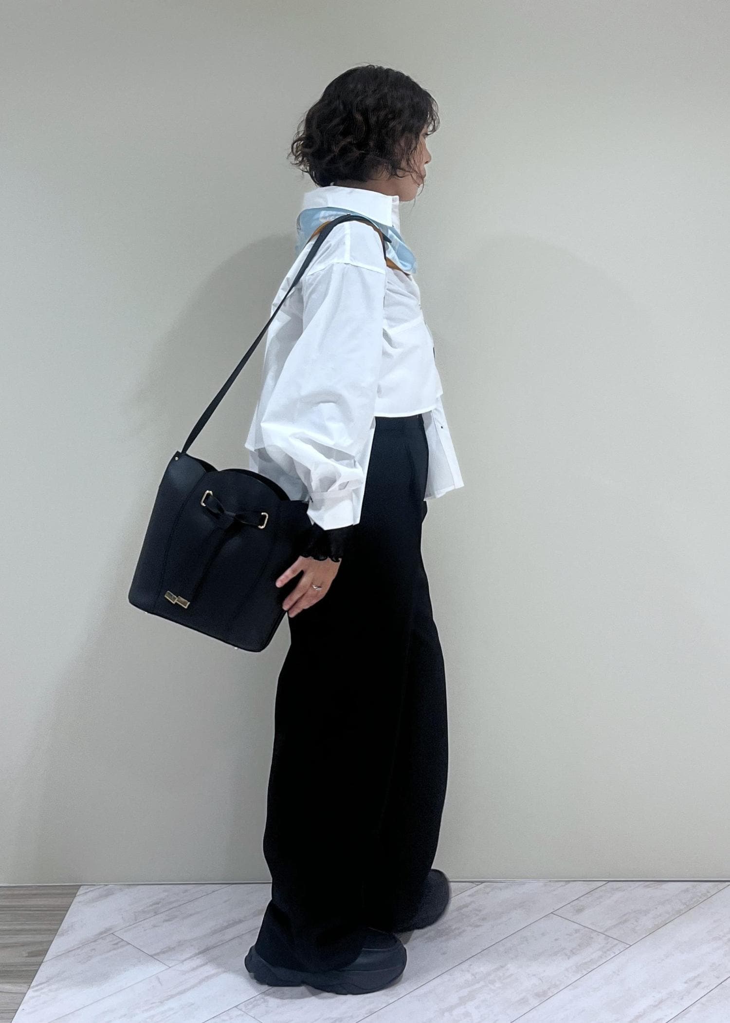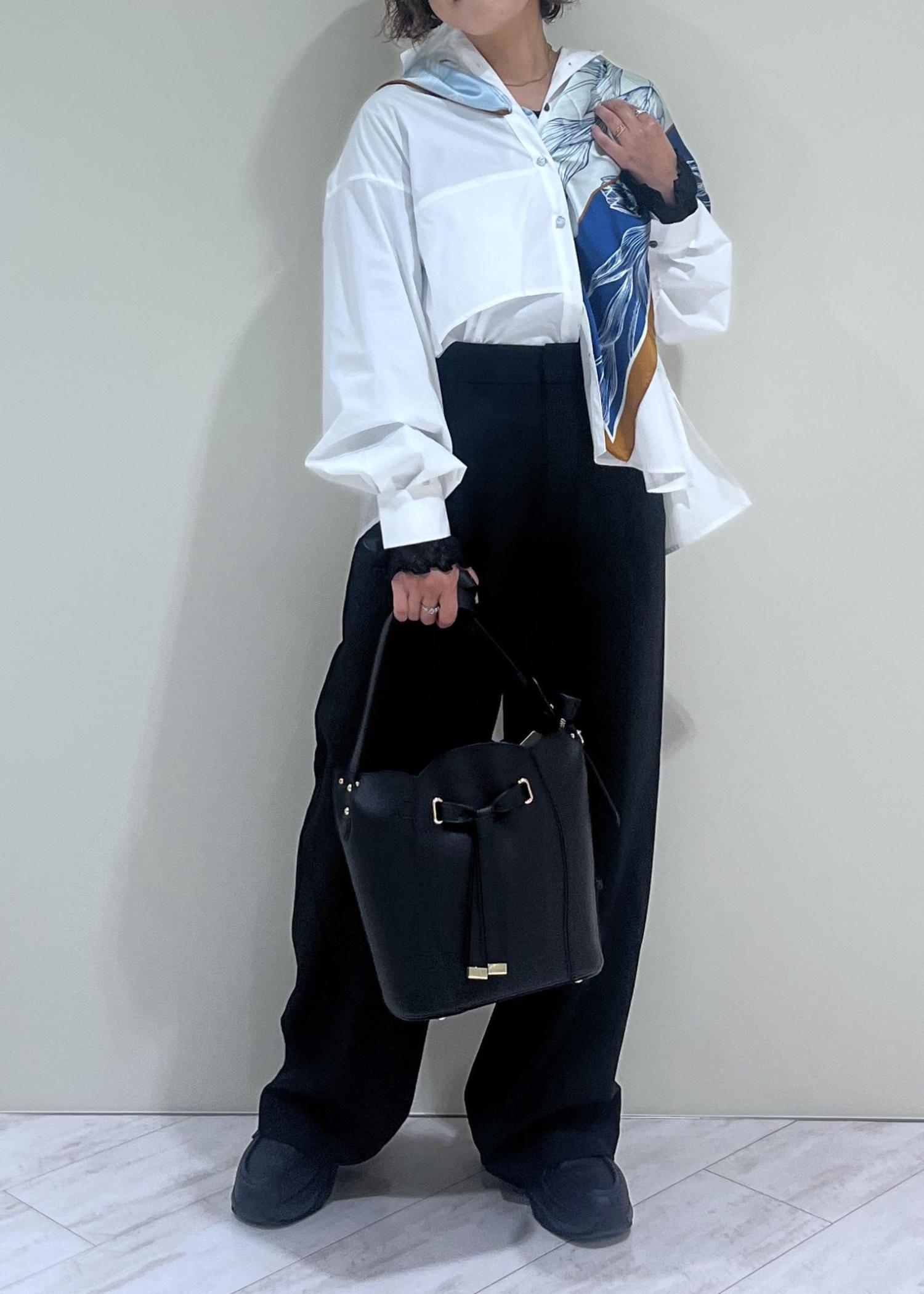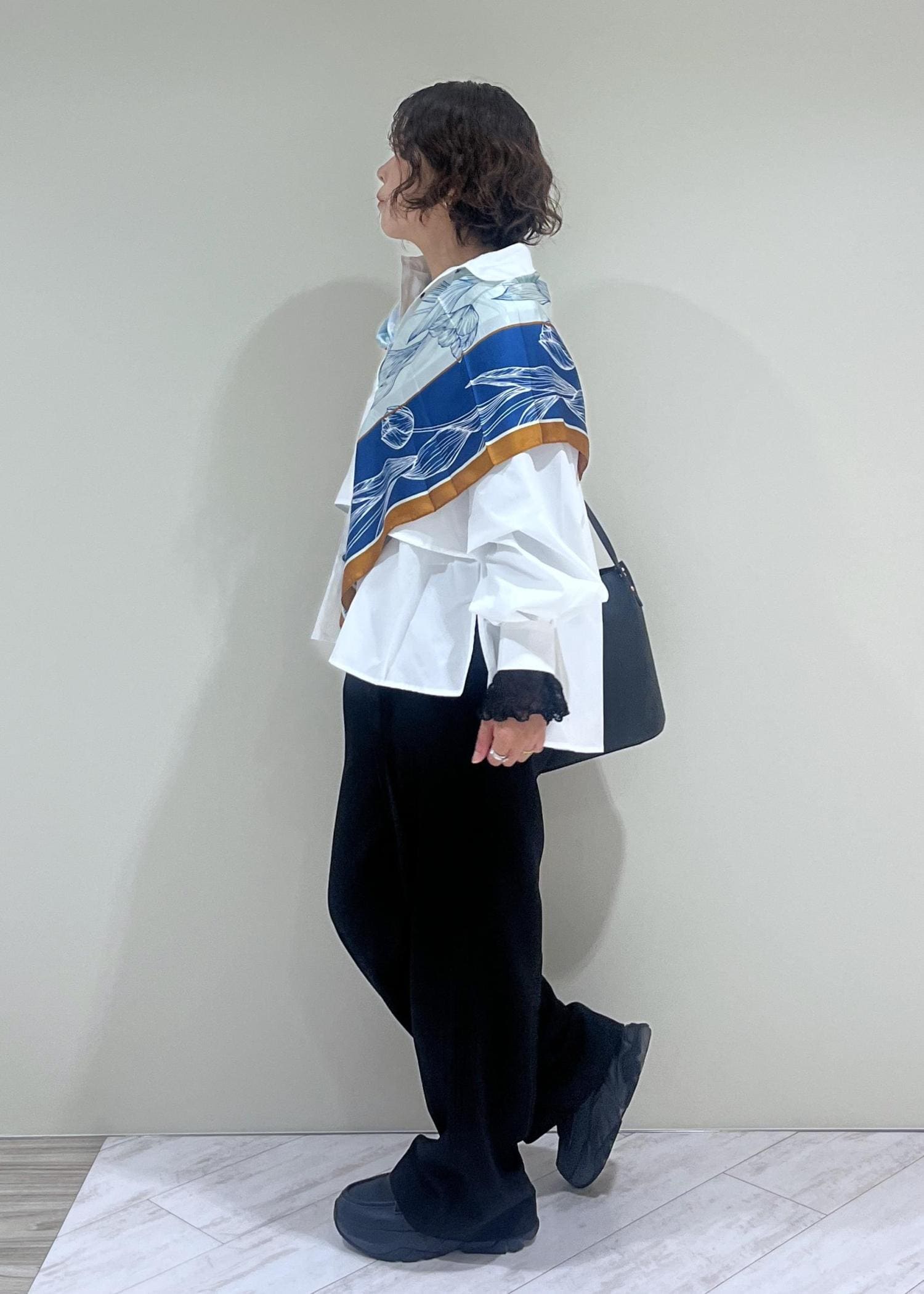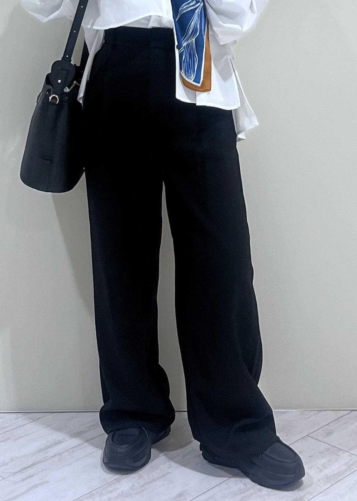 素足だと床に少し付いてしまいます。少しヒールのある靴やスニーカーだと安心ですし、脚のラインもきれいに見えます。 -