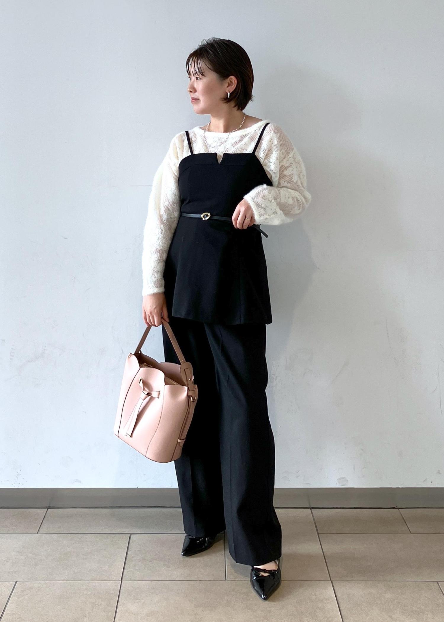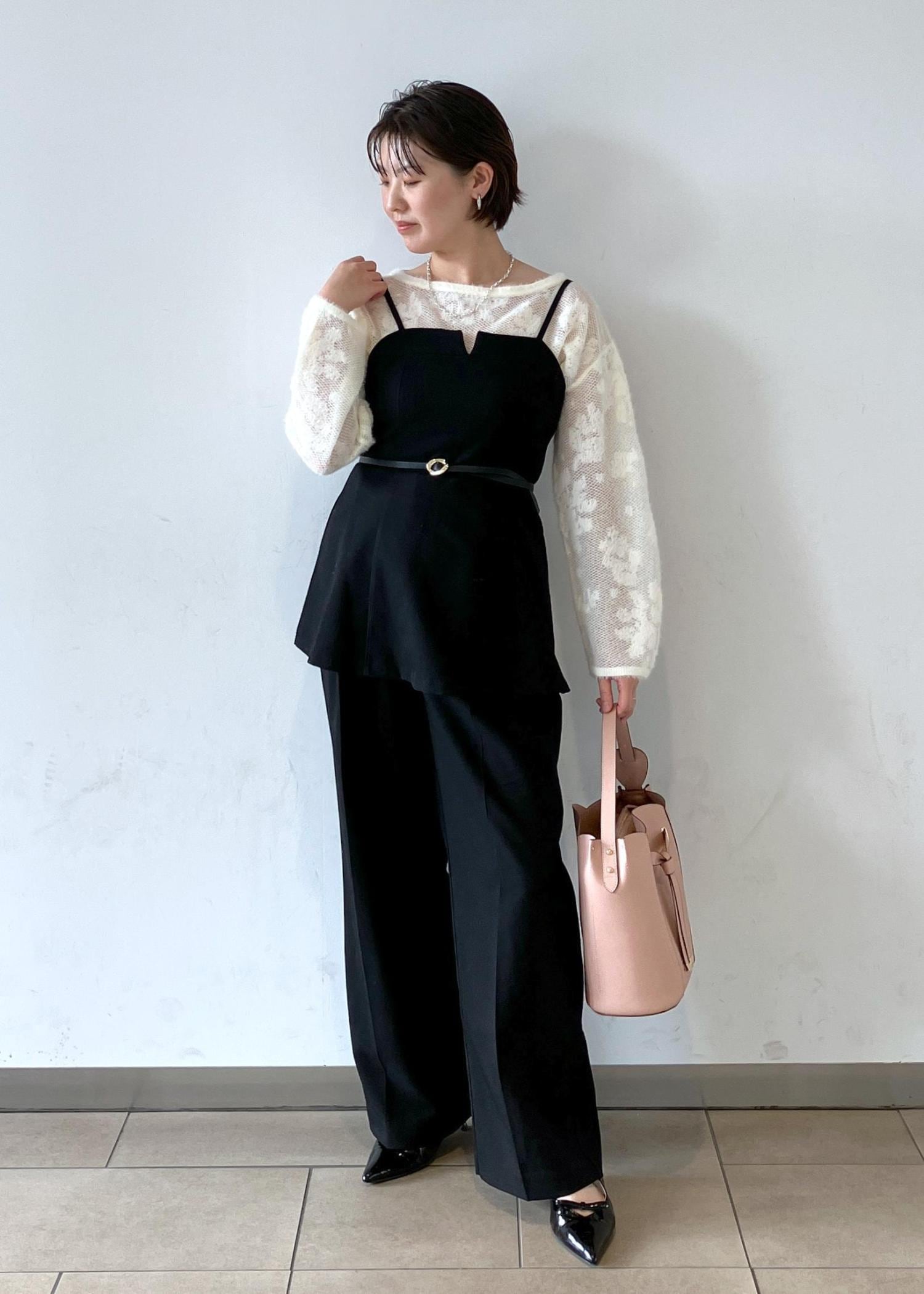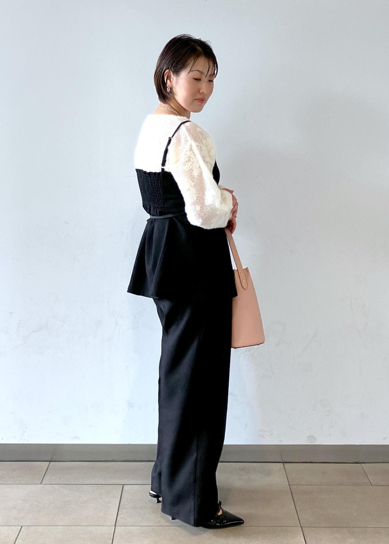 ビスチェとワイドパンツが黒なので白のシアーニットを合わせて透け感をプラスすることで全体が重い印象にならないように意識しました!モノトーンコーディネートに新作のフラワーカットバッグのピンクを差し色に取り入れ、シアーニットも相まって女性らしく柔らかな印象も意識してみました!