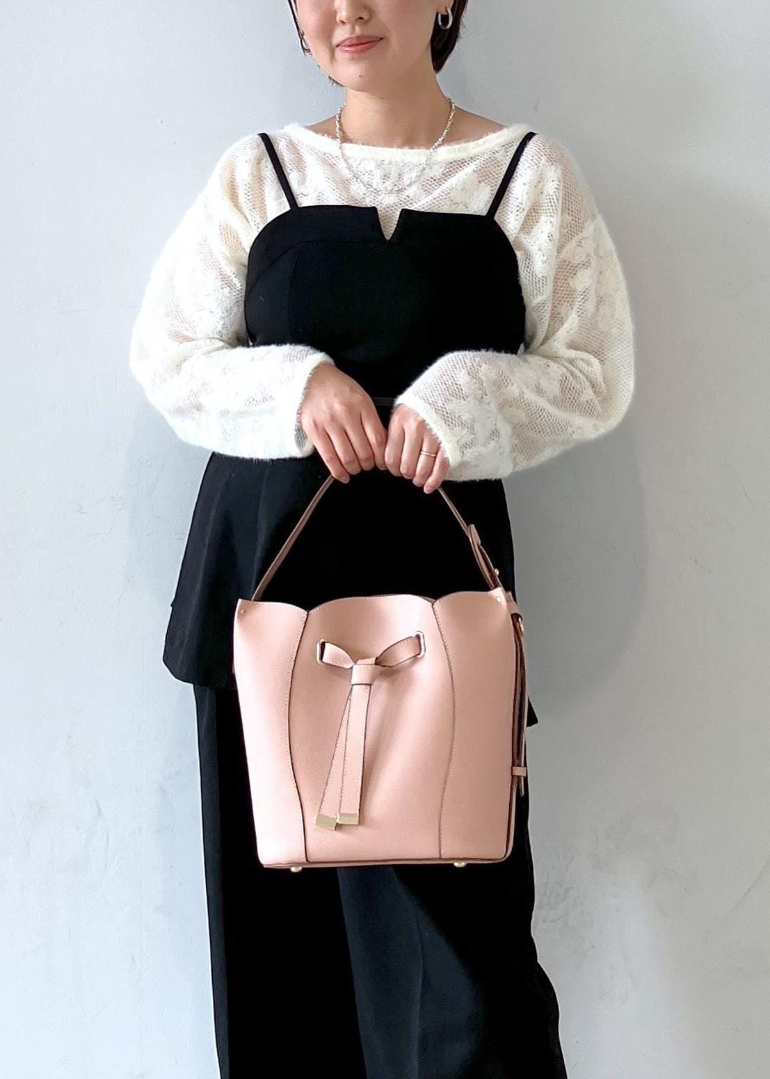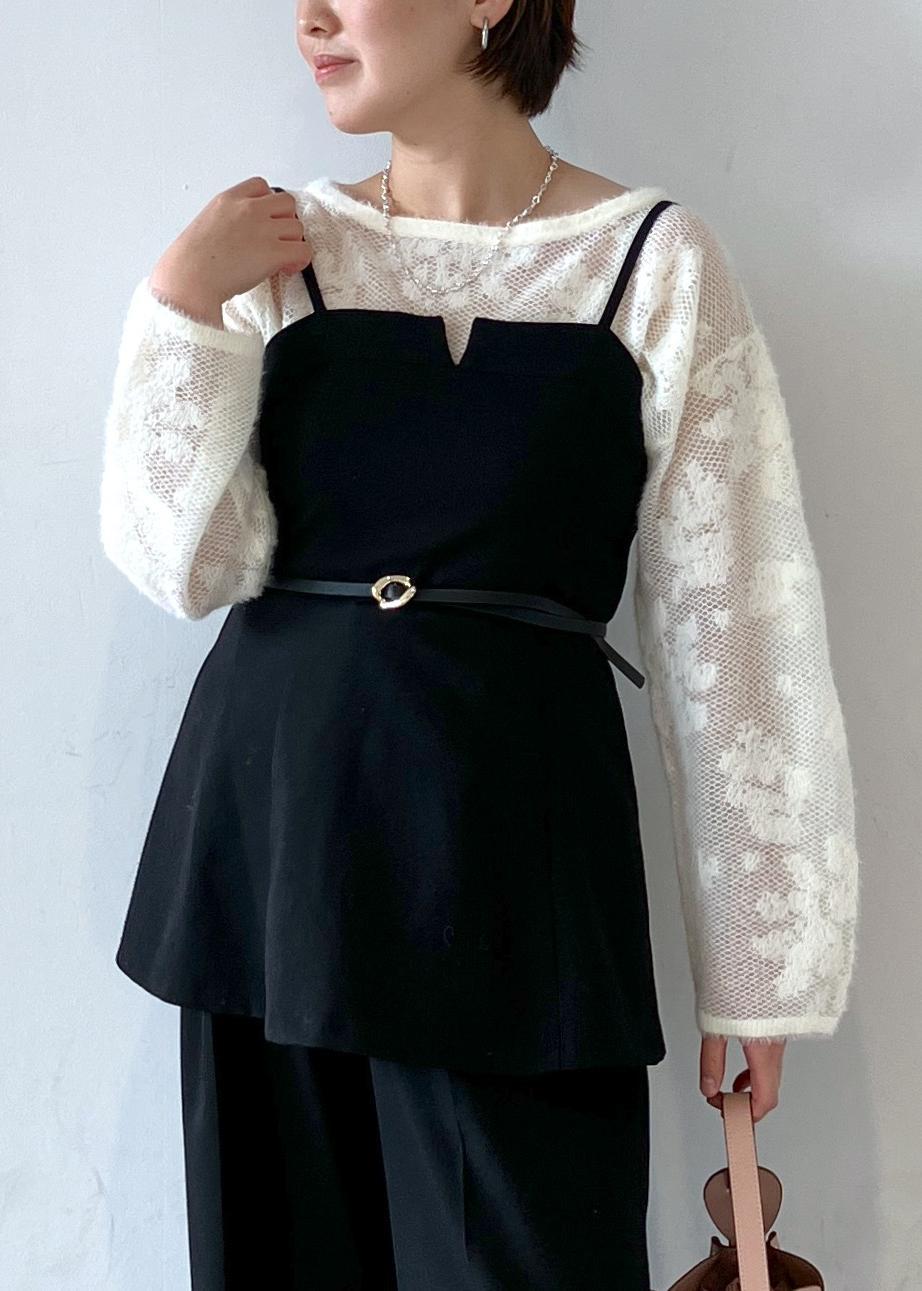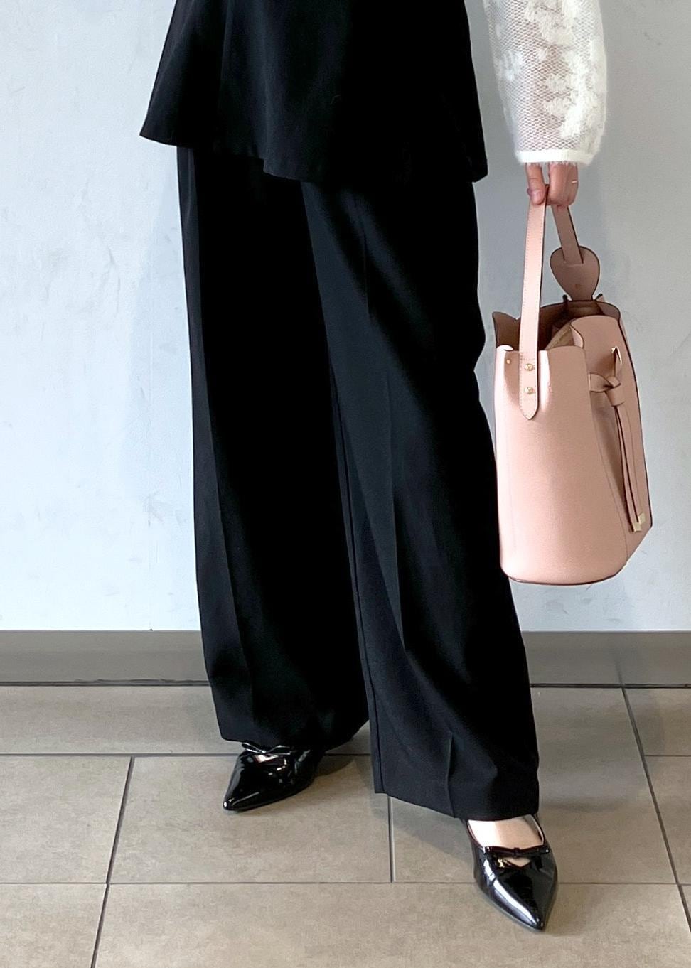 ビスチェとワイドパンツが黒なので白のシアーニットを合わせて透け感をプラスすることで全体が重い印象にならないように意識しました!モノトーンコーディネートに新作のフラワーカットバッグのピンクを差し色に取り入れ、シアーニットも相まって女性らしく柔らかな印象も意識してみました!