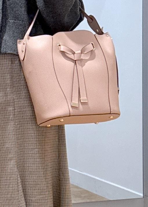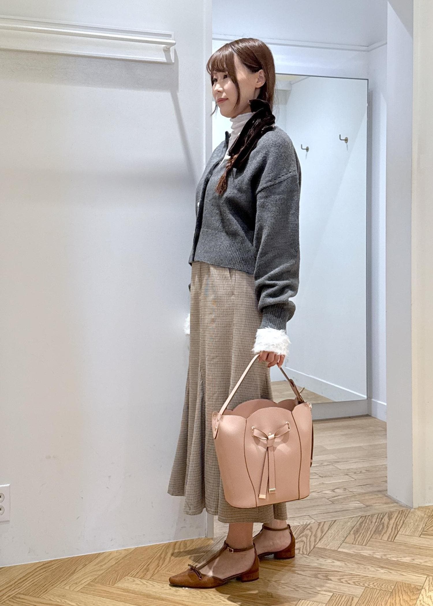 フェザー切り替えシアータートルニットでトレンド感をプラス。バックはピンクカラーで女性らしい雰囲気にしました。