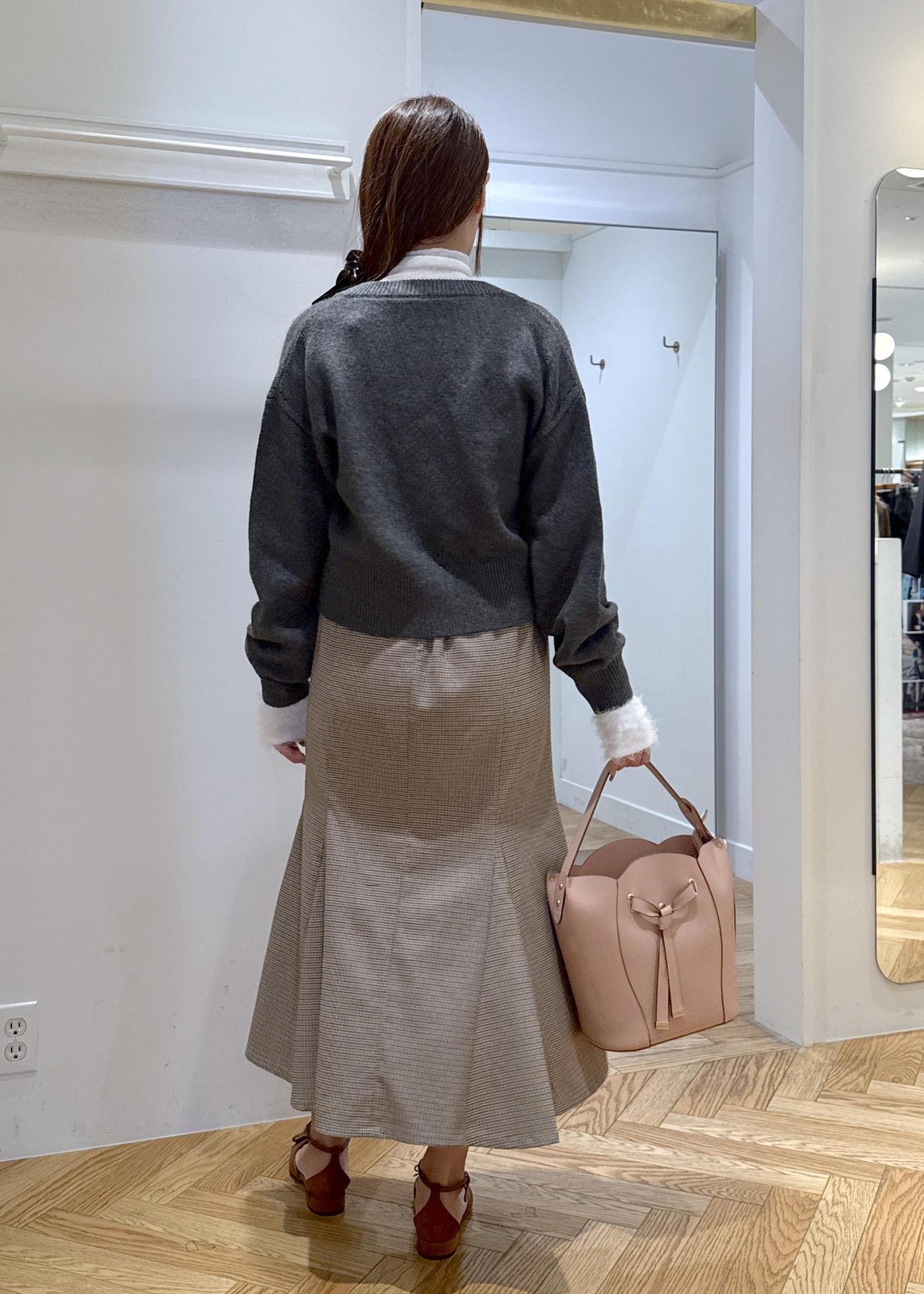 秋らしいチェックのマーメイドスカートにパールボタンがかわいいニットを合わせた大人カジュアルコーデです。
