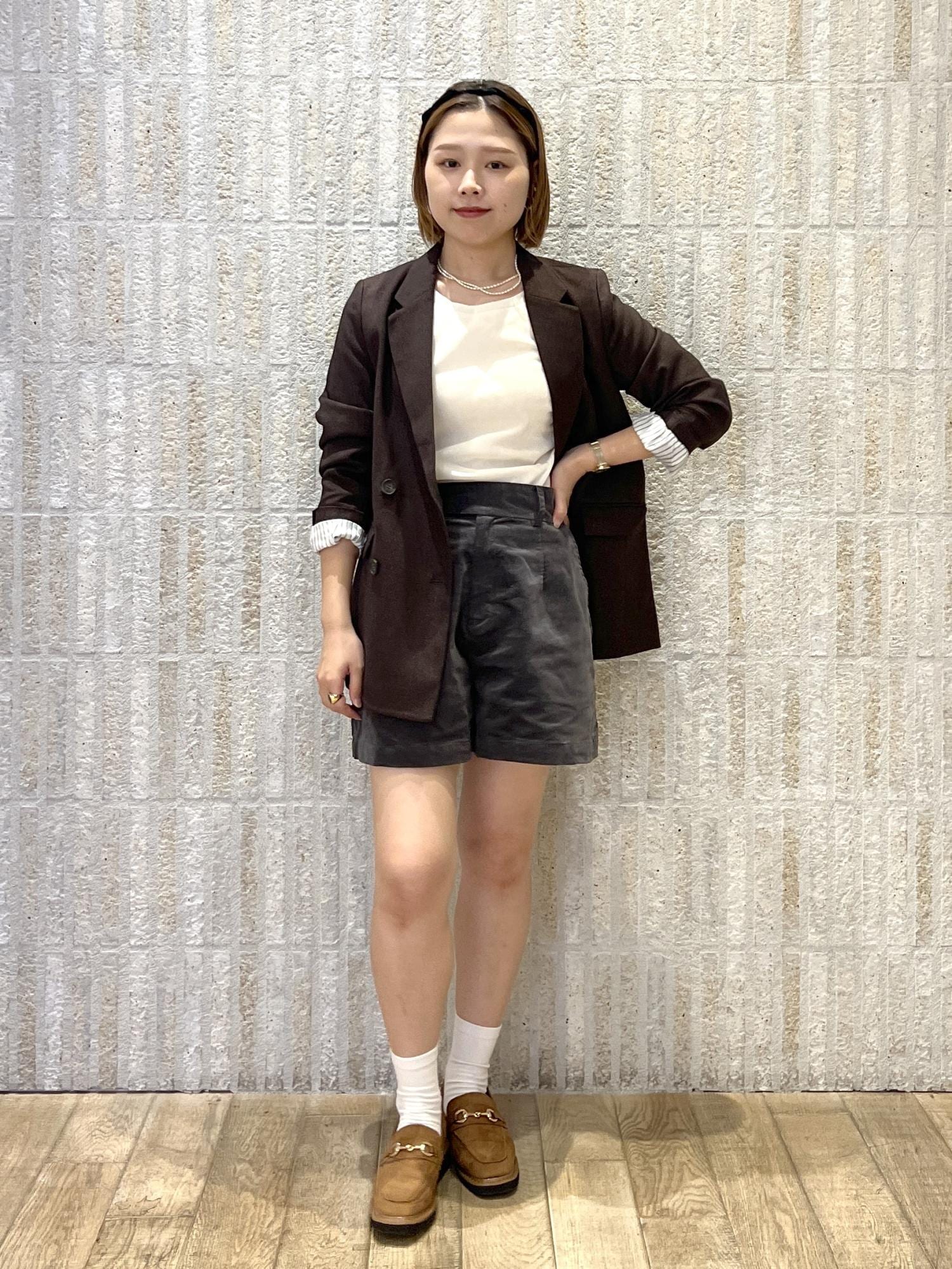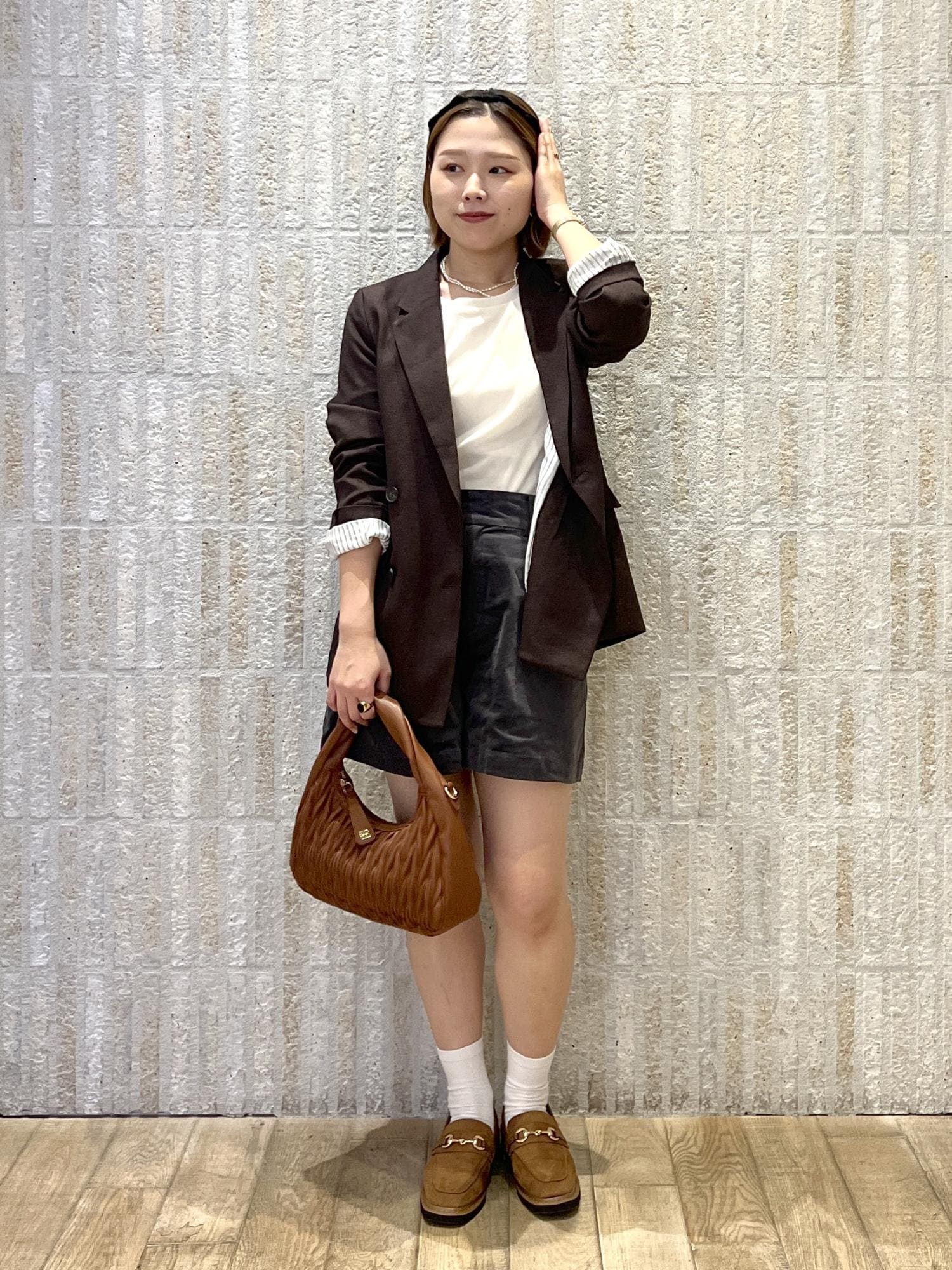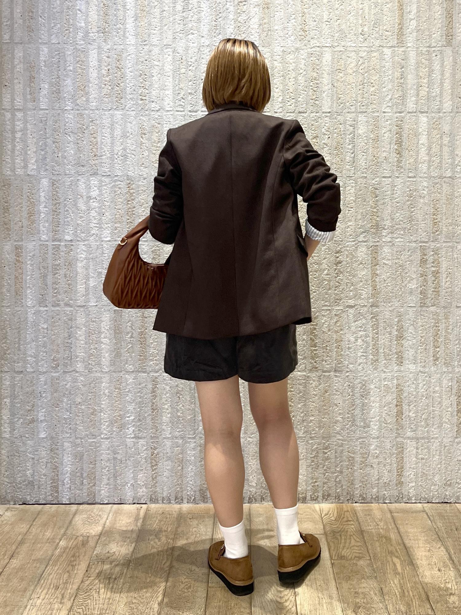 赤みのあるブラウンのジャケットで上品な大人な雰囲気を出しつつ、ショートパンツにローファーを合わせて可愛らしさもプラスしました。