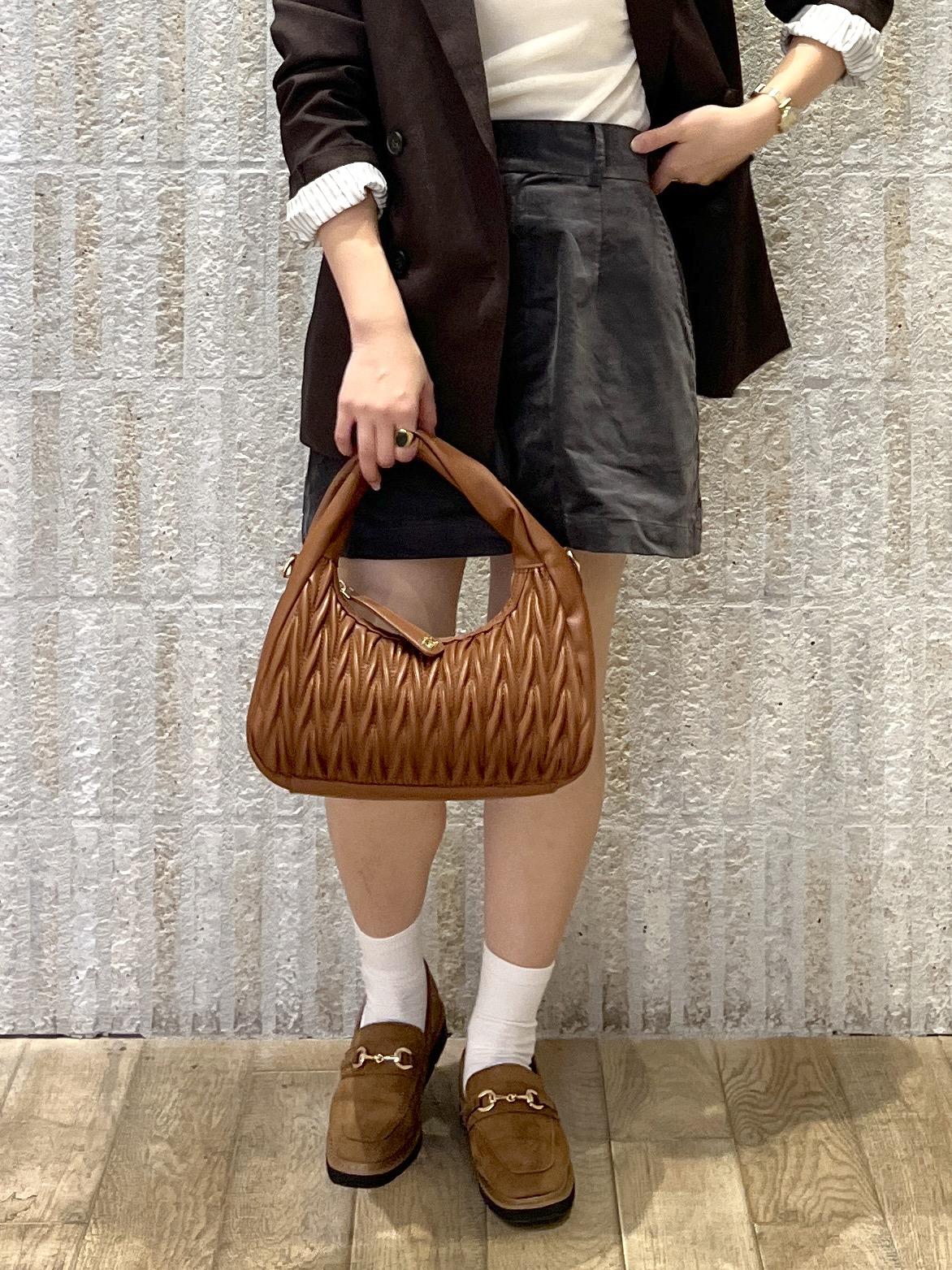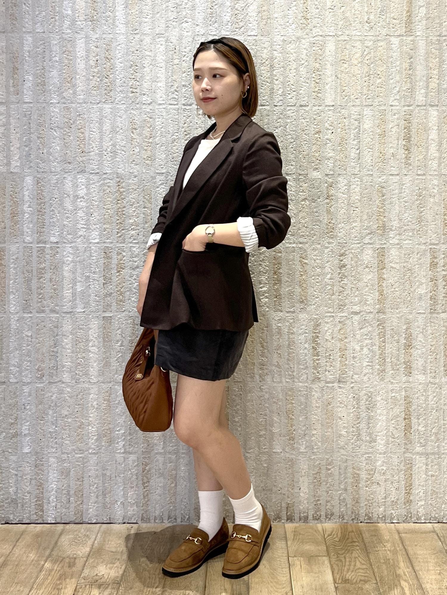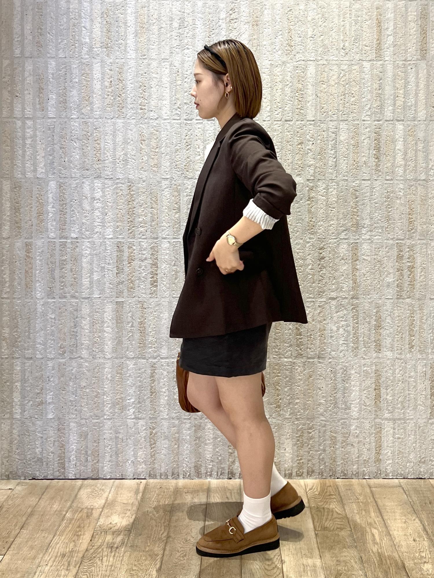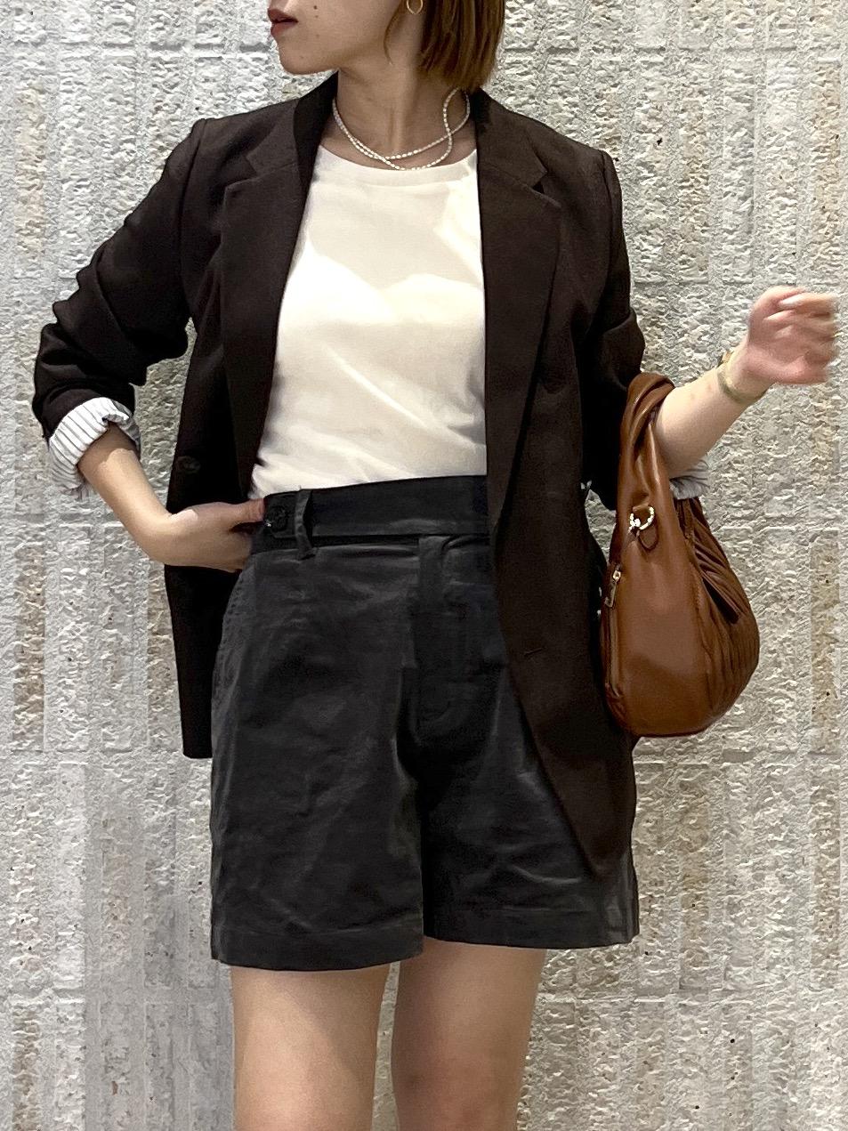 赤みのあるブラウンのジャケットで上品な大人な雰囲気を出しつつ、ショートパンツにローファーを合わせて可愛らしさもプラスしました。