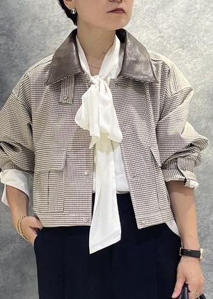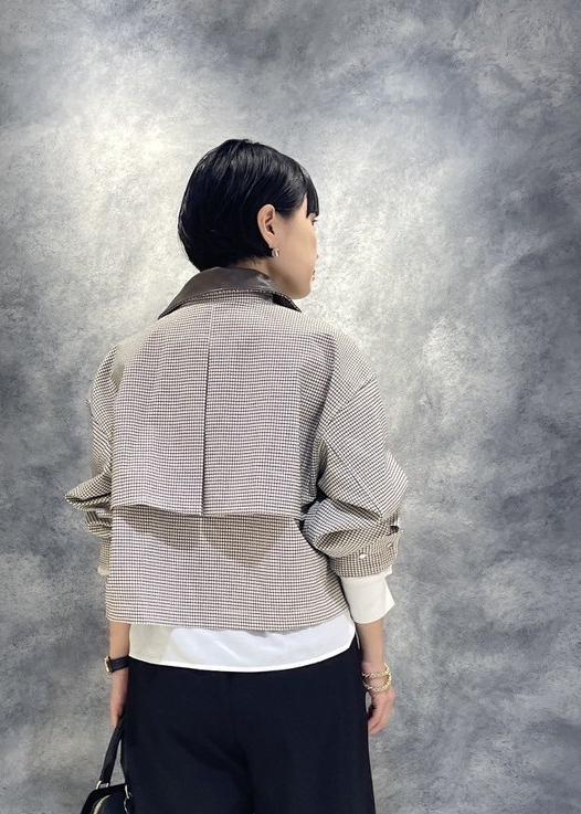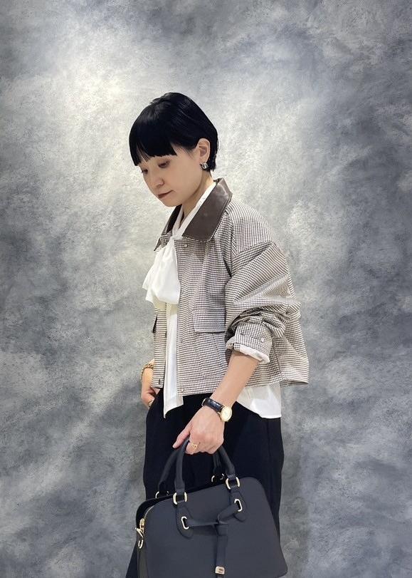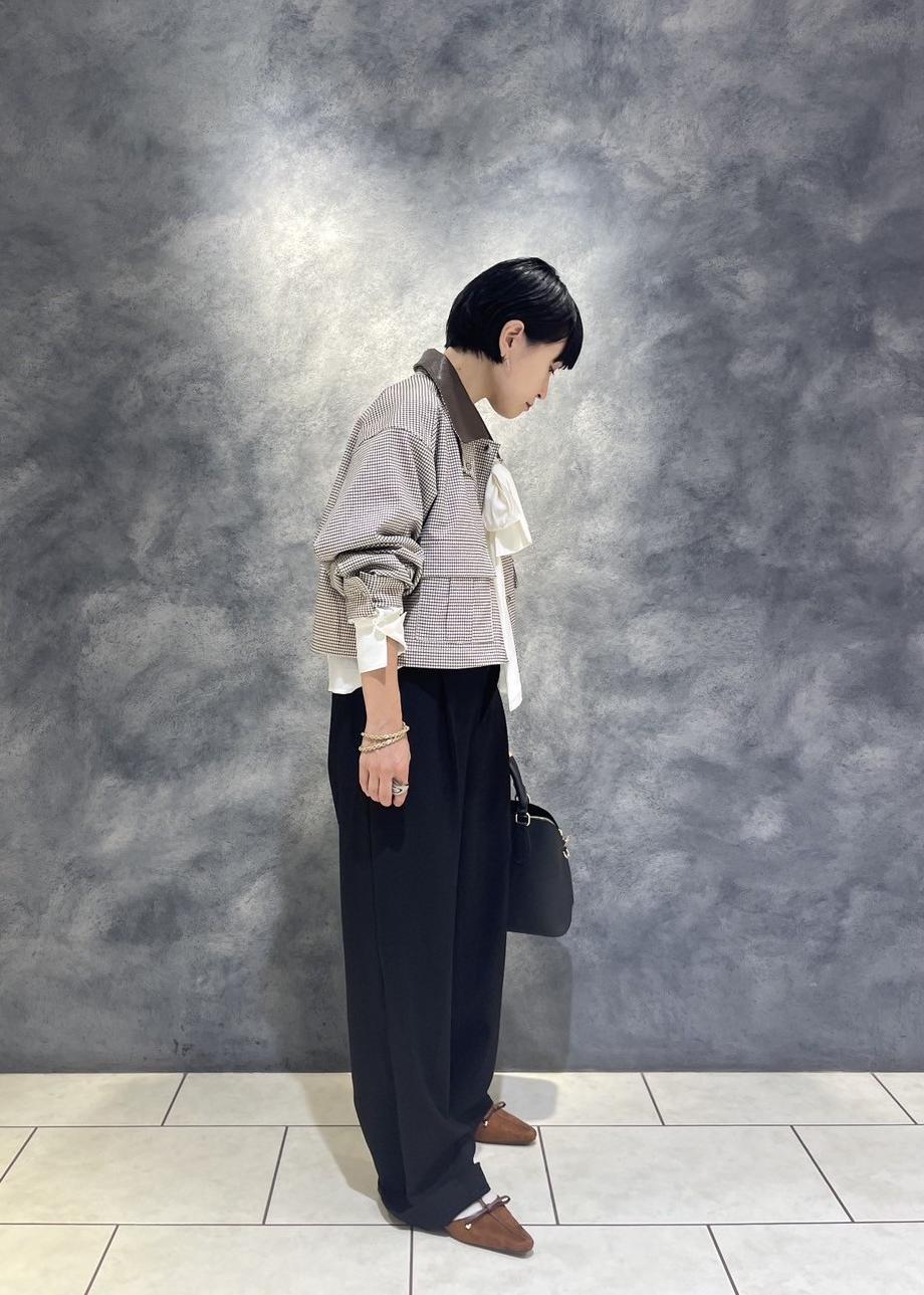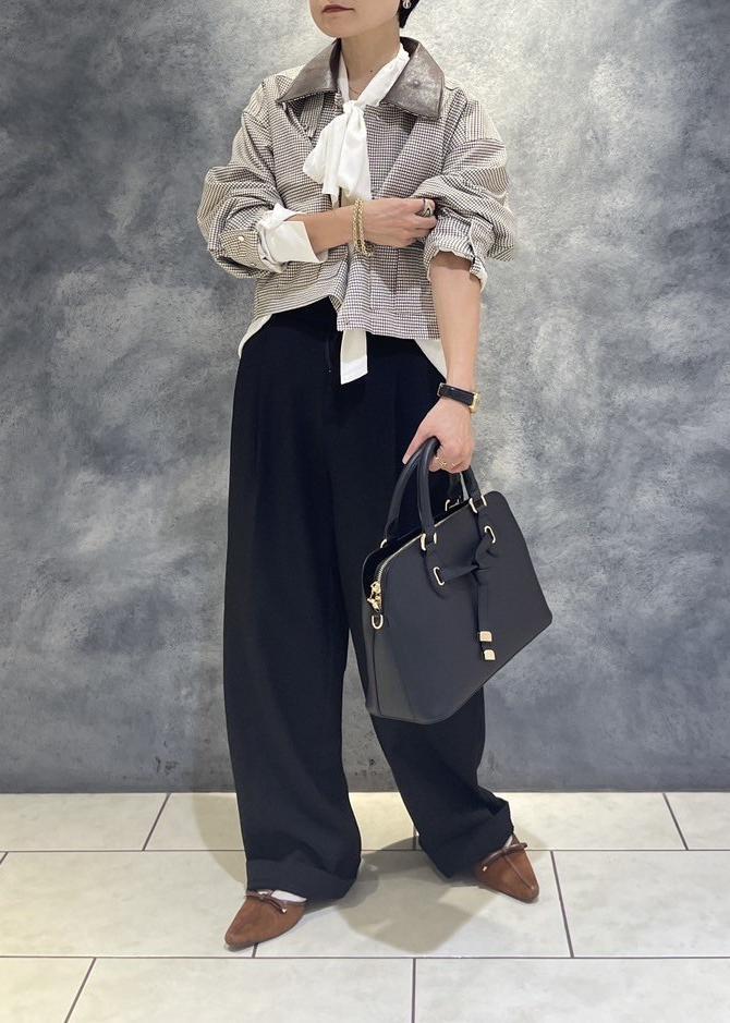 ベーシックなパンツにトレンドのチェック柄のブルゾン×ボウタイリボンブラウスの合わせで