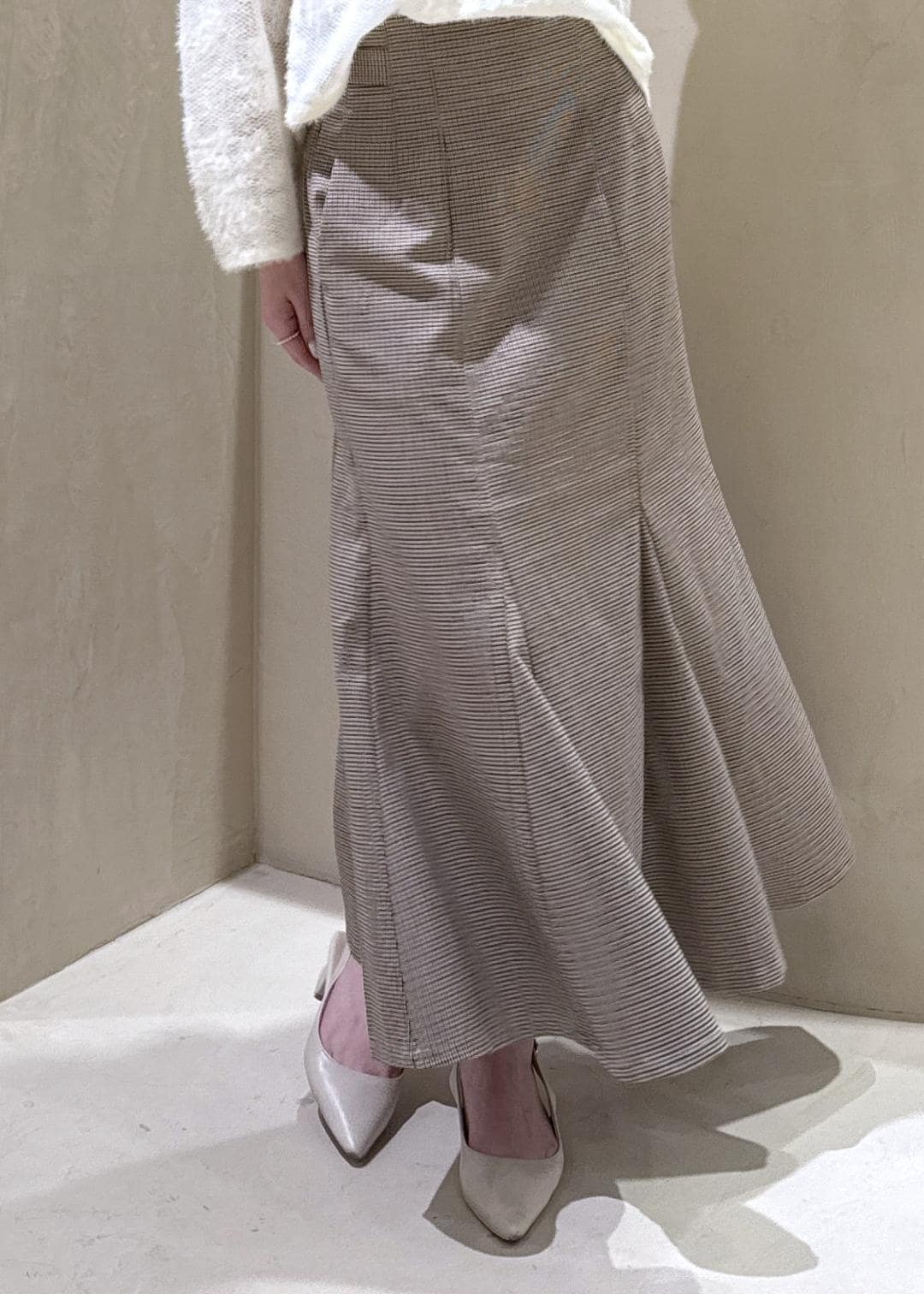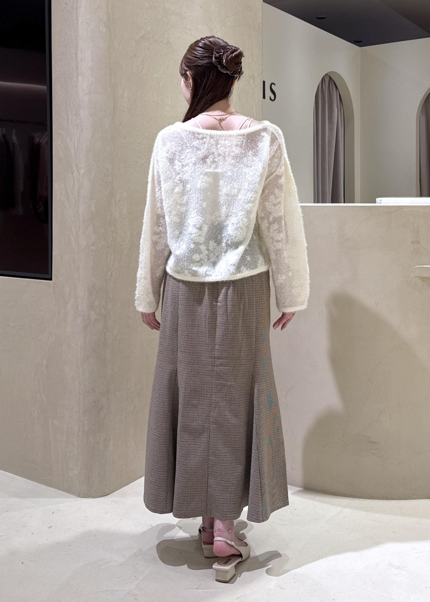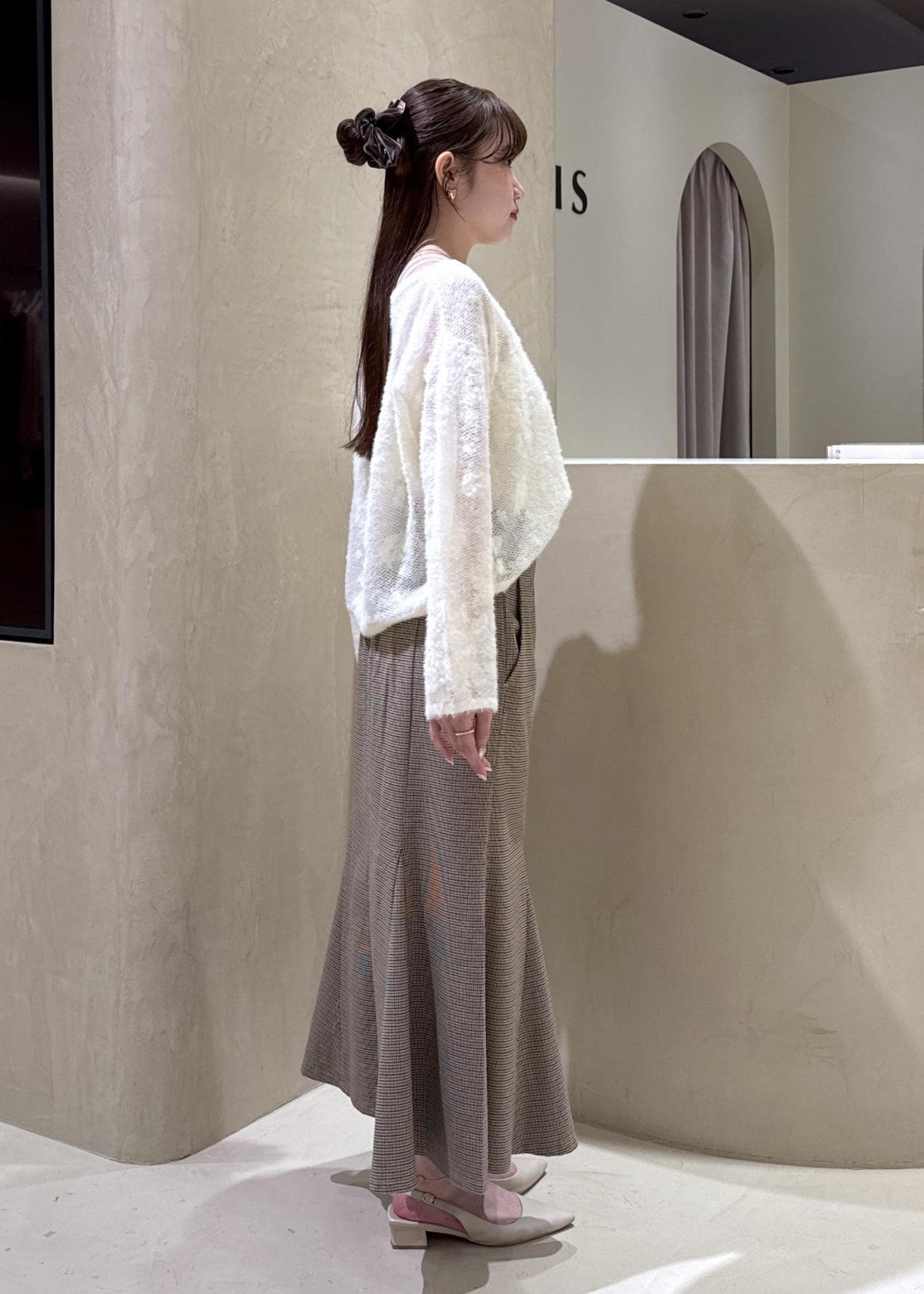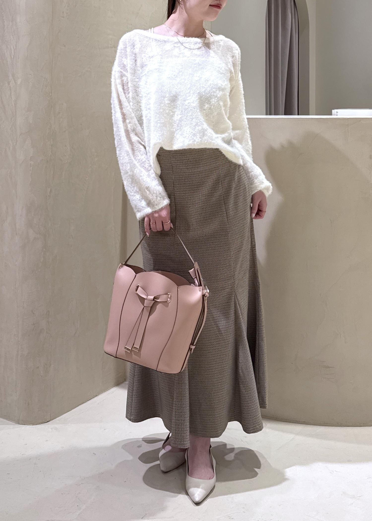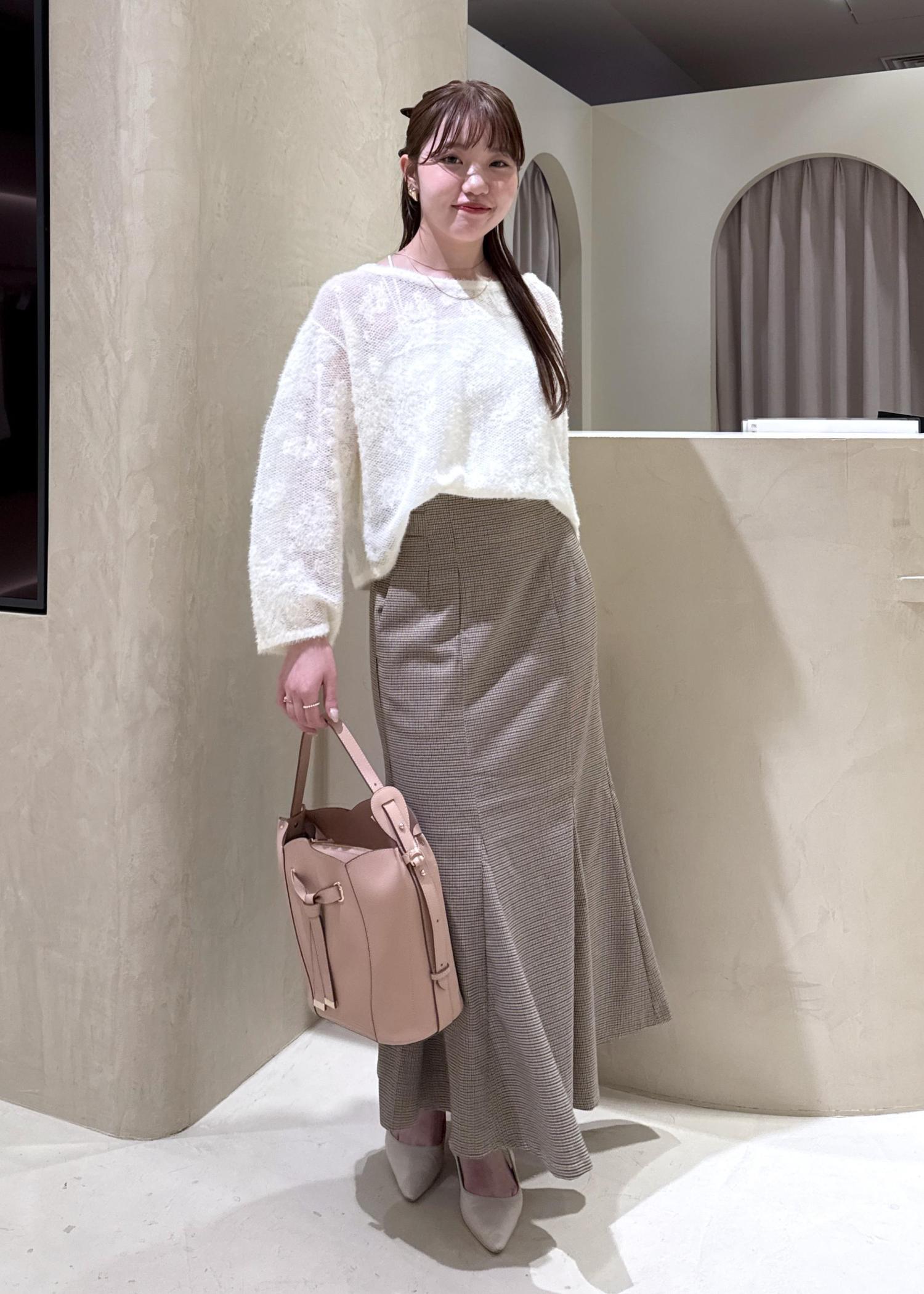 秋らしいチェック柄の"美ウーリッシュ"マーメイドスカートをメインに、フェザーニットトップスを合わせ、柔らかい印象に。