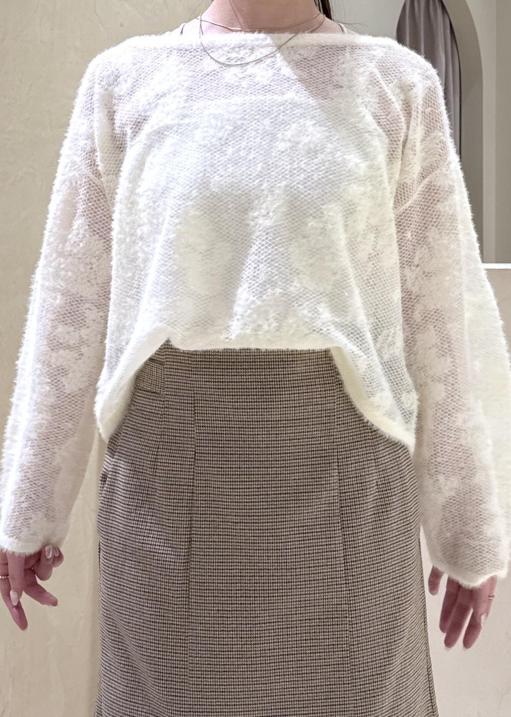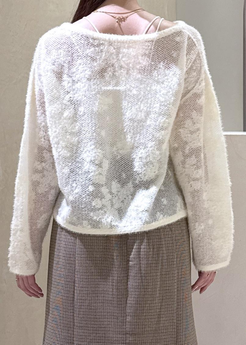 VISフラワーモチーフフェザーシアーニットオフホワイト / F¥3,842レビュー程良い透け感あるフェザーニットなので、1枚で華やかな柔らかい印象に◎