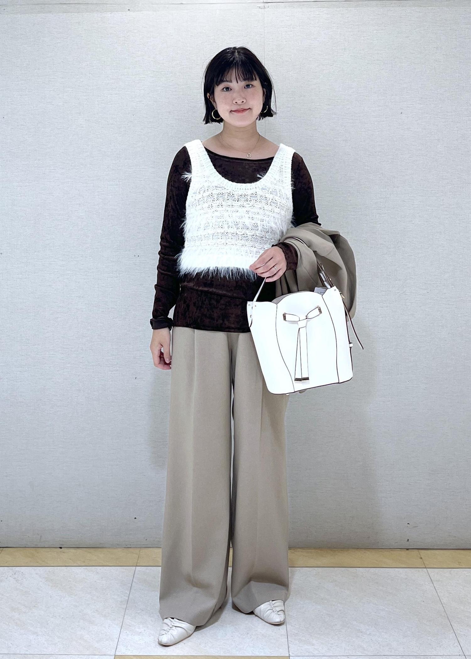 チャコールとアイボリーの2色でコーディネートによって雰囲気がとても変わります。