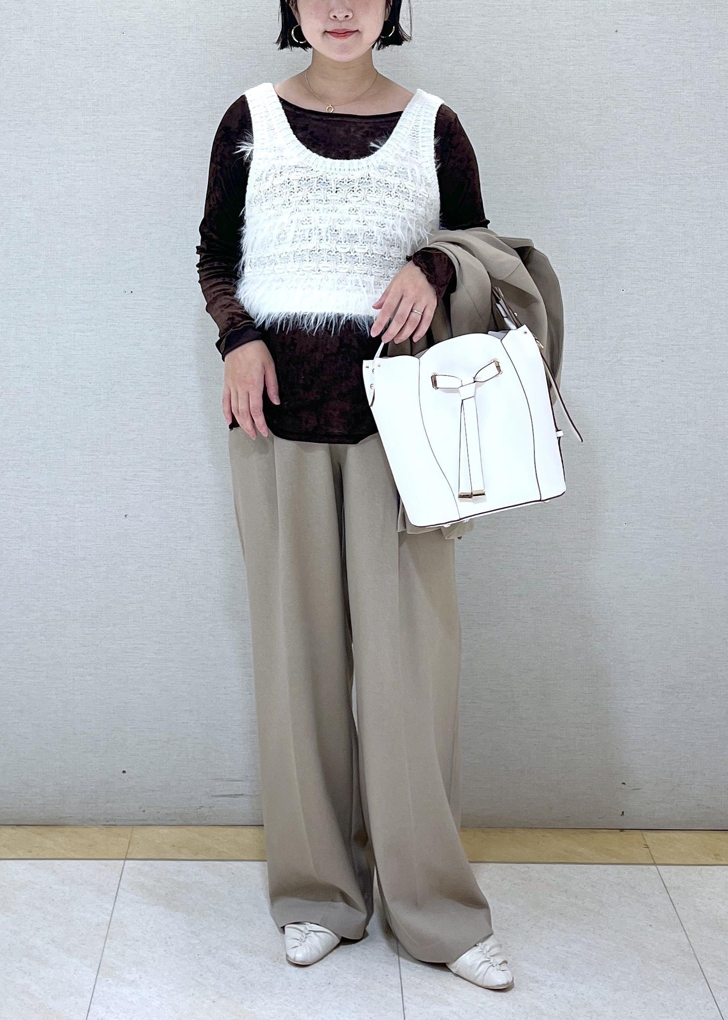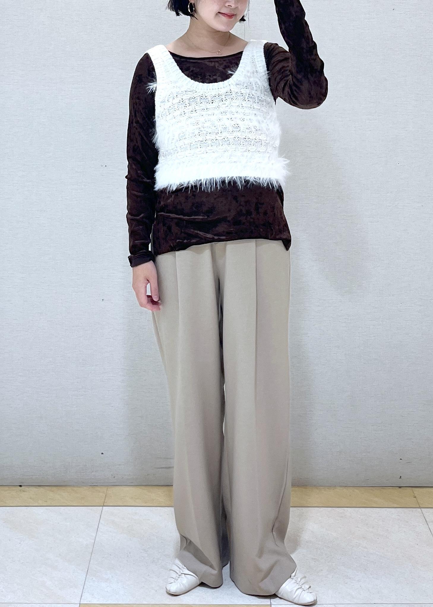 オススメの着方は、シアーの長袖のインナーにベストを合わせて異素材ミックスにすることでコーディネートにもメリハリがつきます。