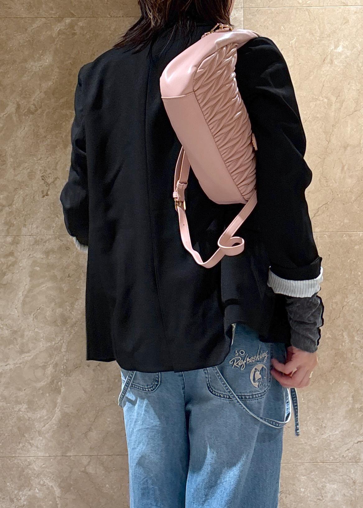 ワンショルダーで肩掛けにしてスッキリ持つことも、長いショルダーを付けてたすき掛けで使うことも出来て便利✨ -