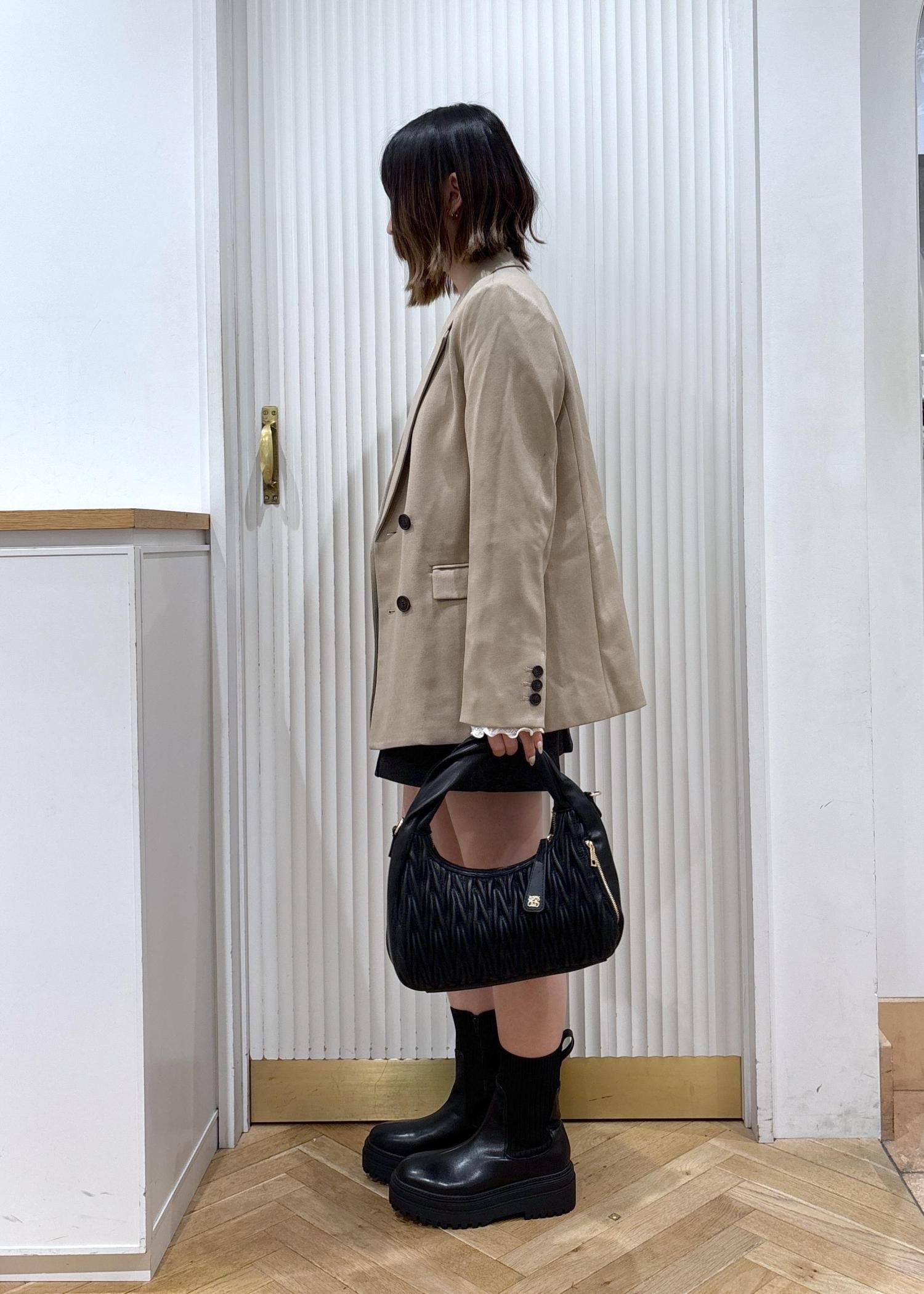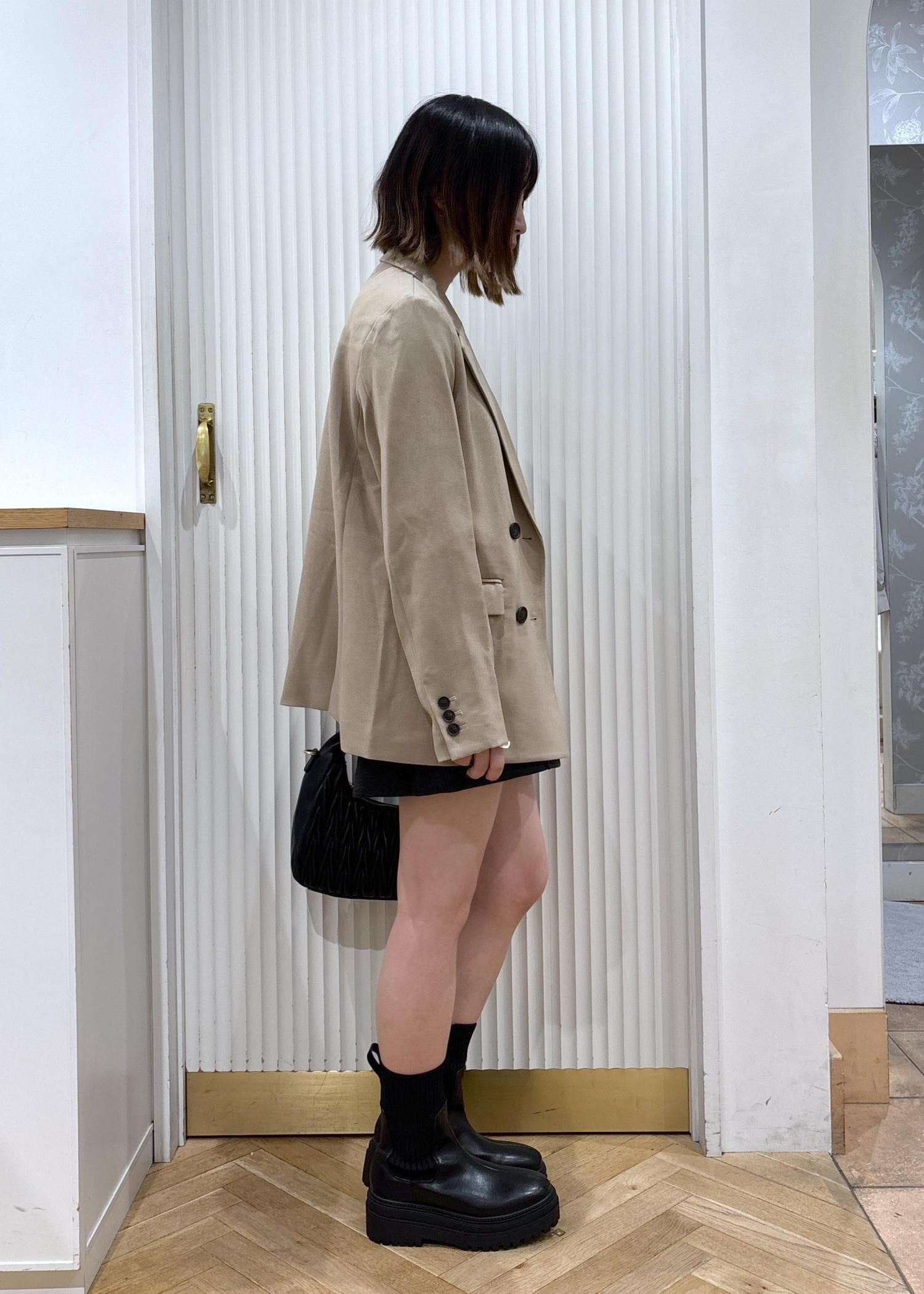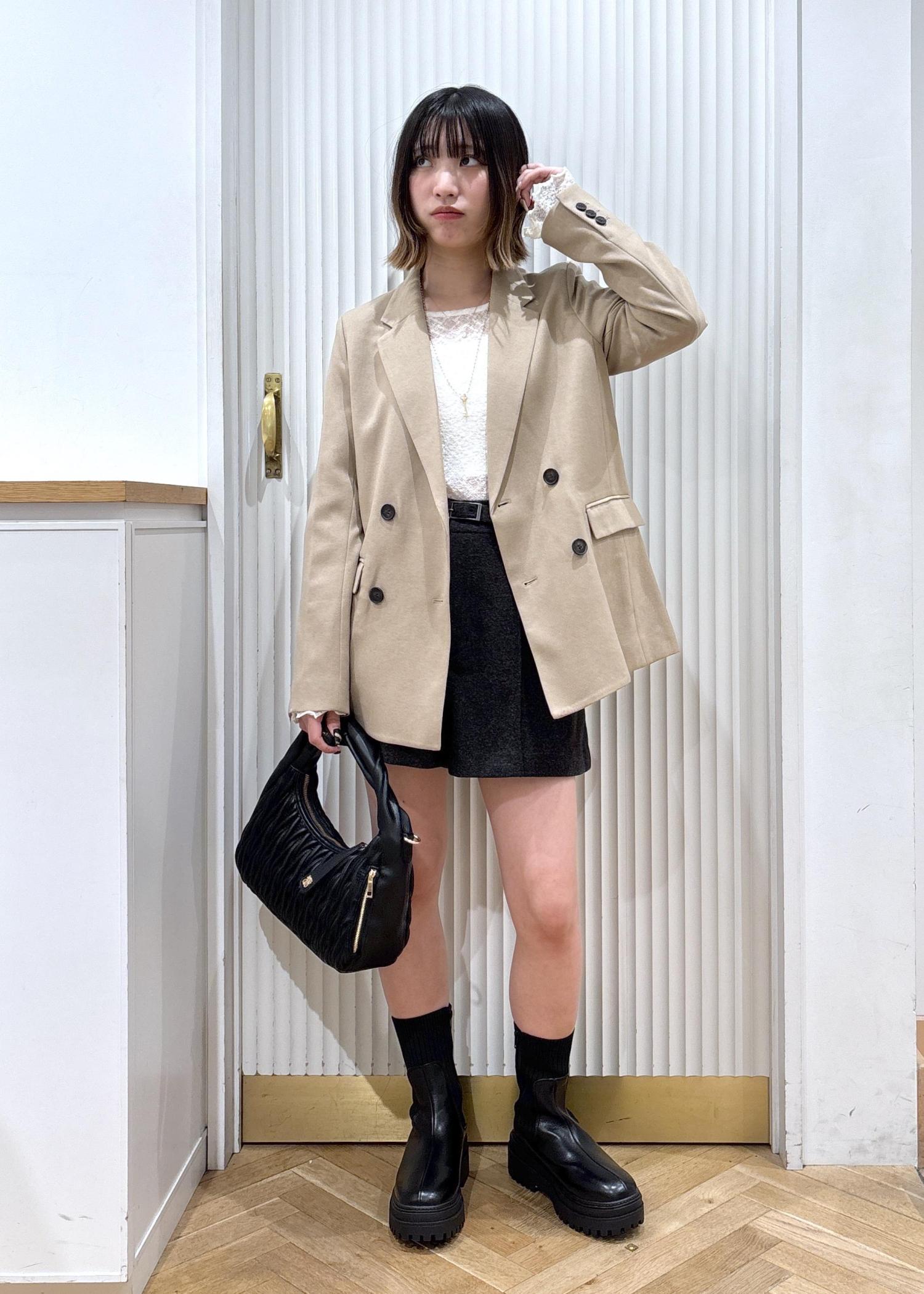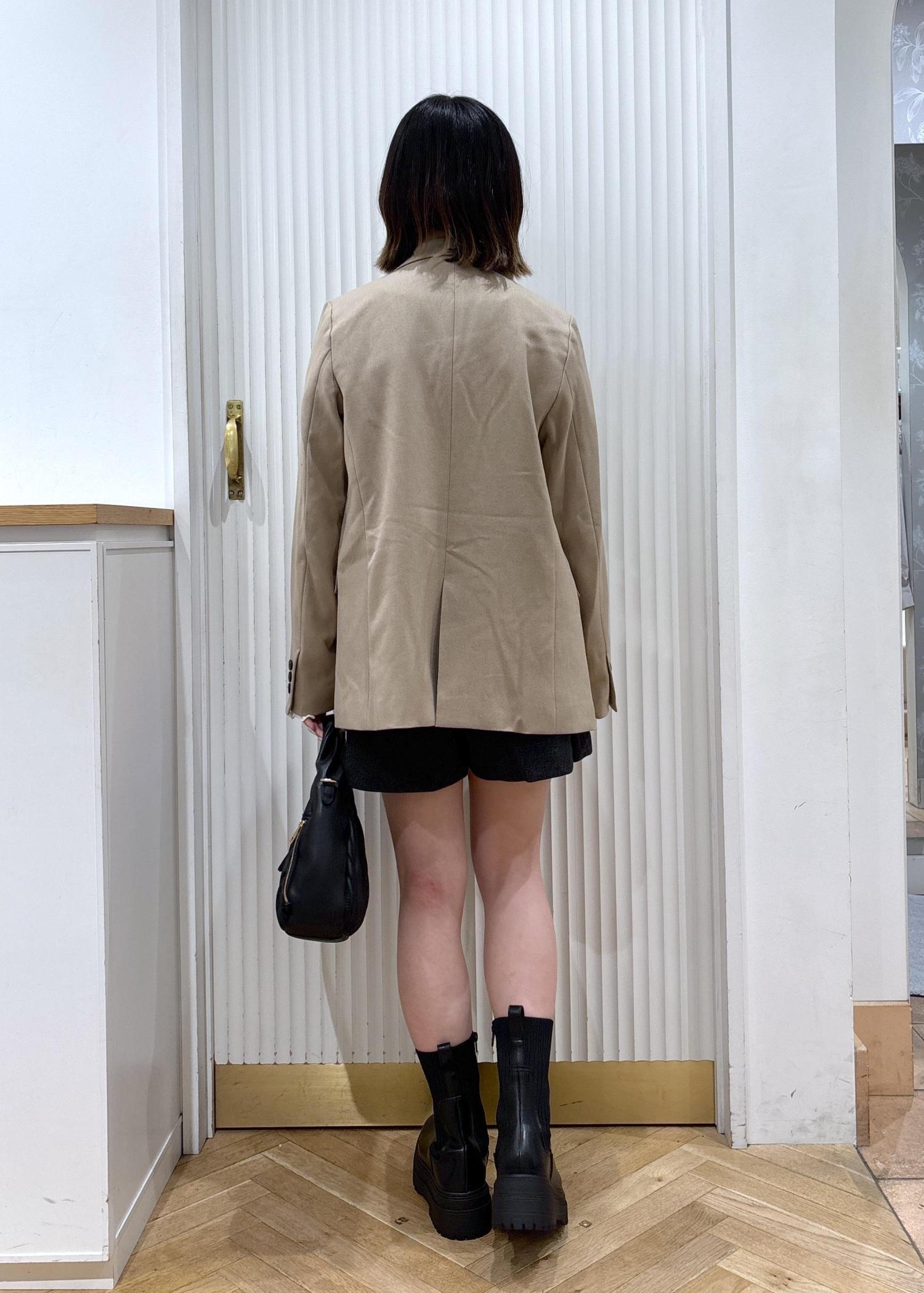 ジャケットにショートパンツを合わせたカジュアルコーデです。着丈長めのジャケットなのでチラッと見えるショートパンツが可愛いです!アイテムを黒にすることでコーディネートが締まって見えジャケットが明るい色味でも秋らしさが出ます。
