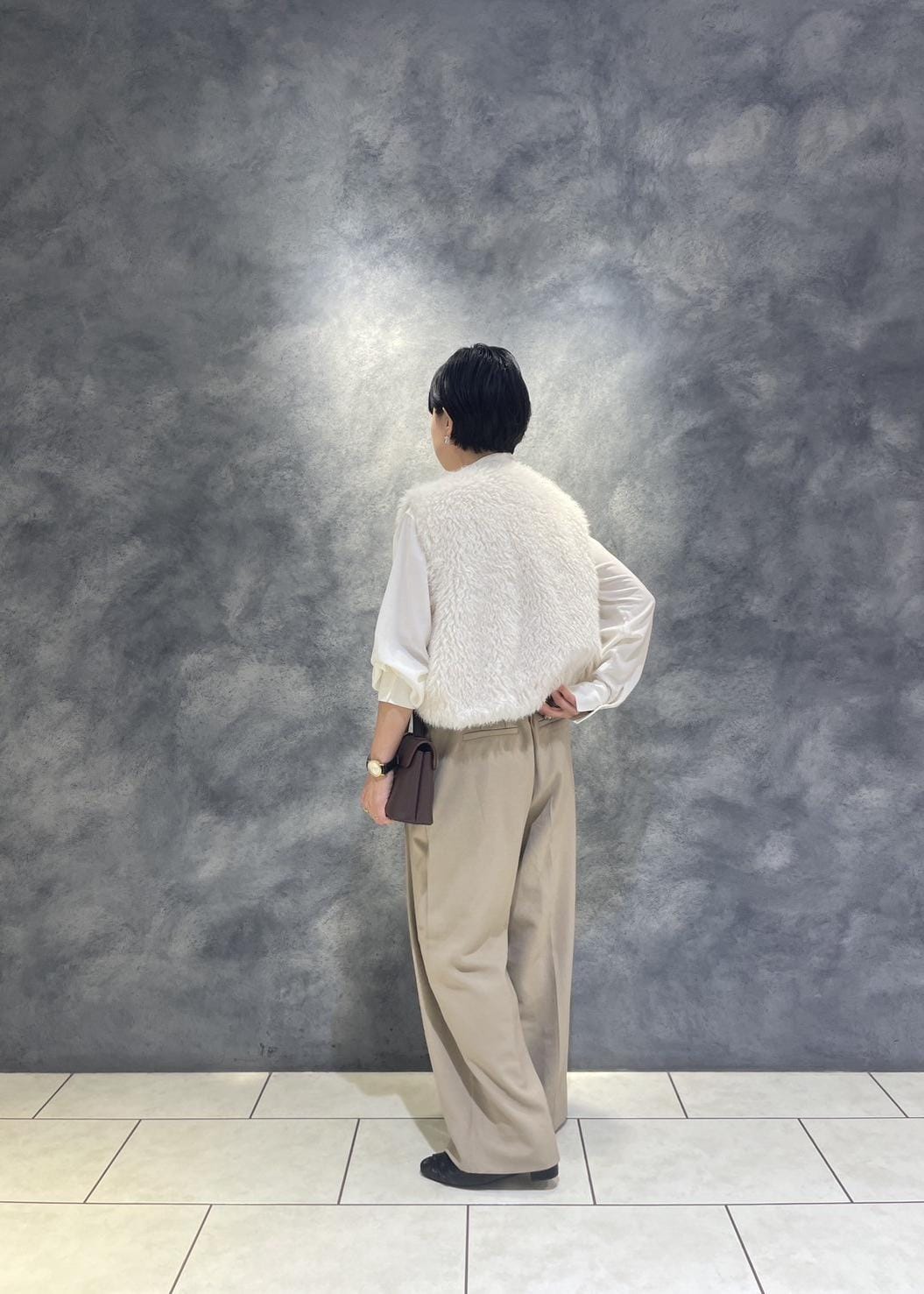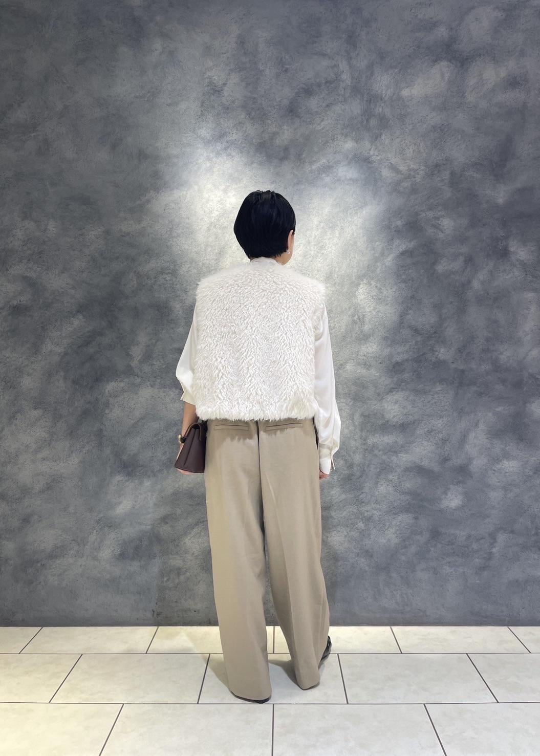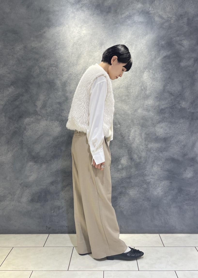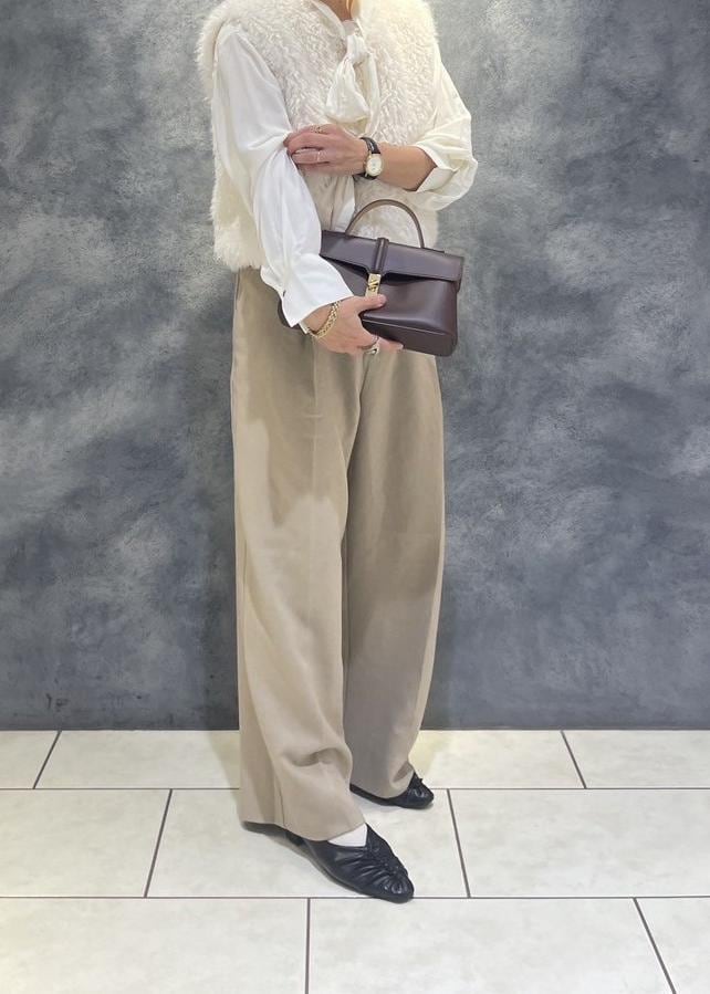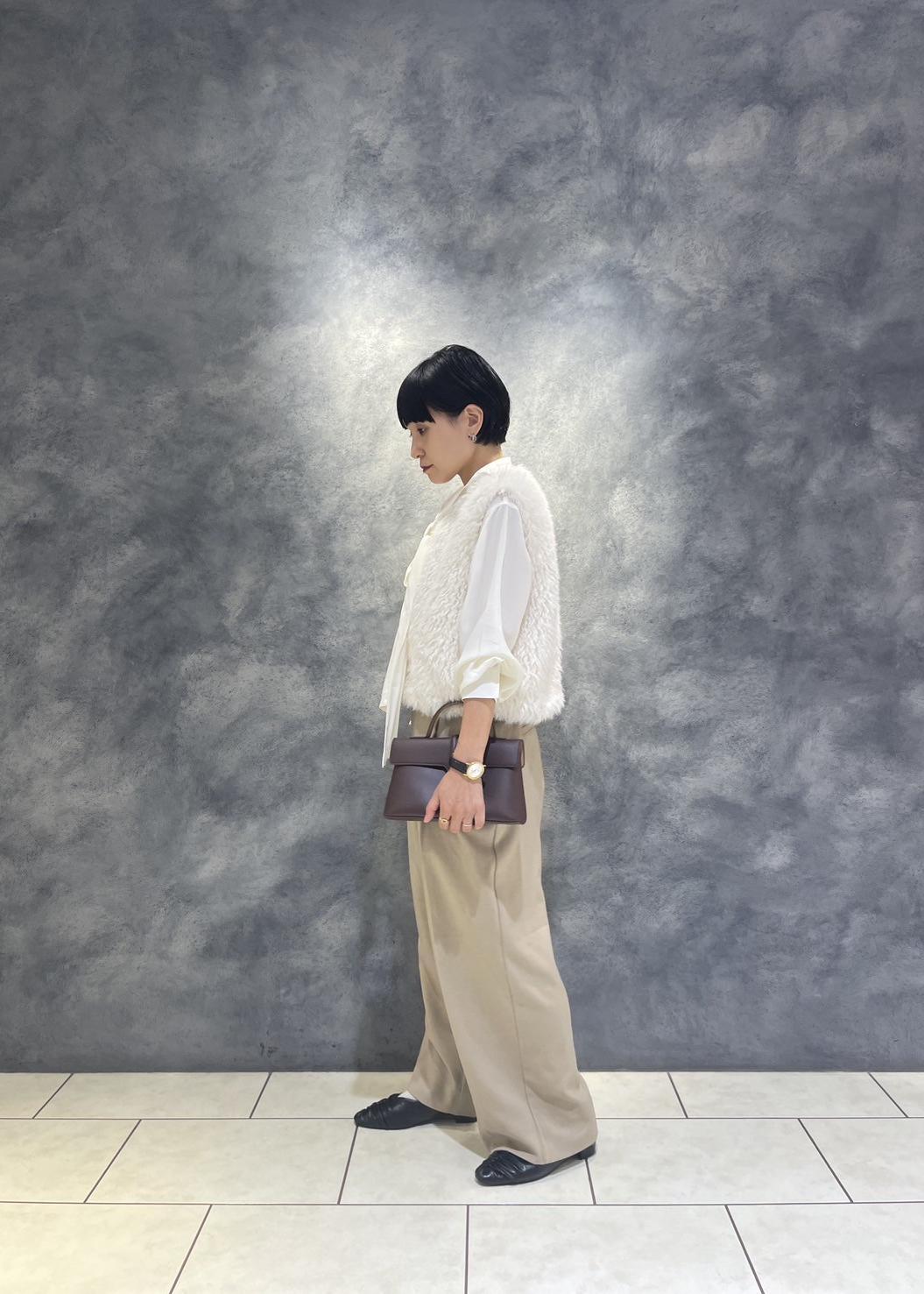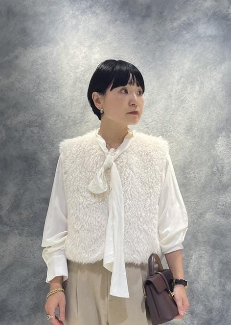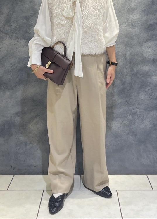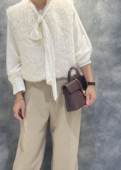柔らかなファーベストにはクラシカルなボウタイブラウス×キャメルのパンツ合わせで日常使いも◎なスタイリングに。