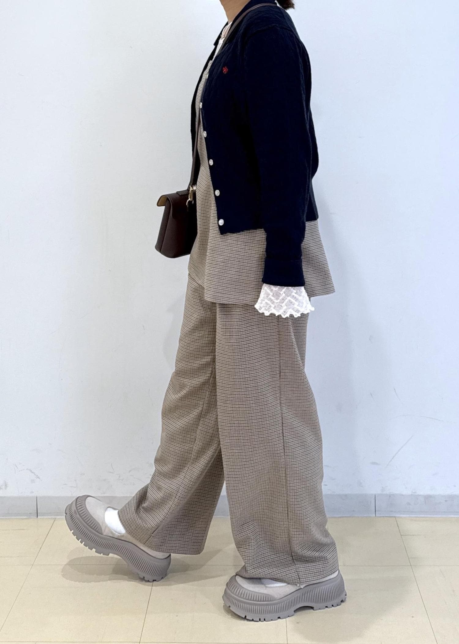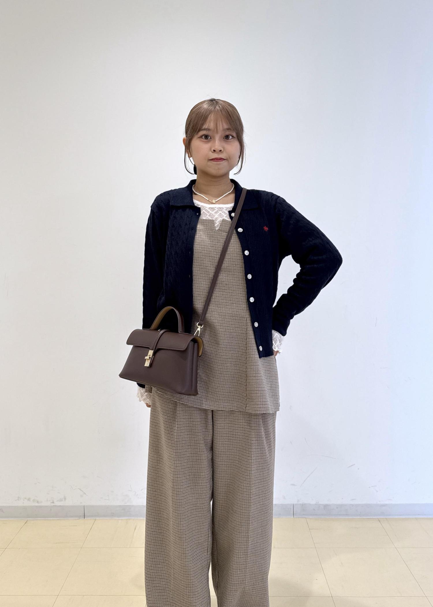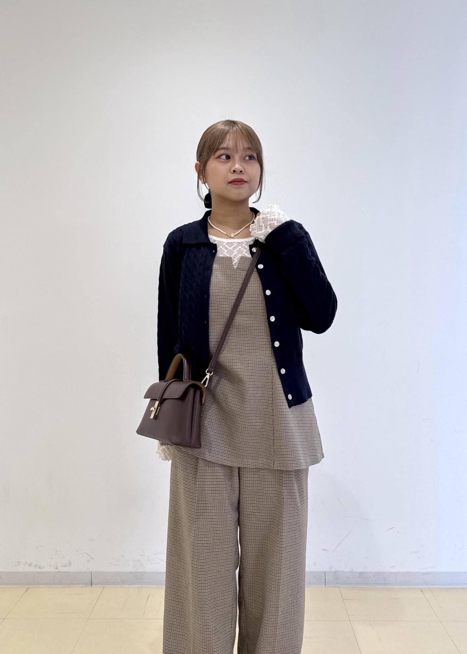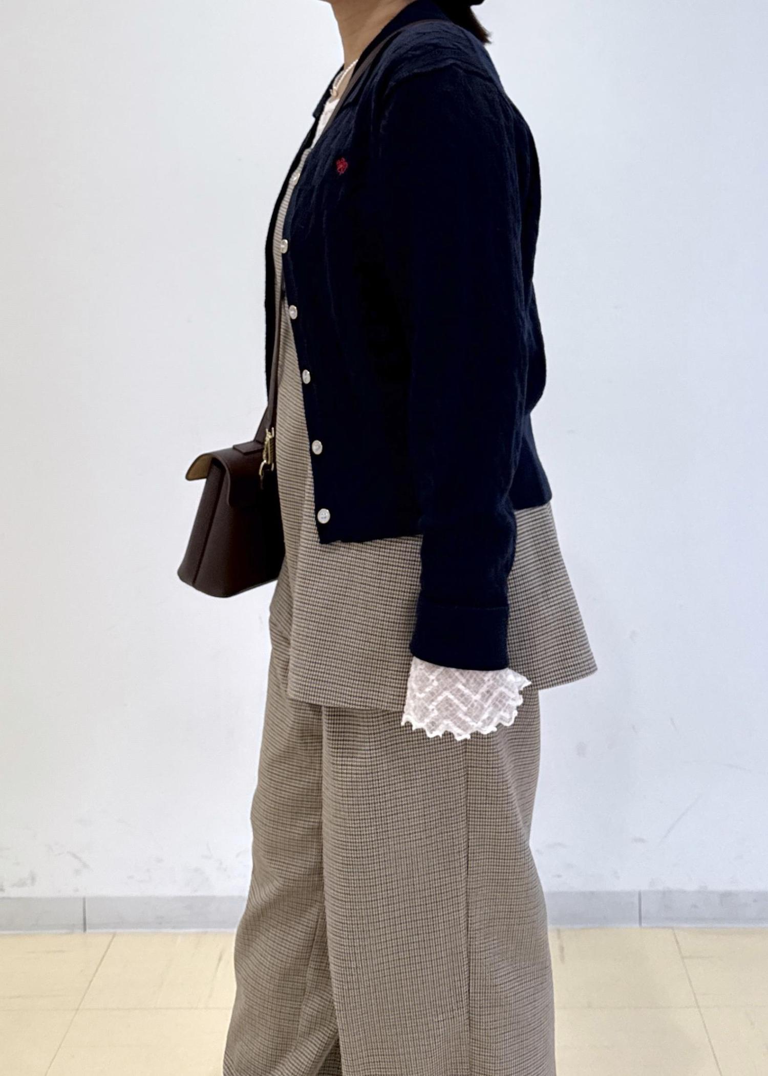 インナーをレースにすることで抜け感をだし、ネイビーの襟ありカーディガンとの合わせが重たくならないように意識しました!