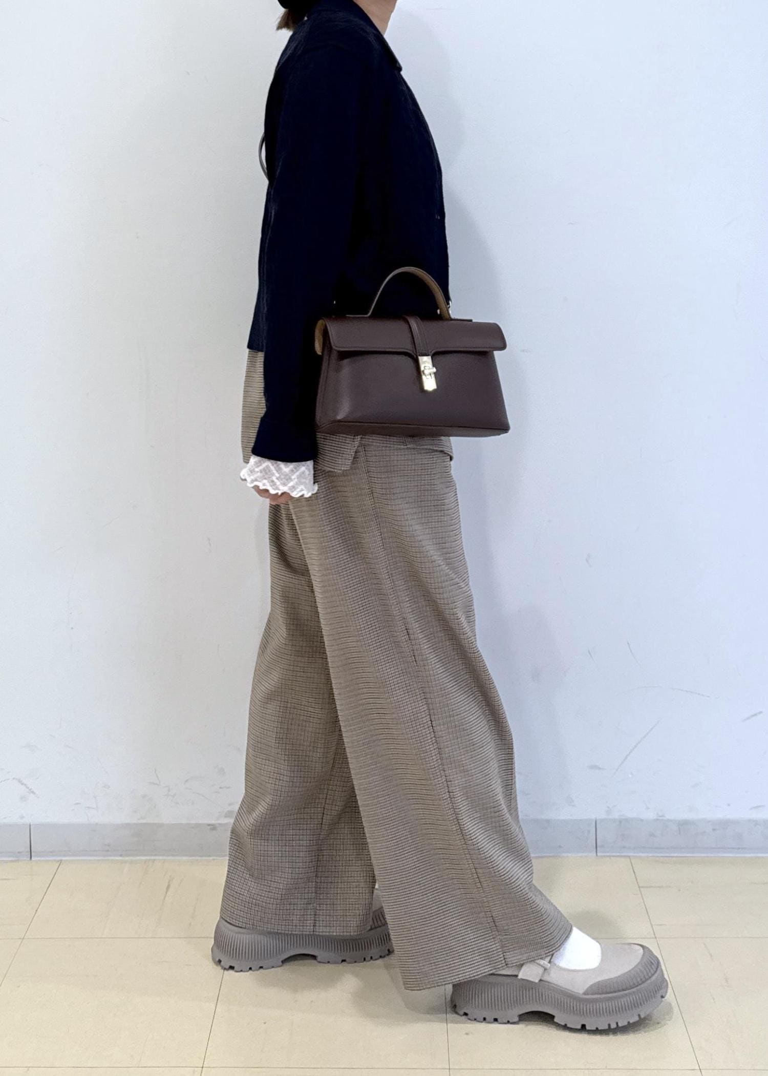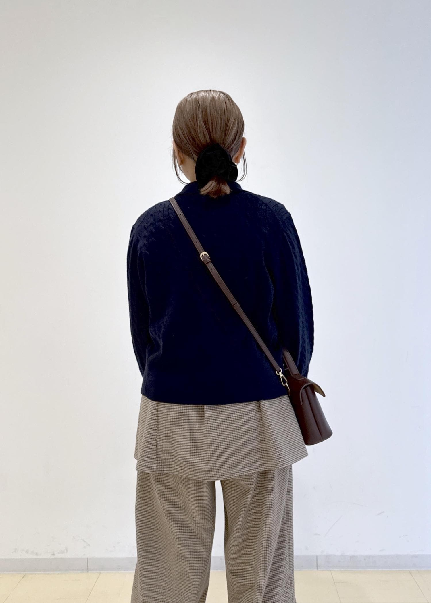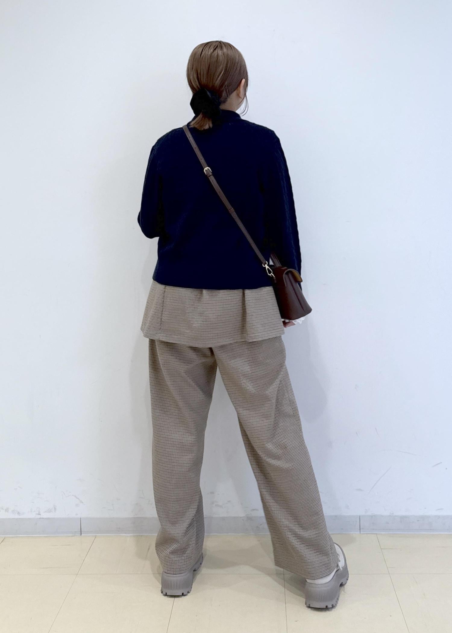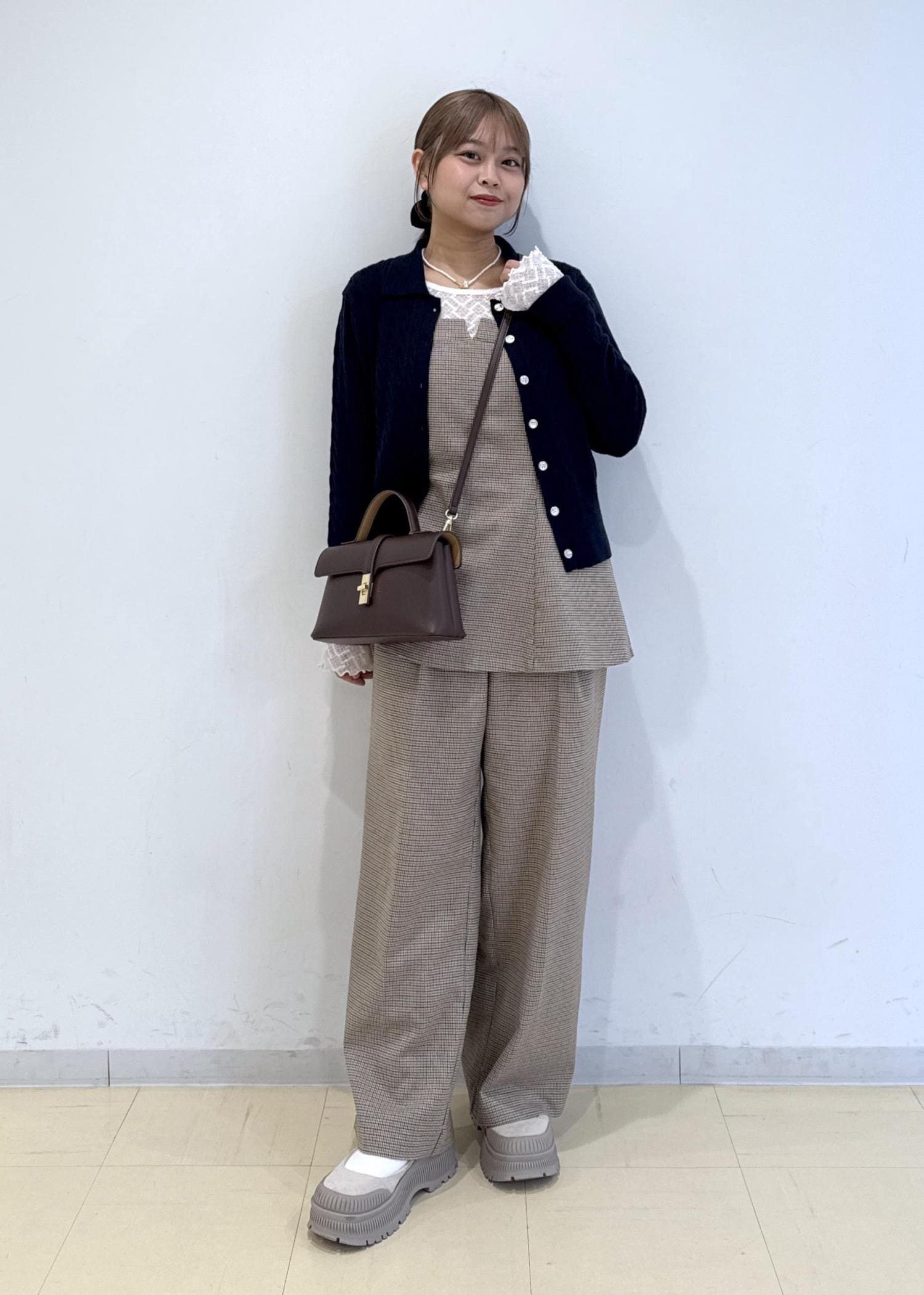 インナーをレースにすることで抜け感をだし、ネイビーの襟ありカーディガンとの合わせが重たくならないように意識しました!