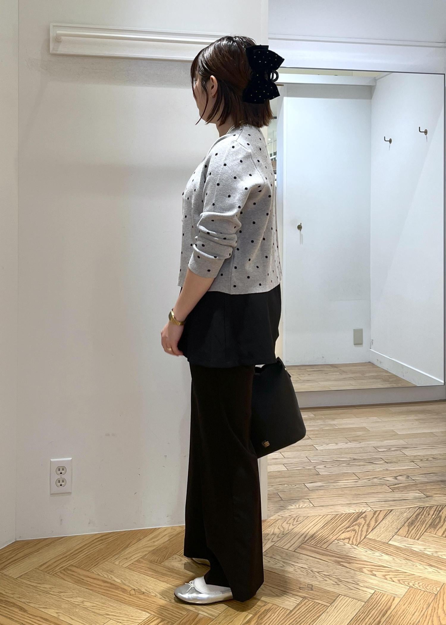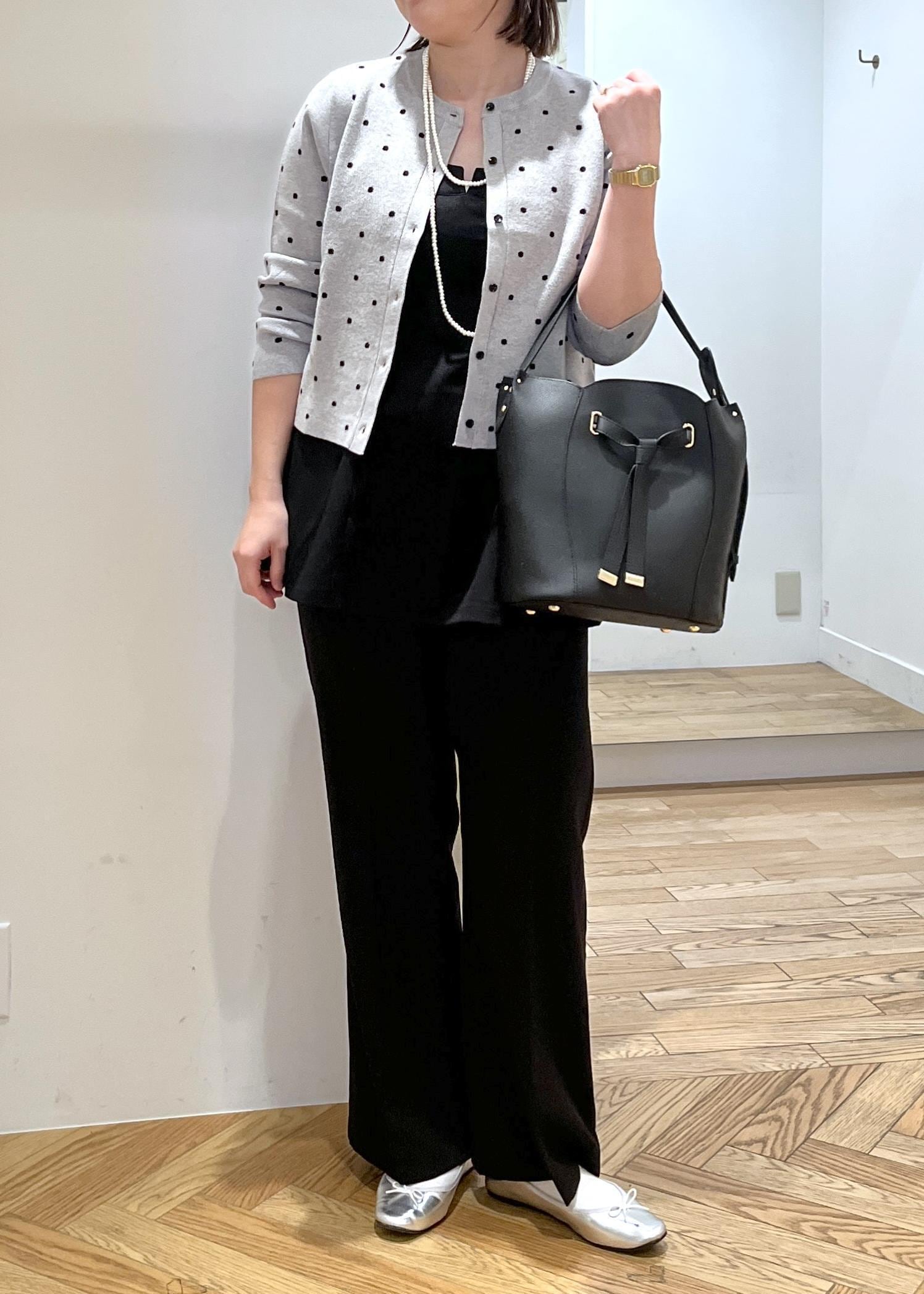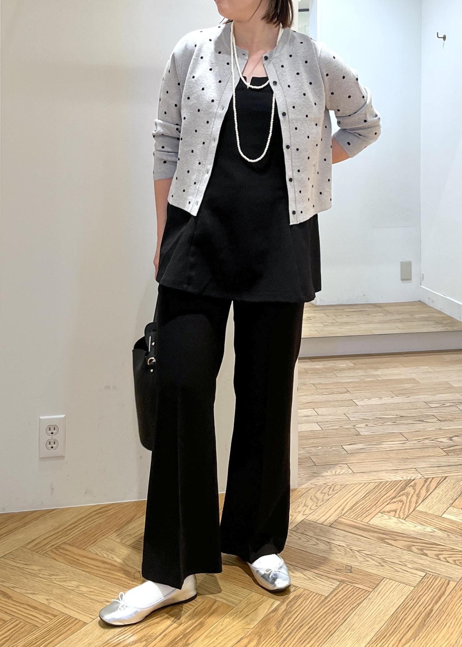個人的にドット柄は可愛くなりすぎちゃう…と抵抗がありましたが、モノトーン配色のこちらのカーディガンは、着てみると甘くなりすぎずシックな印象でも楽しめました♡