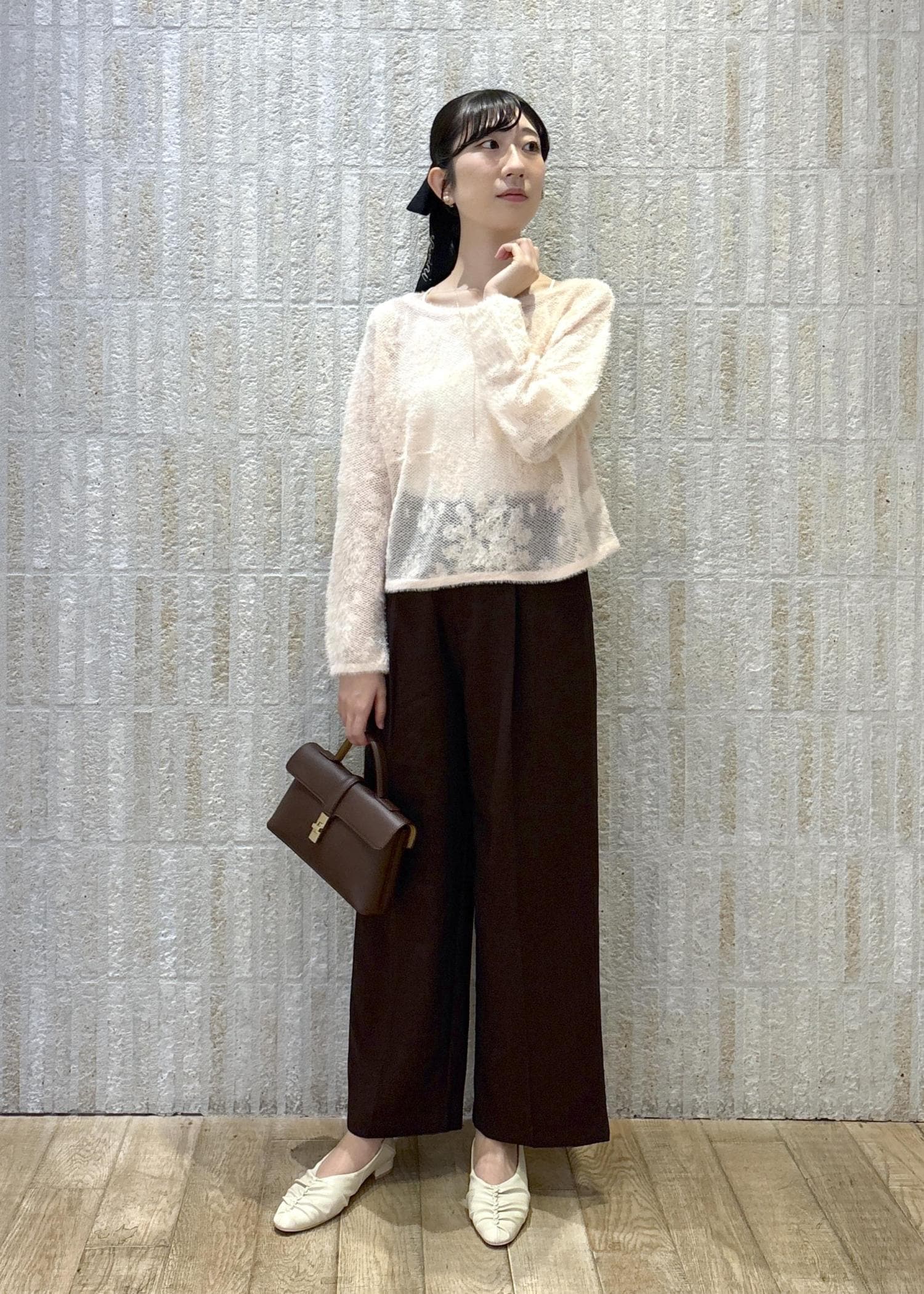 トップスの淡いピンクに、濃いダークブラウンを合わせた、大人かわいい秋先コーデです♪
