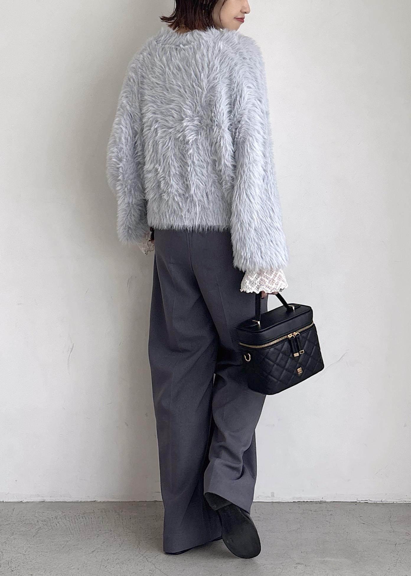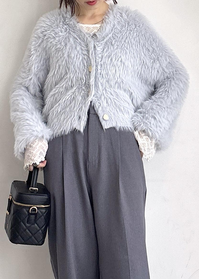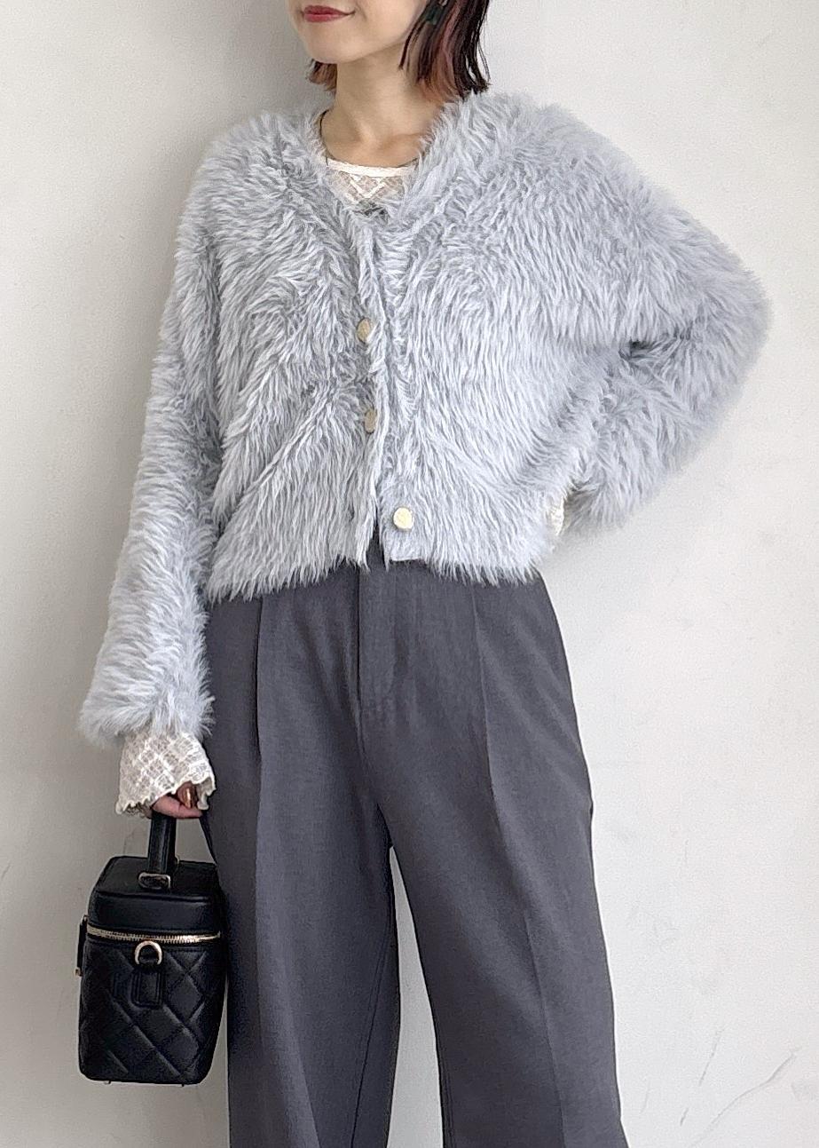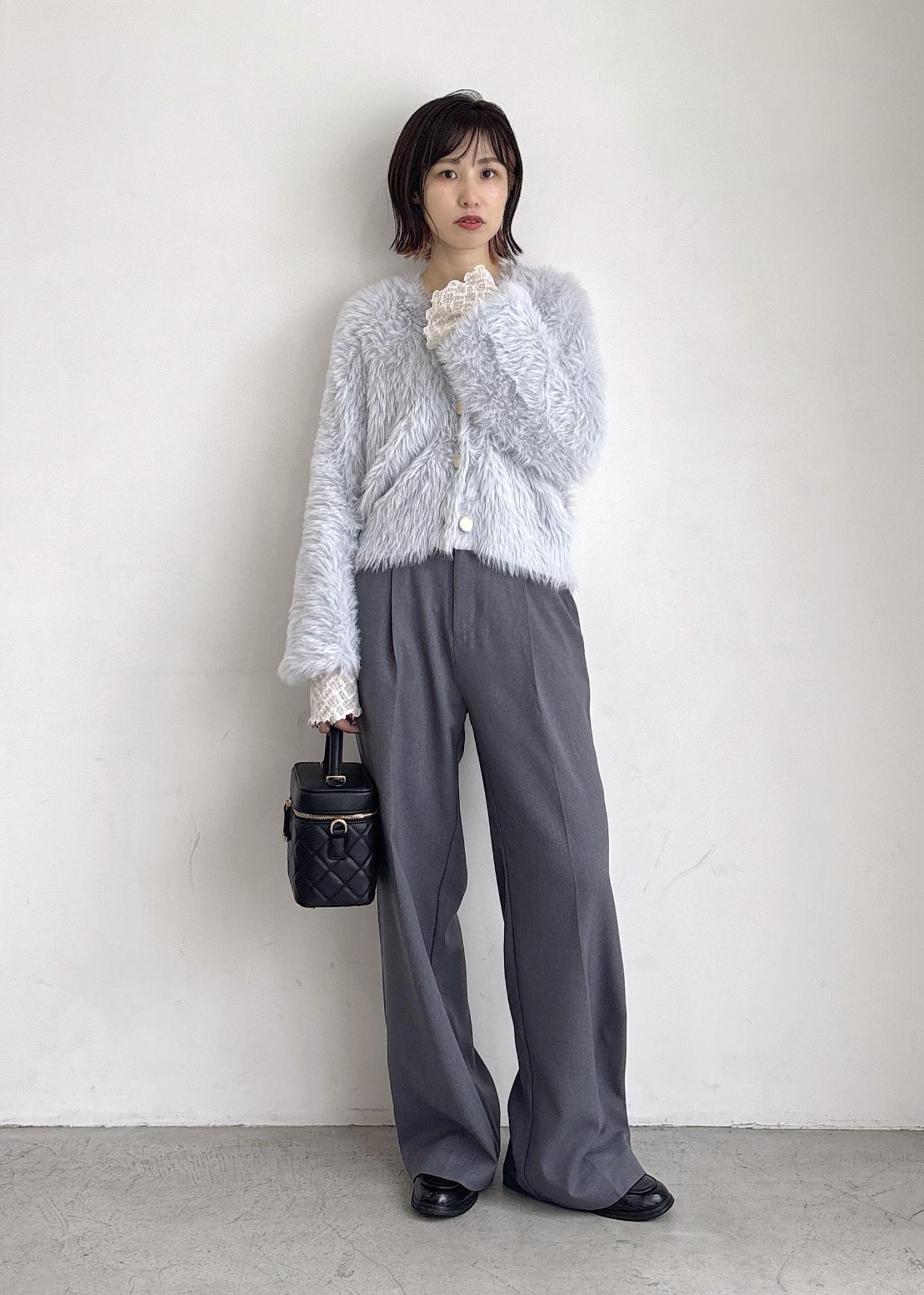 ふわふわ柔らかな季節を感じるファーカーディガンをポイントに、レースインナーのレイヤード、グレーのワイドパンツで合わせた大人カジュアルスタイル♪肌寒くなってきた時便利なカーディガンは、短丈でトップスにもなるので秋から冬まで活躍する優秀アイテム。ブルー×グレーの色合わせが大人可愛いくてオススメです。