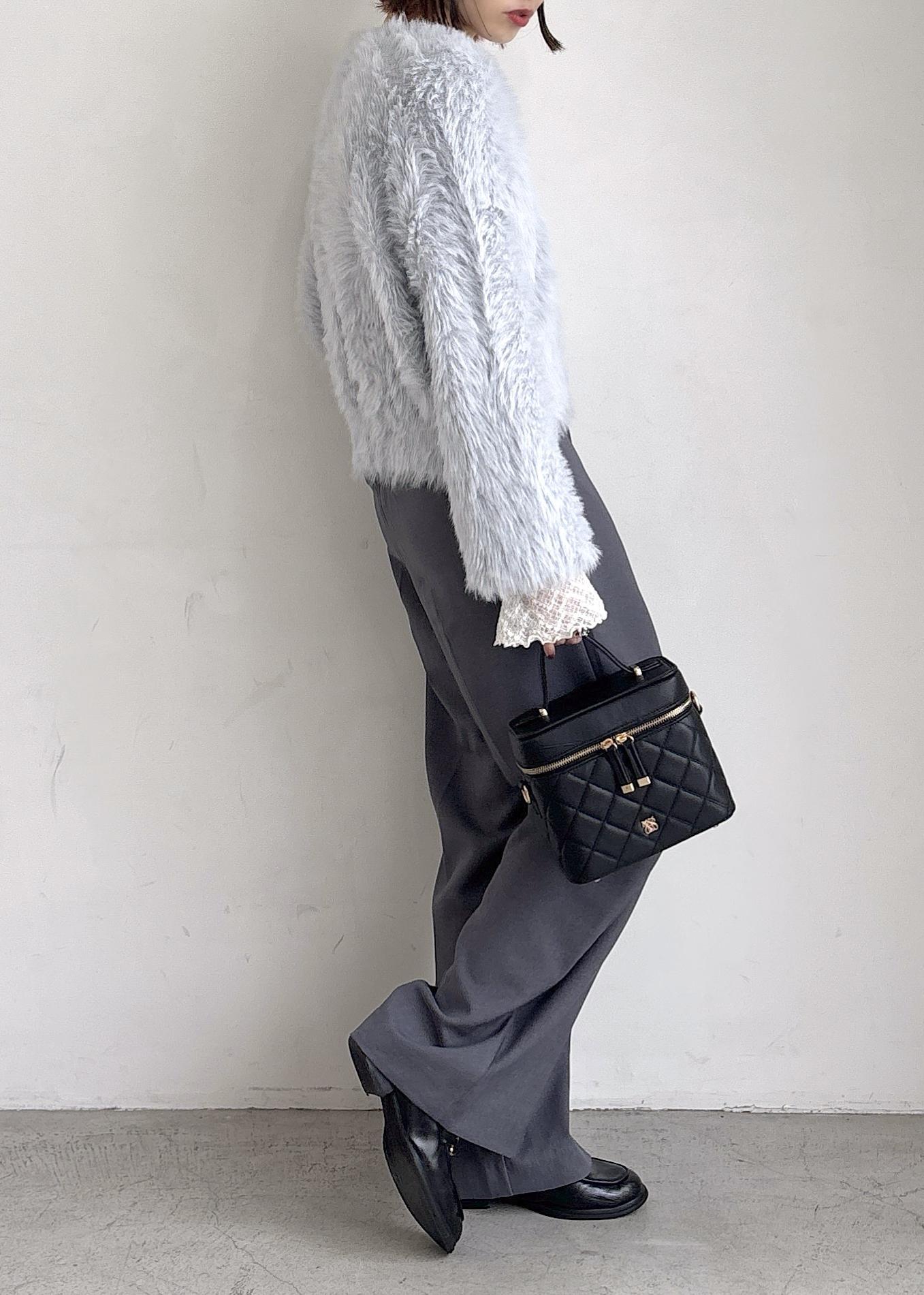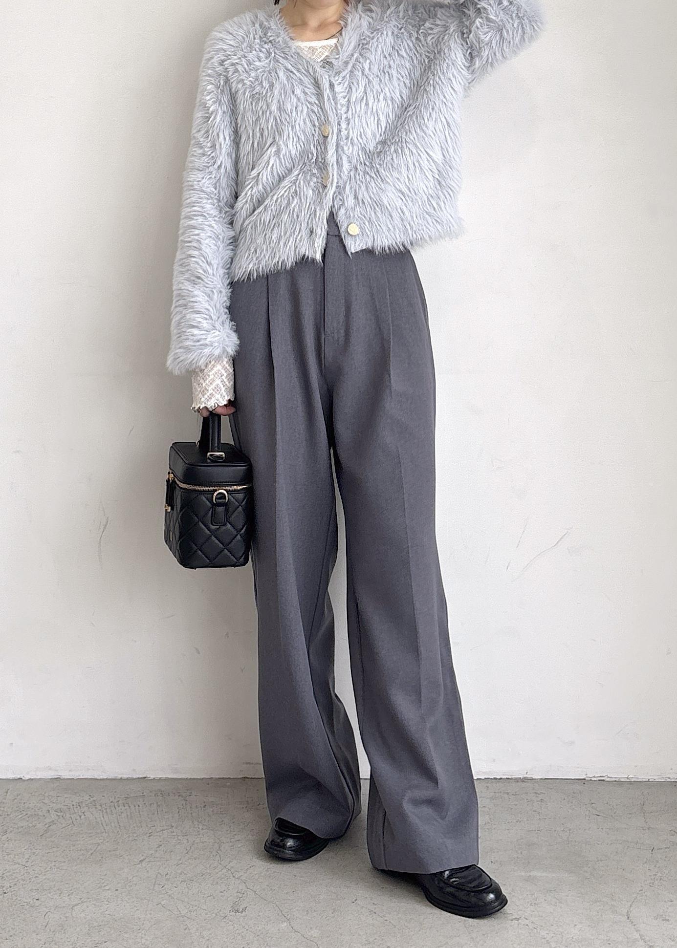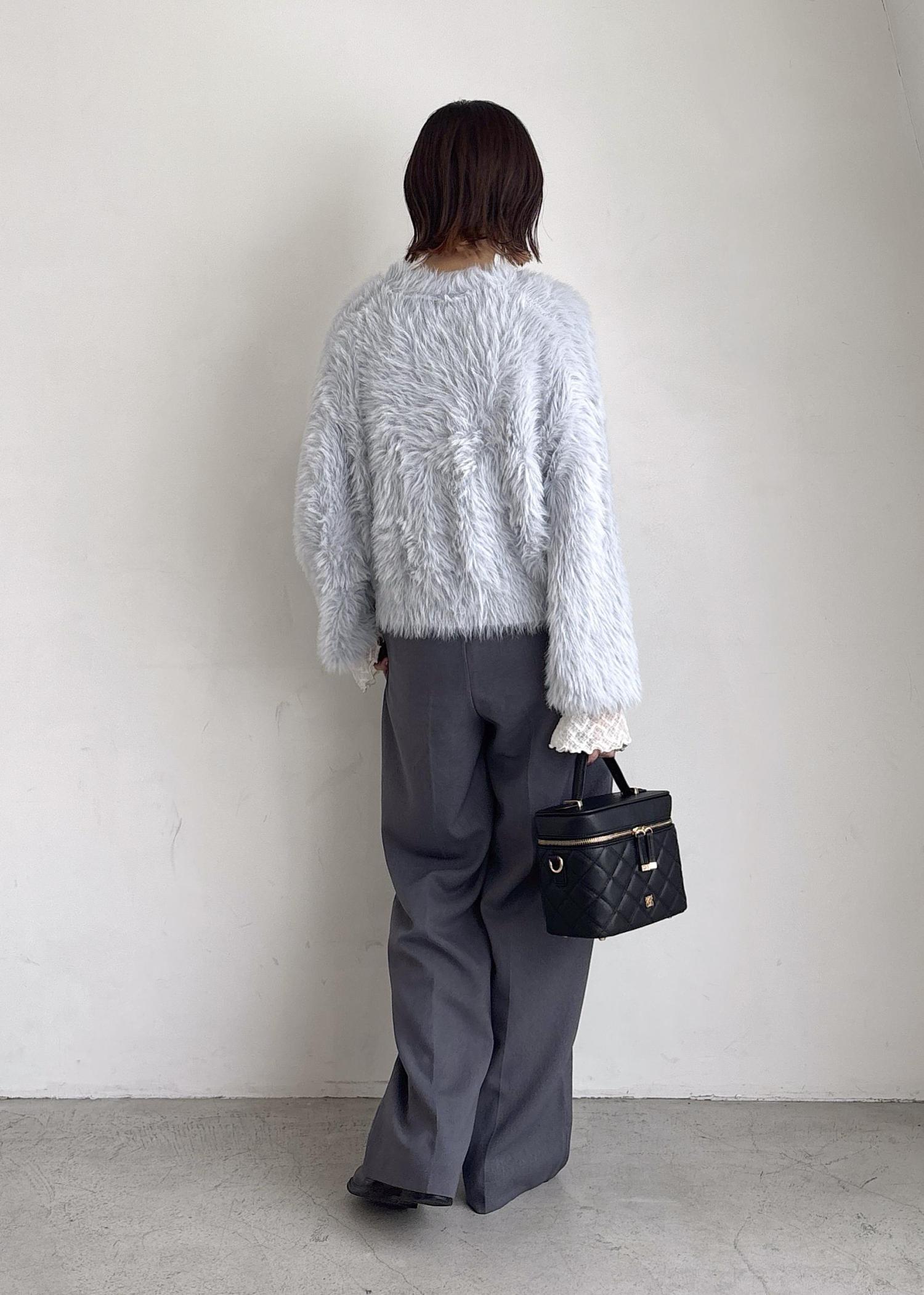 ふわふわ柔らかな季節を感じるファーカーディガンをポイントに、レースインナーのレイヤード、グレーのワイドパンツで合わせた大人カジュアルスタイル♪肌寒くなってきた時便利なカーディガンは、短丈でトップスにもなるので秋から冬まで活躍する優秀アイテム。ブルー×グレーの色合わせが大人可愛いくてオススメです。
