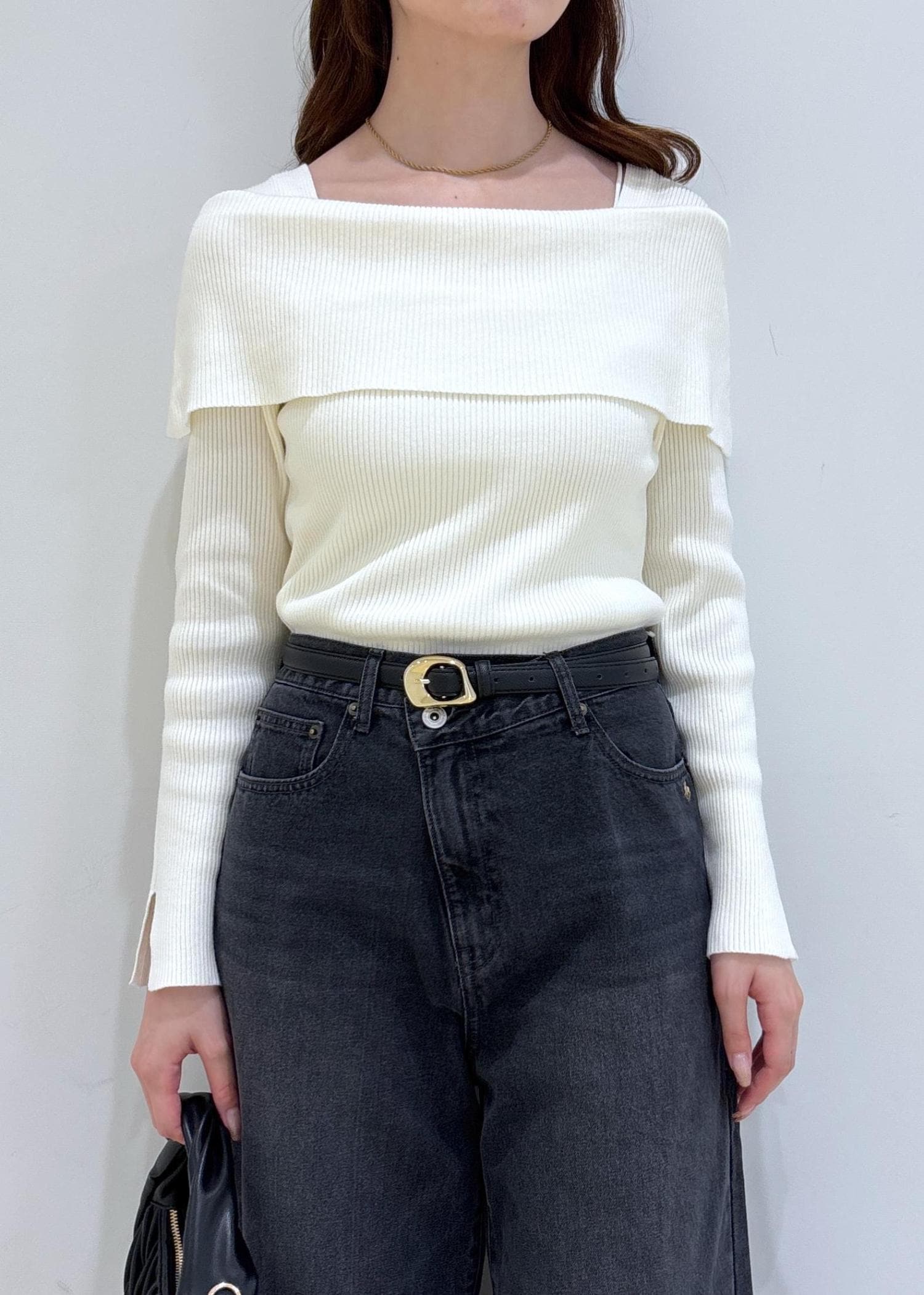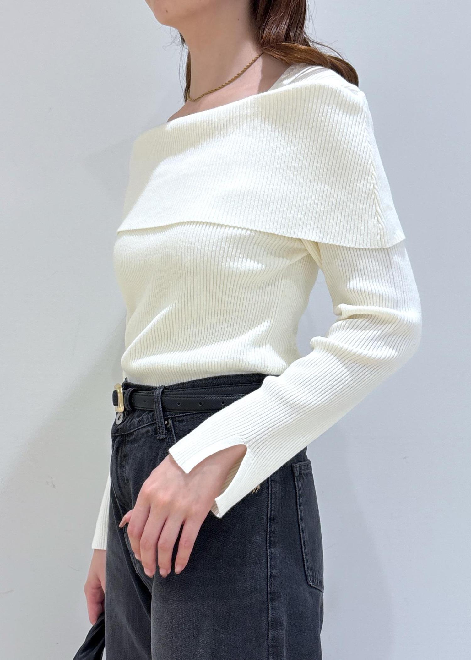 VISオフショルダーモチモチリブニットオフホワイト / F¥5,489レビュー程よく身体にフィットしますが、窮屈感はなくモチモチした伸縮性ある素材感で着心地が良いです。