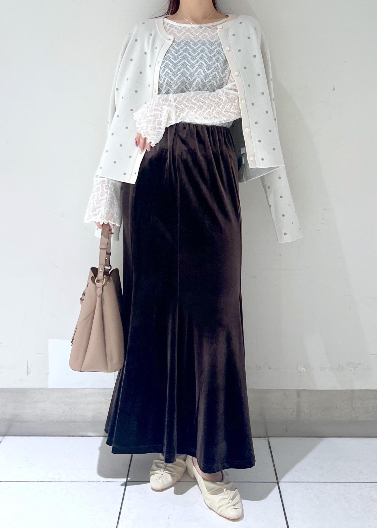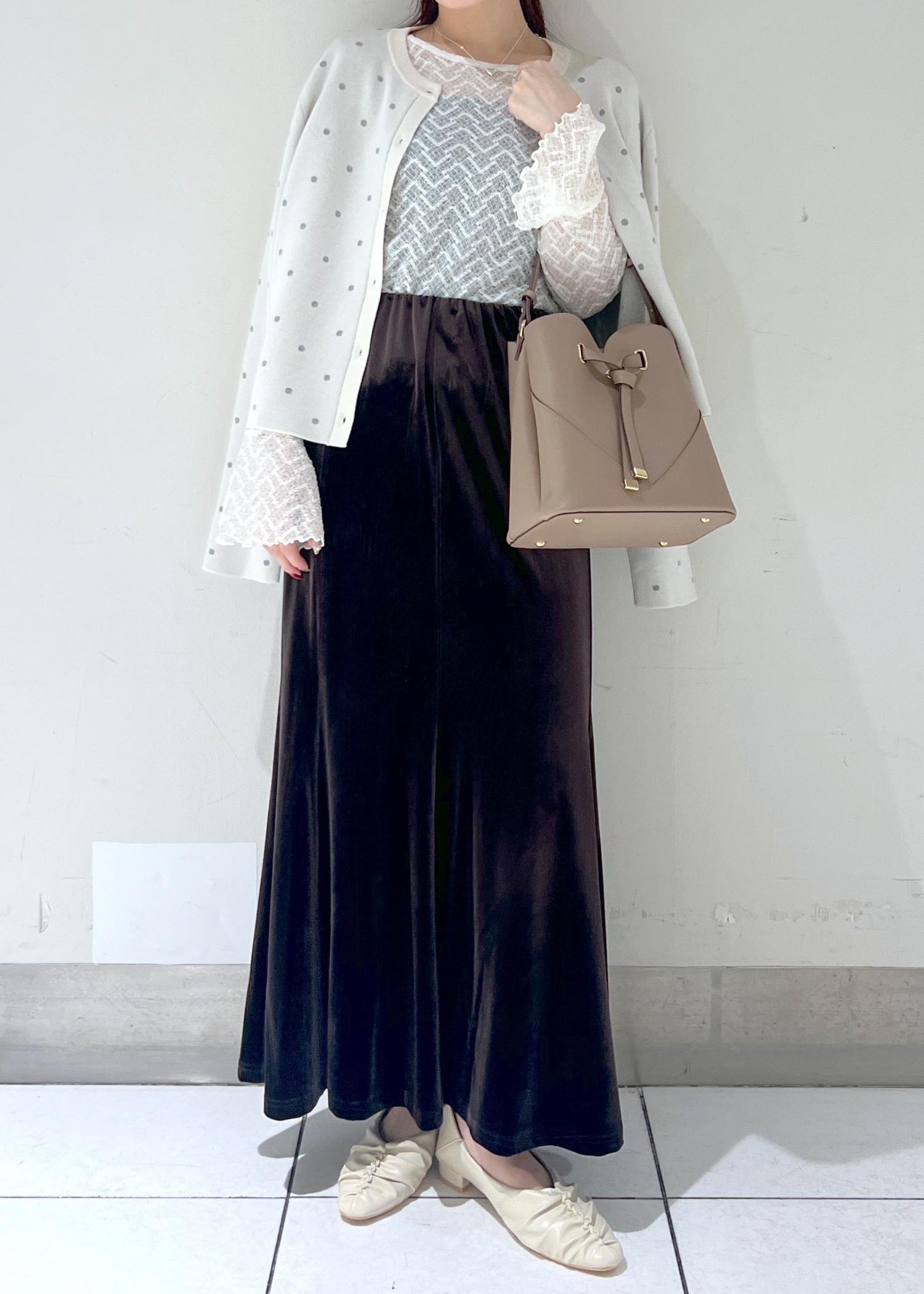 少しレース素材を入れたり、ベロアスカートを合わせることで抜け感を出せるようにしてみました!