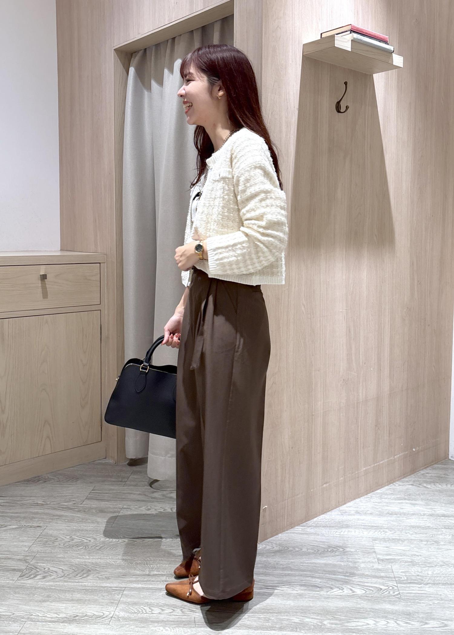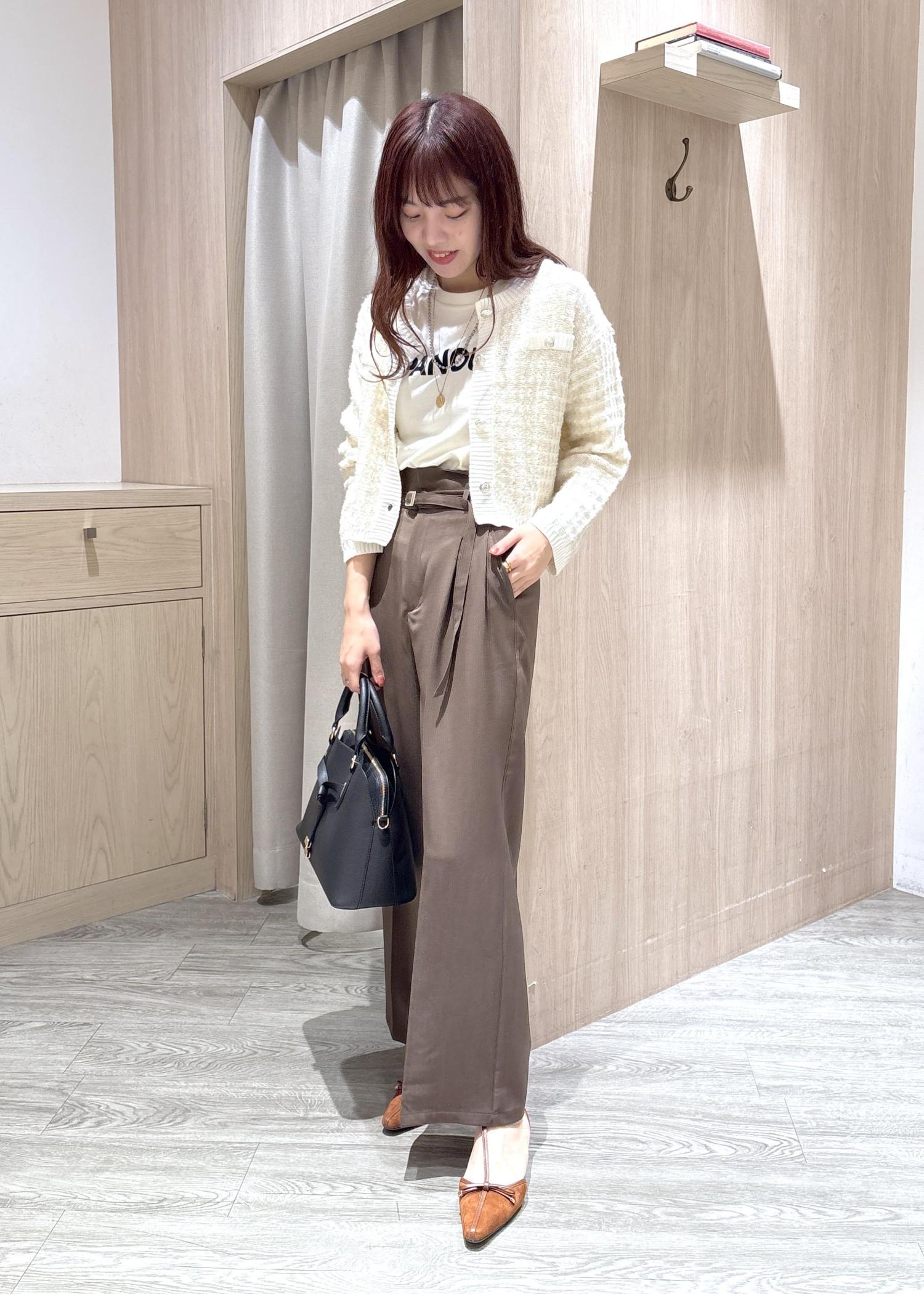 甘くなりがちなツイードカーディガンですが、Tシャツとワイドパンツを合わせることでハンサムな印象に◎