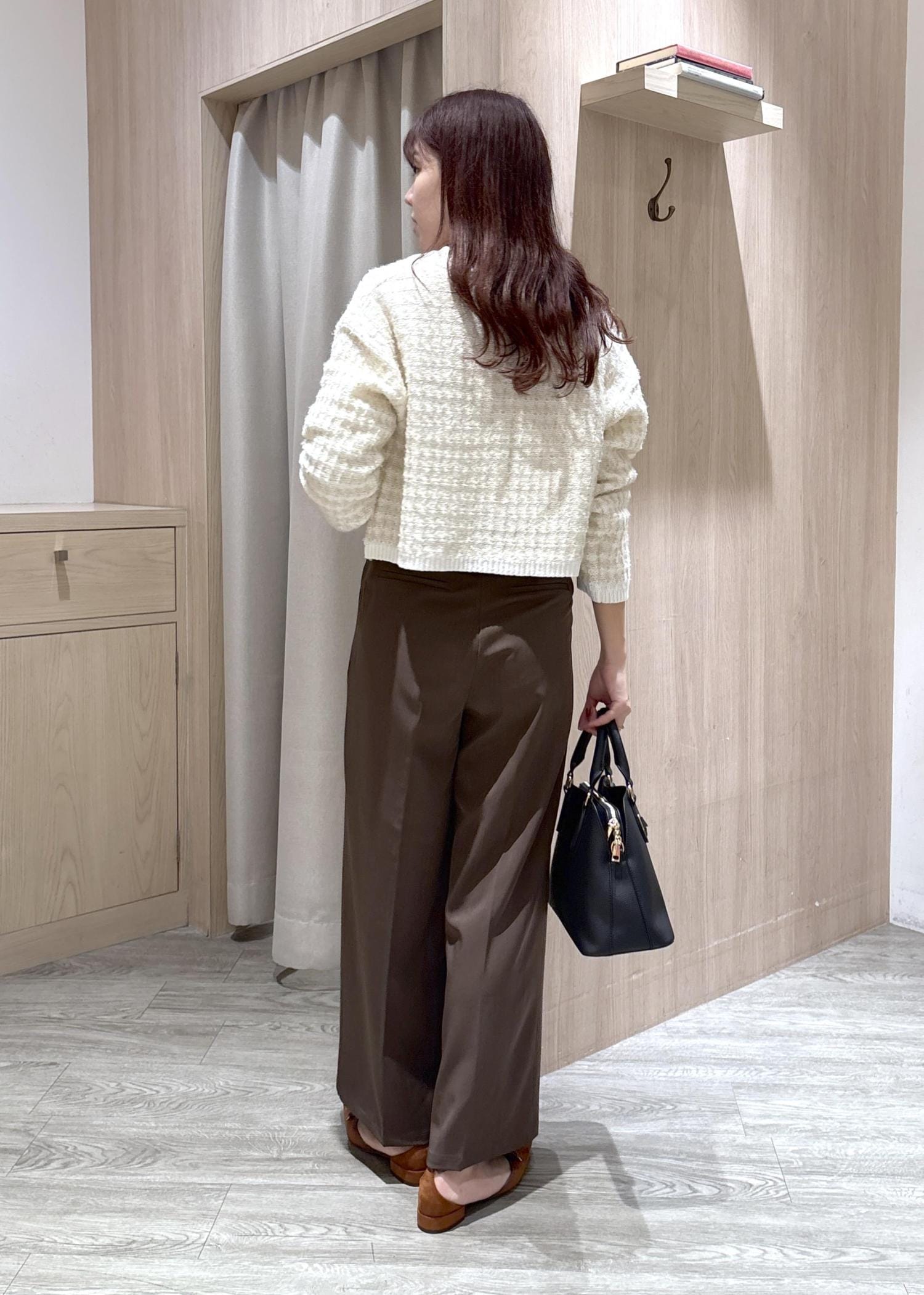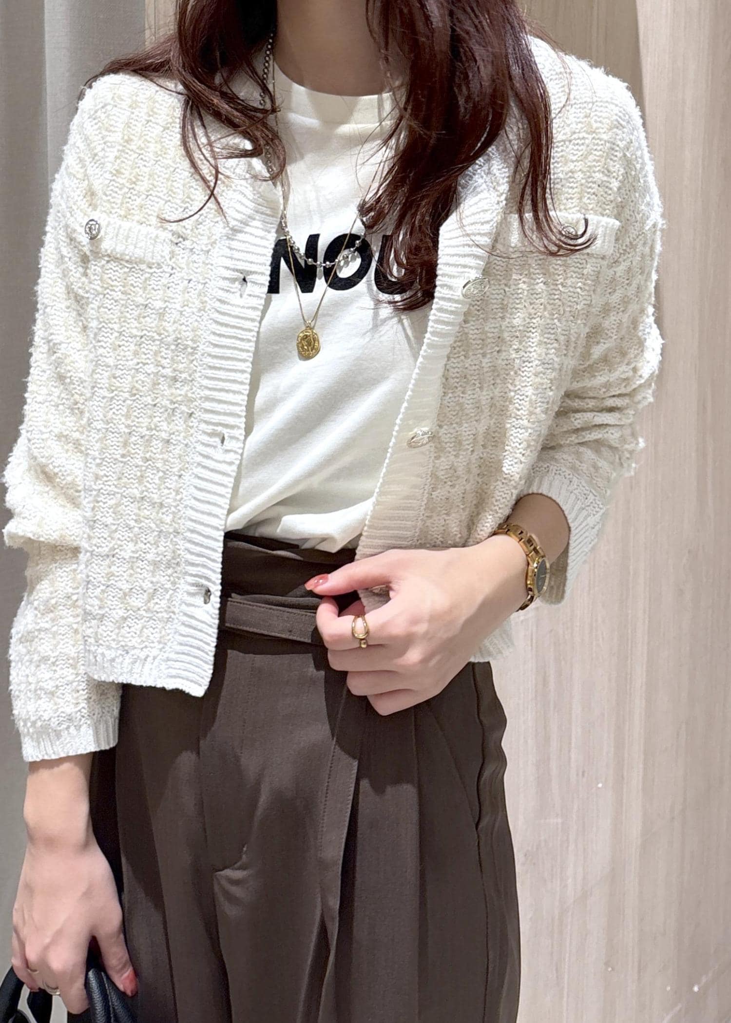 ホワイトのツイードカーディガンは柔らかくみせてくれます♪
