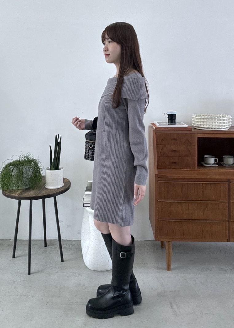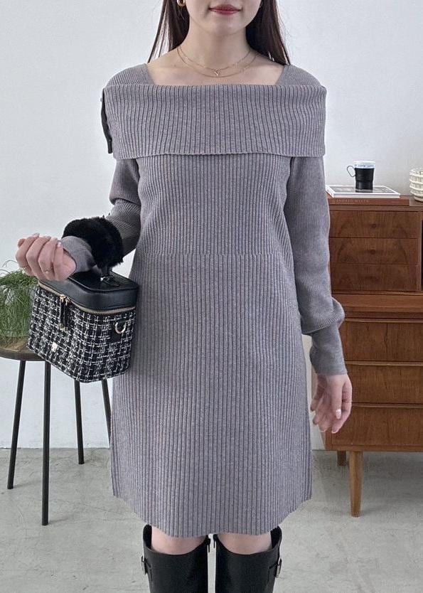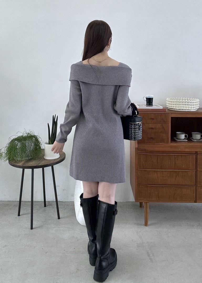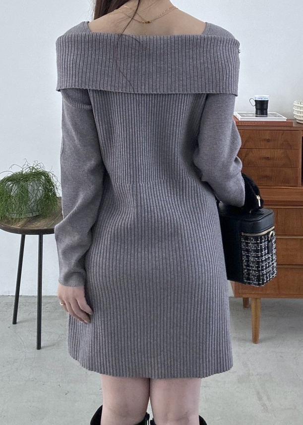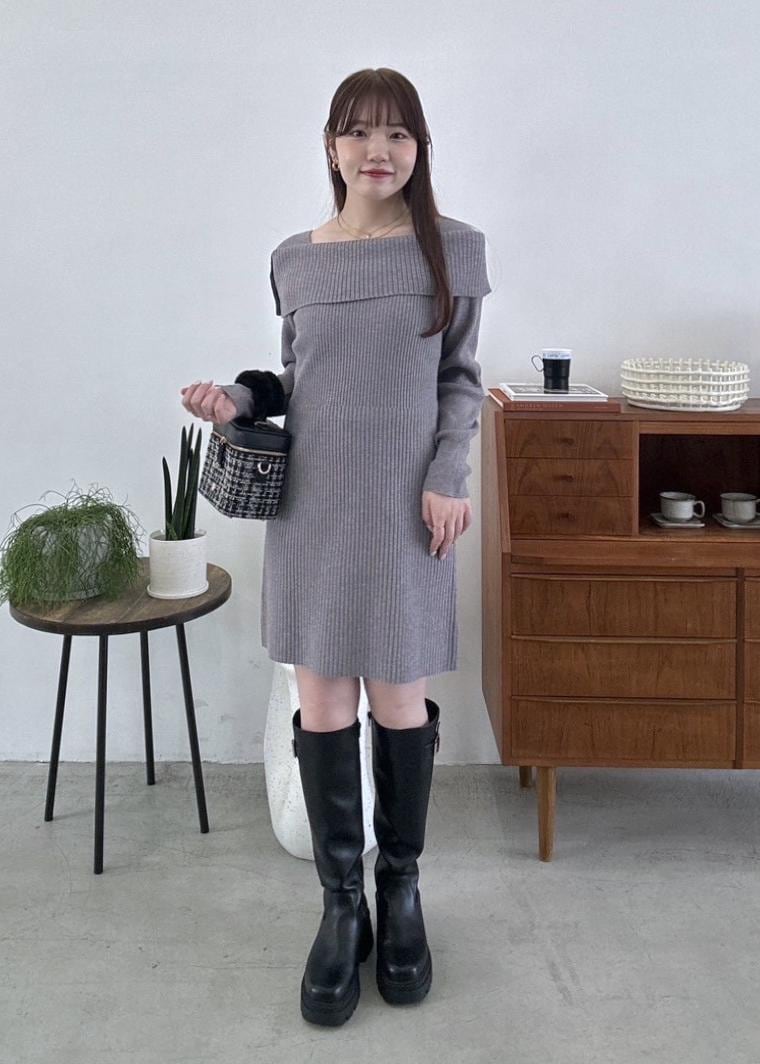 落ち着いたカラーでまとめつつ、ミニ丈のオフショルニットワンピースで程良い肌見せ!