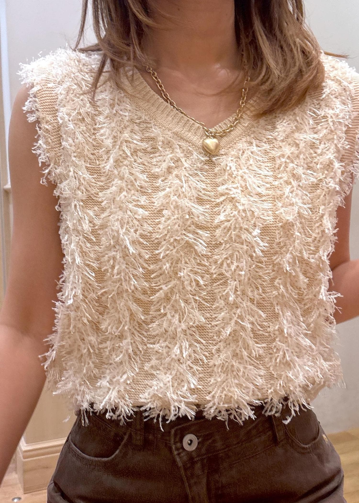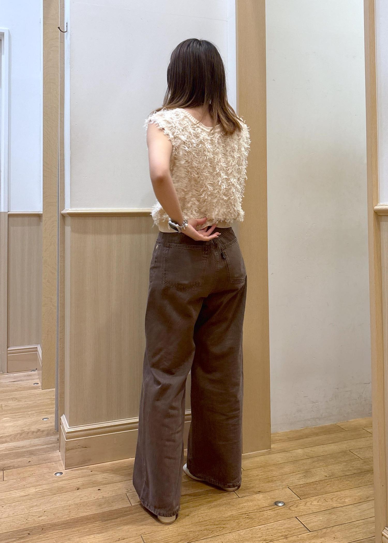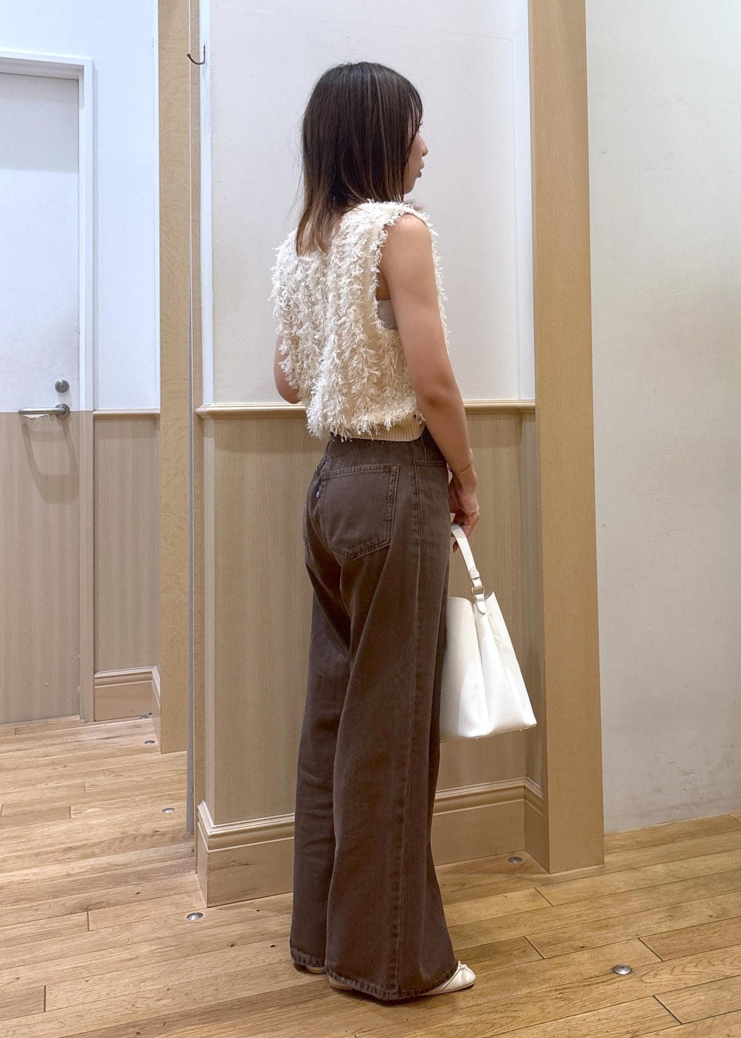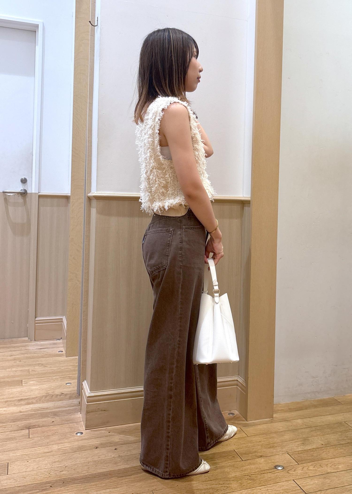 フリンジの毛足が長めなので分厚そうに見えますが、編み目自体はざっくり編みなため、密集度も低く、着太りもしないので夏の終わりにもちょうど良いです!