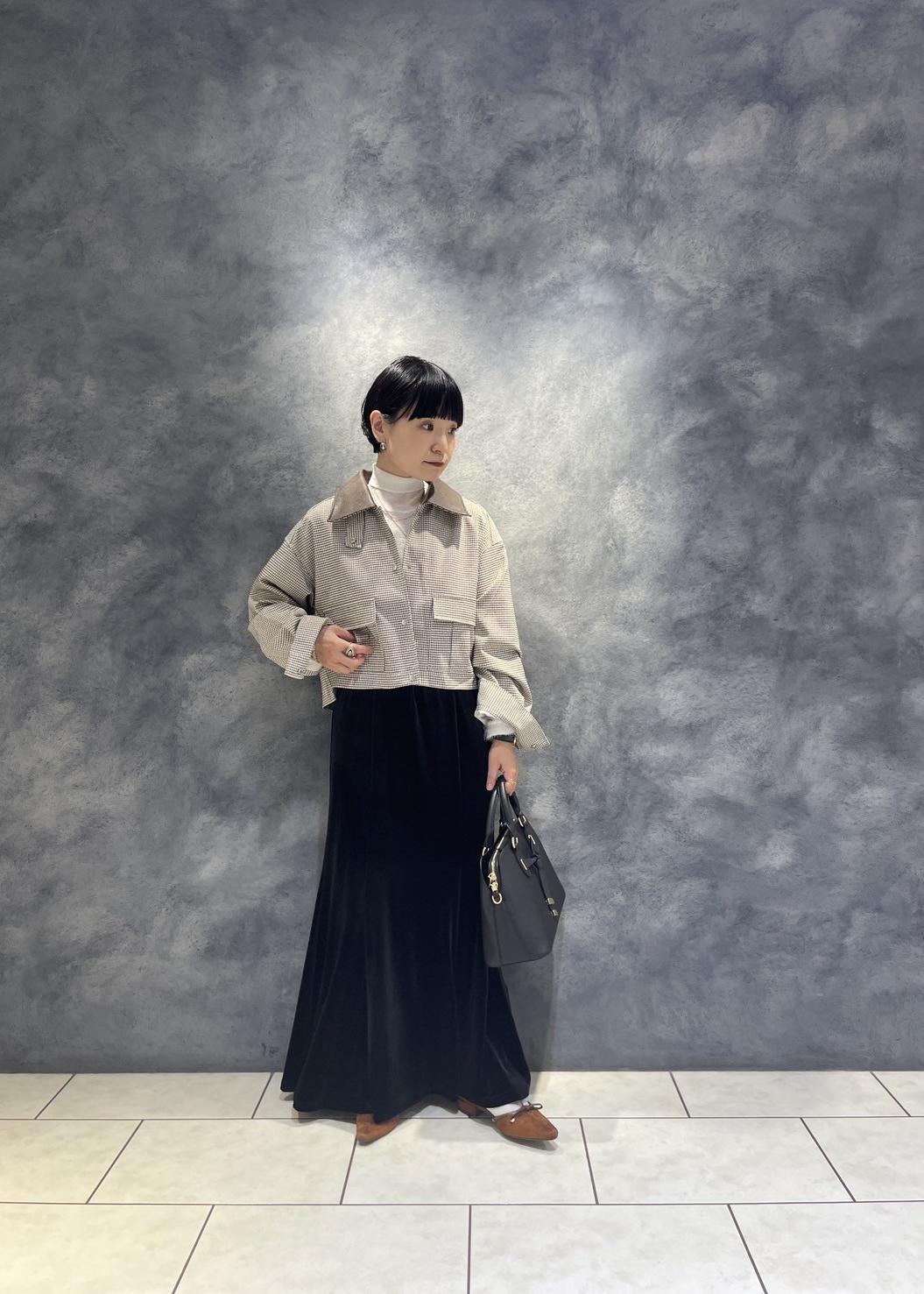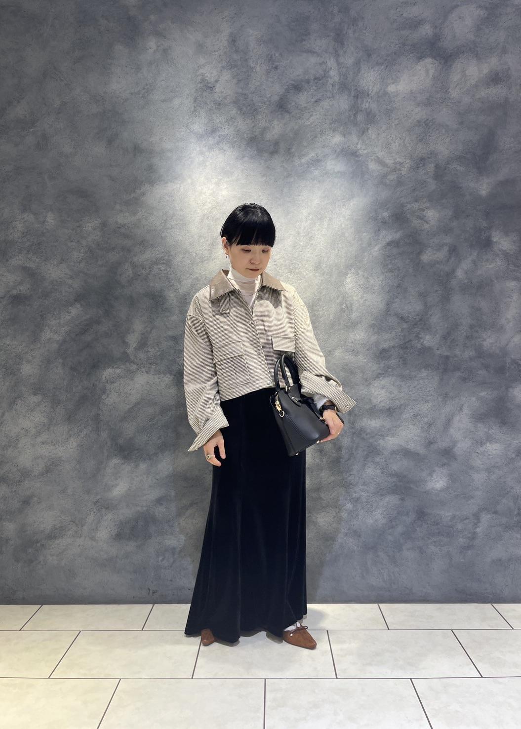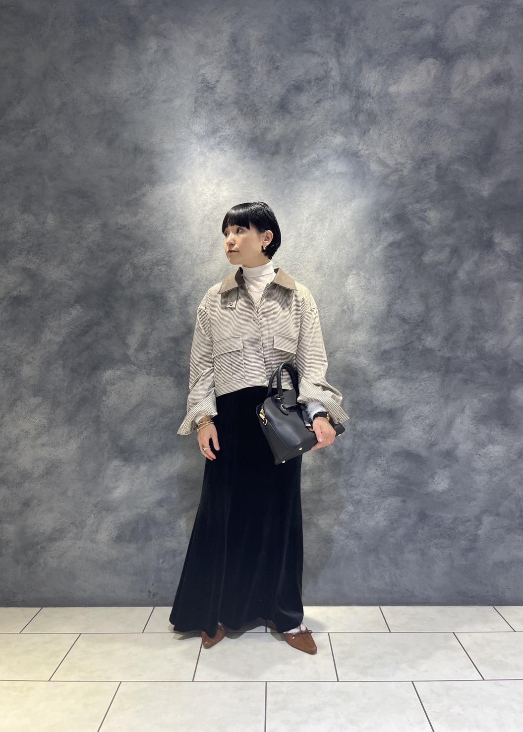 今季トレンドのベロアスカートをフェミニンになりすぎないようにチェック柄ブルゾンで合わせました。