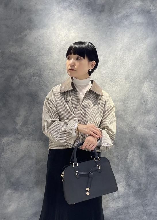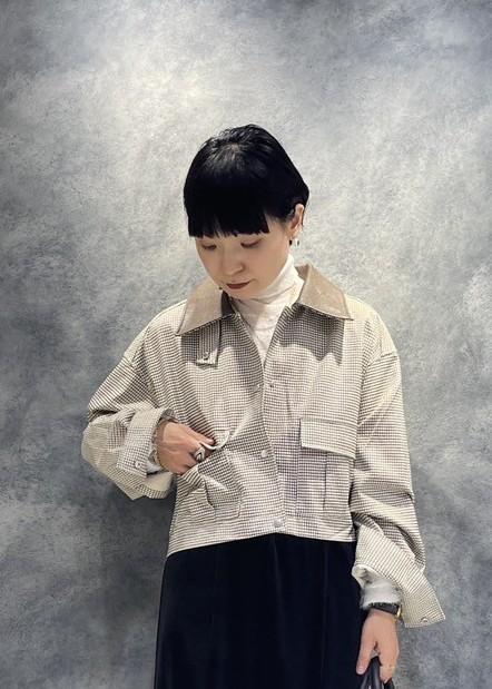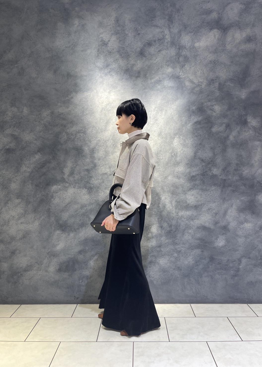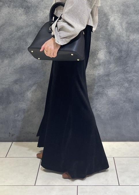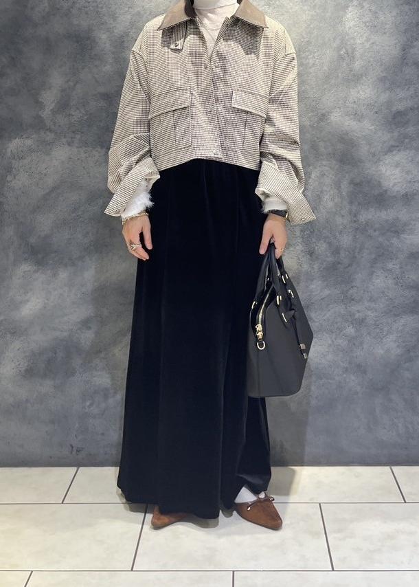 今季トレンドのベロアスカートをフェミニンになりすぎないようにチェック柄ブルゾンで合わせました。