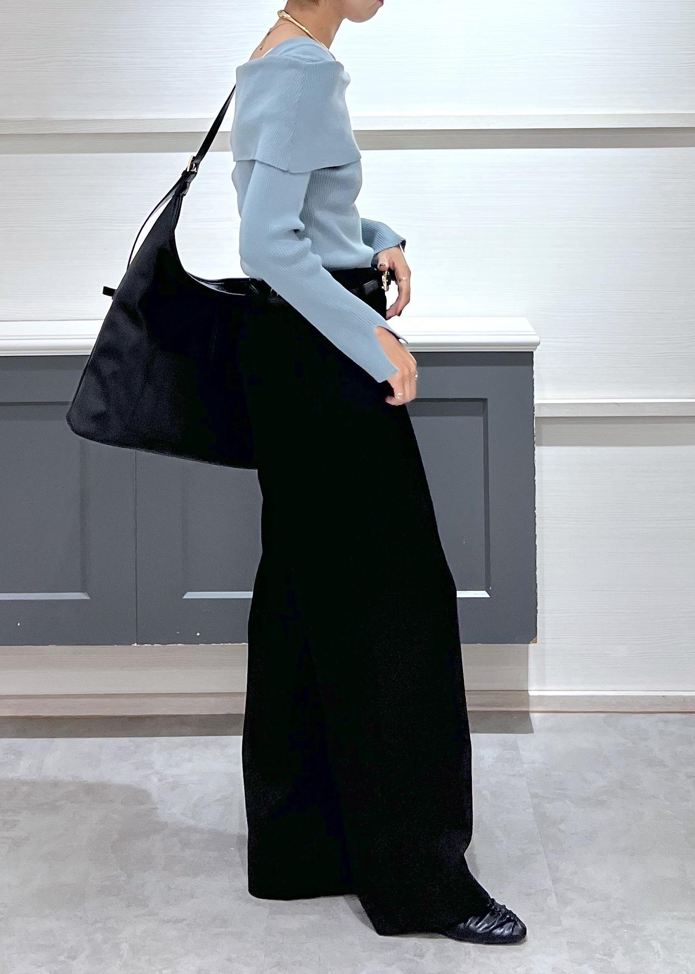 シンプルなブラックパンツで引き締めつつ、ゴールドアクセとバッグで都会的なムードを添えたスタイルです。