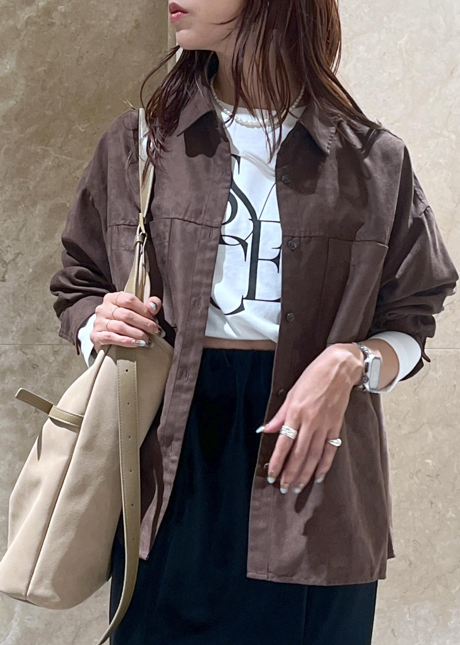 VISスエードライクロングスリーブシャツダークブラウン系 / F¥4,843レビュー身長158cm、ゆったりとしたオーバーサイズで着丈はおしりがすっぽりと隠れるほど。
