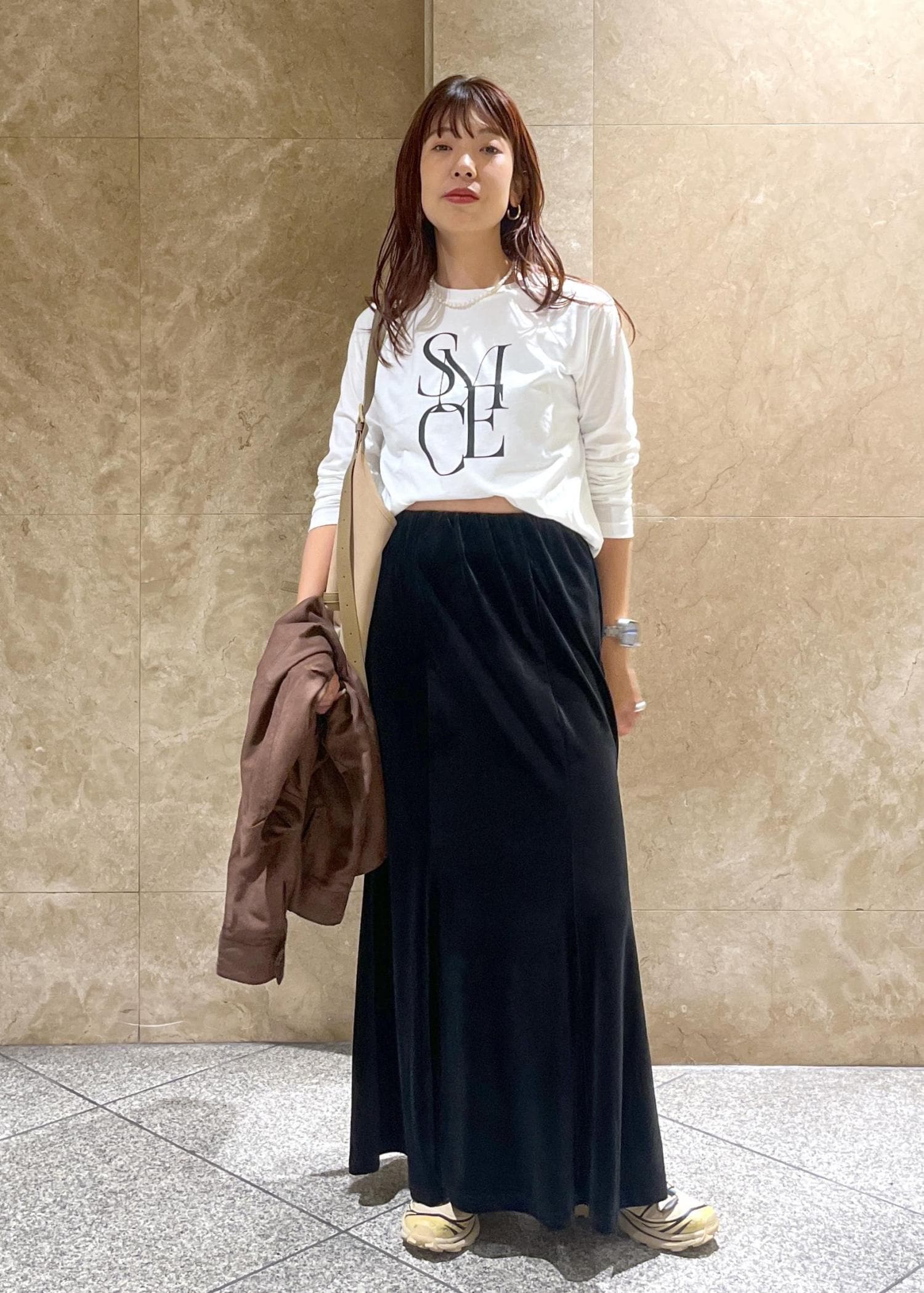 素材感はつるんとした滑らかな肌触りで、カジュアル見えしすぎない。厚みもほどよく、透けもほとんど気になりませんでした◎