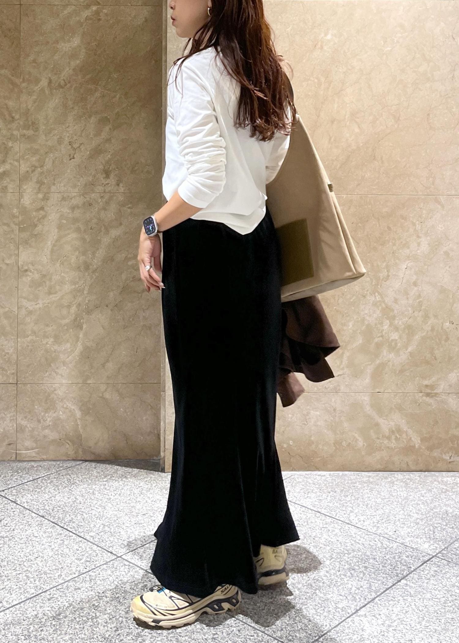 個人的にはずるっととても好みの長さでしたが、小柄な方でもウエストを内側に折ると、綺麗に長さを調整しながら着用いただけます◎