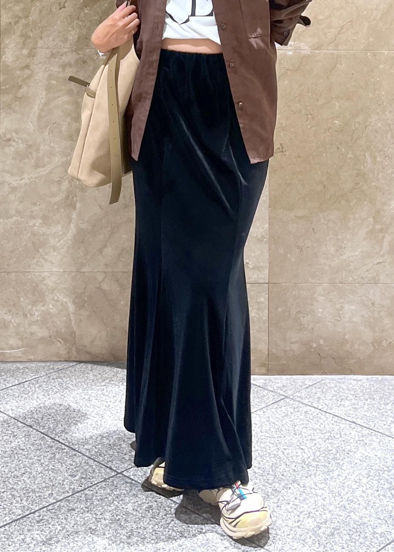 VISベロアナロースカートブラック / M¥6,589レビュー身長158cm、普段Mサイズを着用しており、こちらもMサイズで着丈はくるぶしにかかるほどの長め丈。