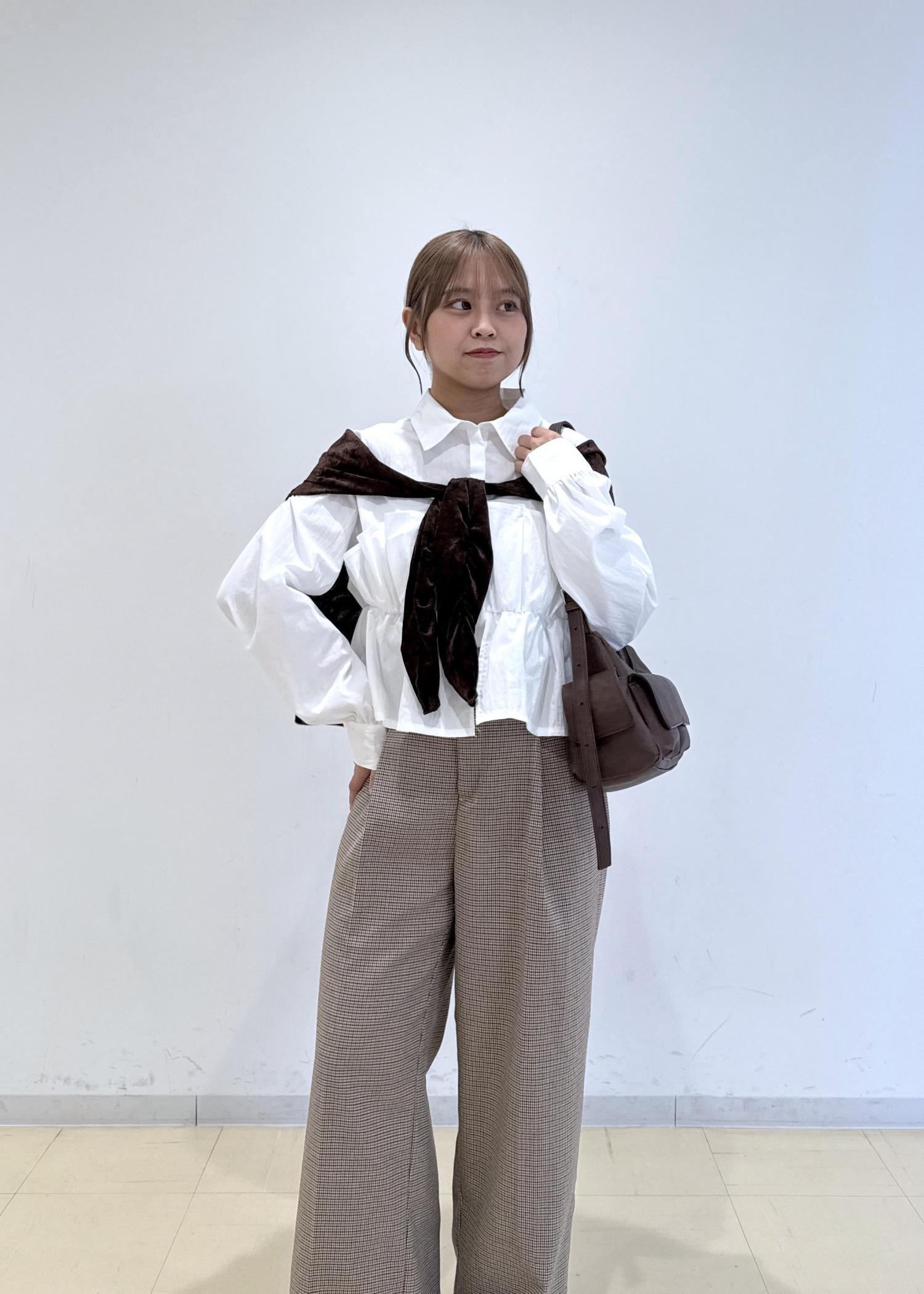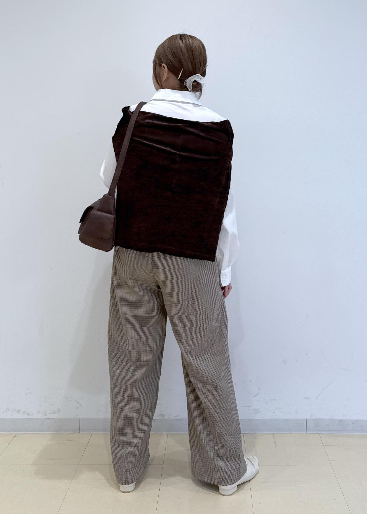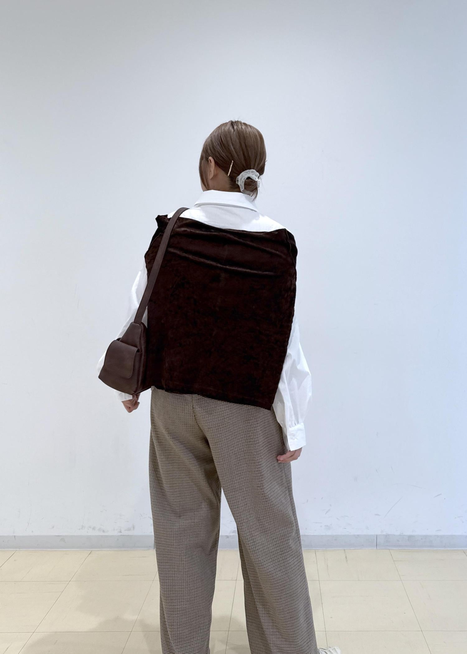 オフホワイトのシャツはシンプル見えしがちなのでベロアのカーディガンを肩掛けし、一癖プラスしました。