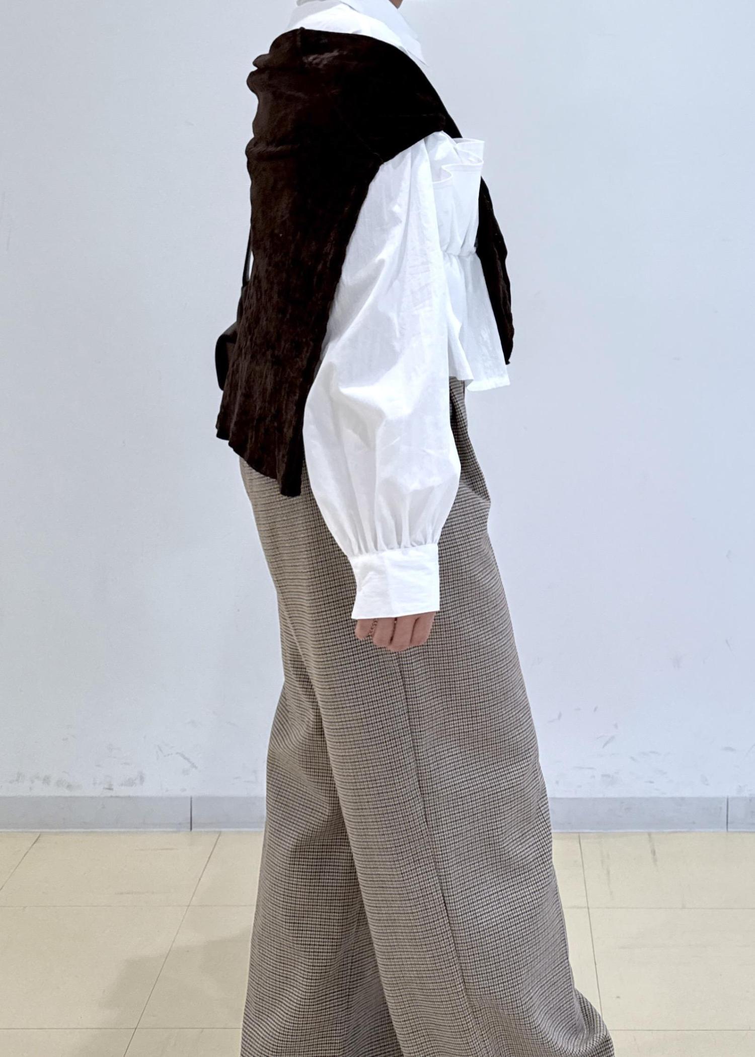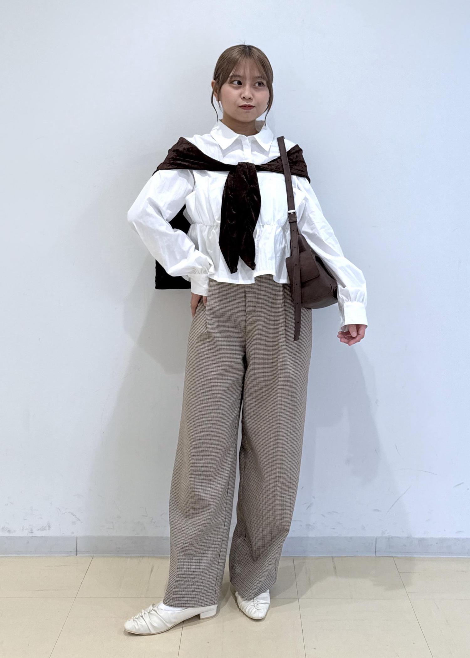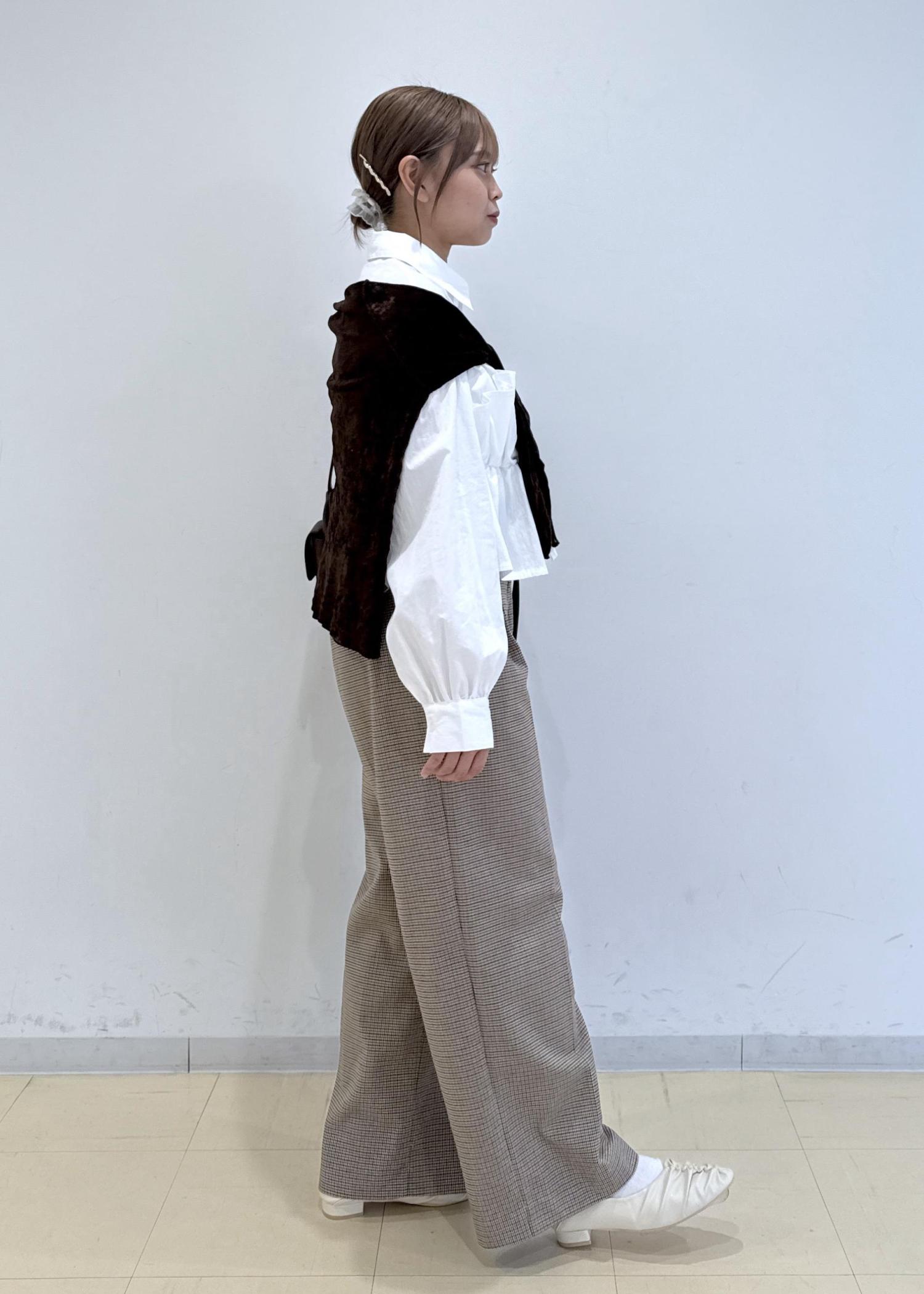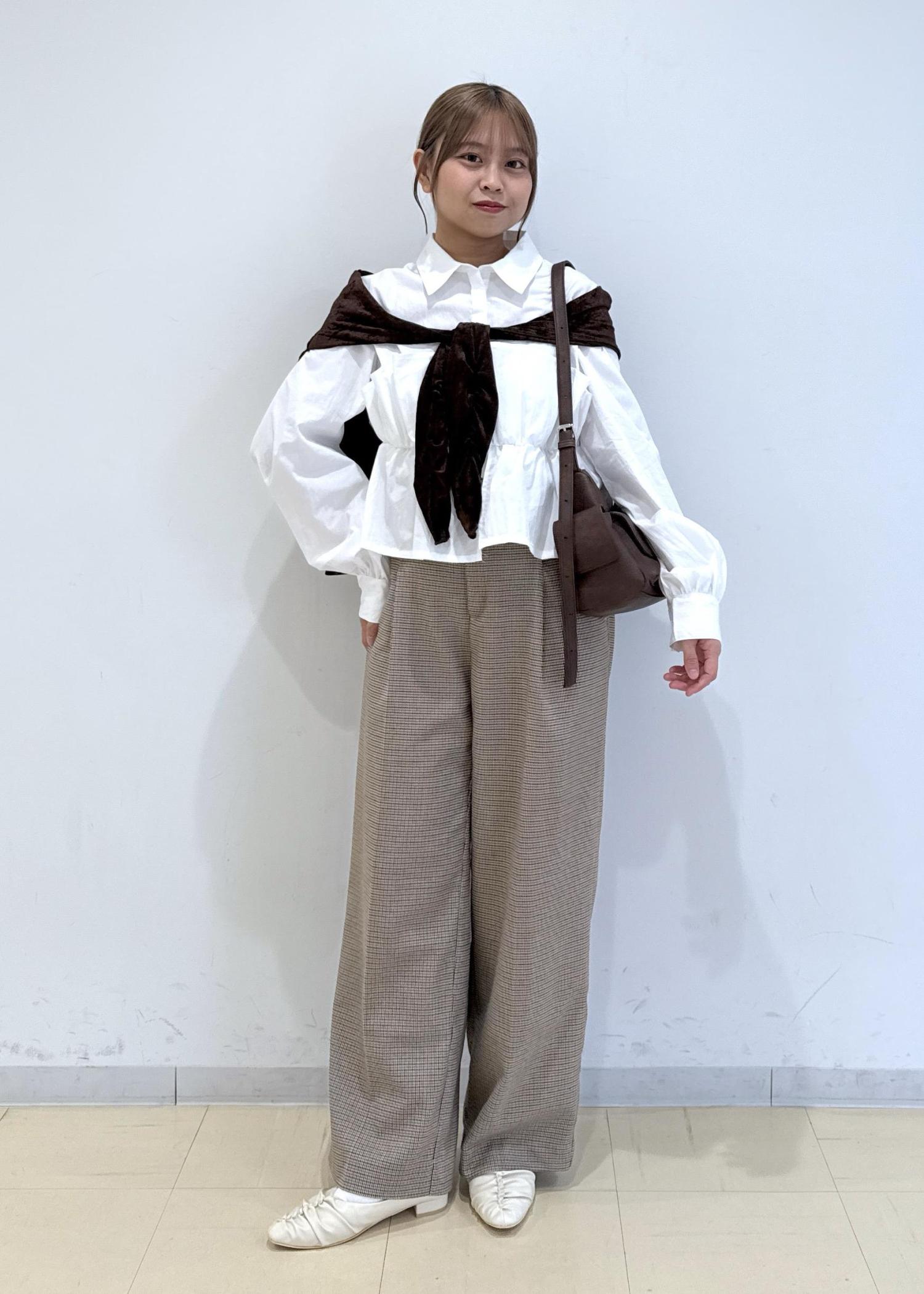 オフホワイトのシャツはシンプル見えしがちなのでベロアのカーディガンを肩掛けし、一癖プラスしました。