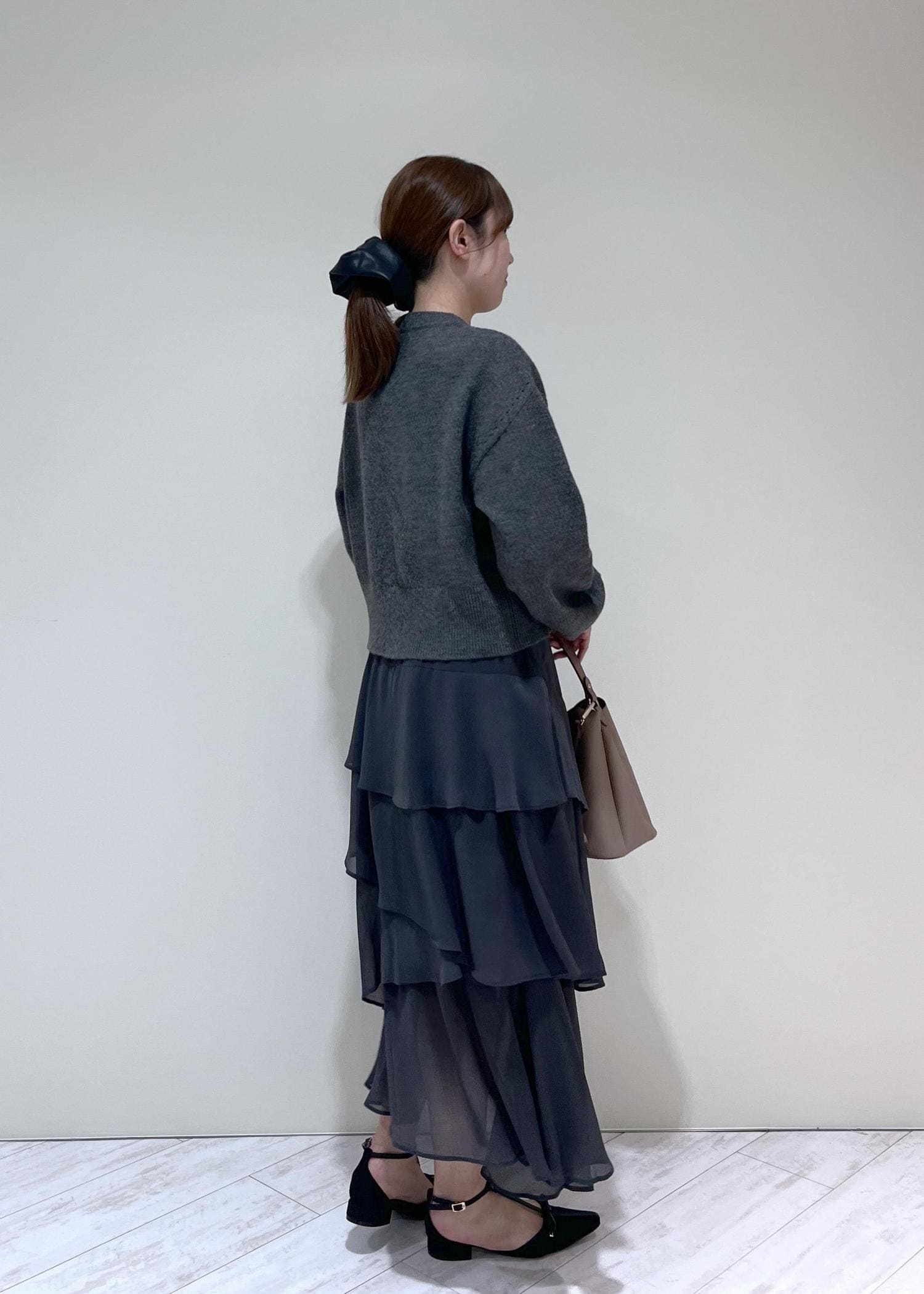 VIS花柄アソート楊柳ティアードスカートチャコール / F¥4,613レビューウエストはゴムですが、前にはギャザーがなくすっきり着られます!身長164cmでくるぶし上の着丈ですが、膝下に透け感があり重たくなりすぎないです◎