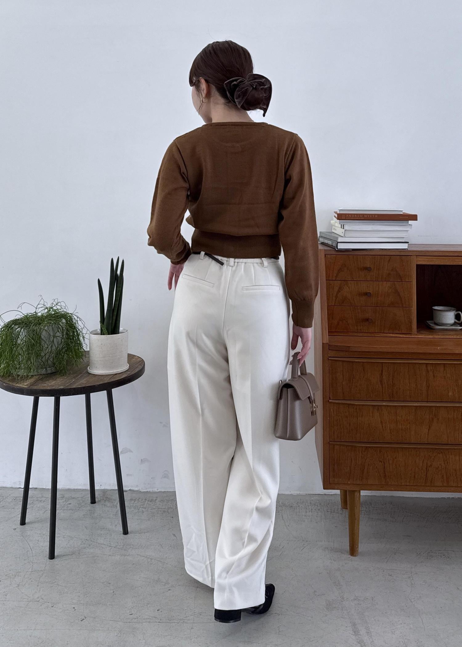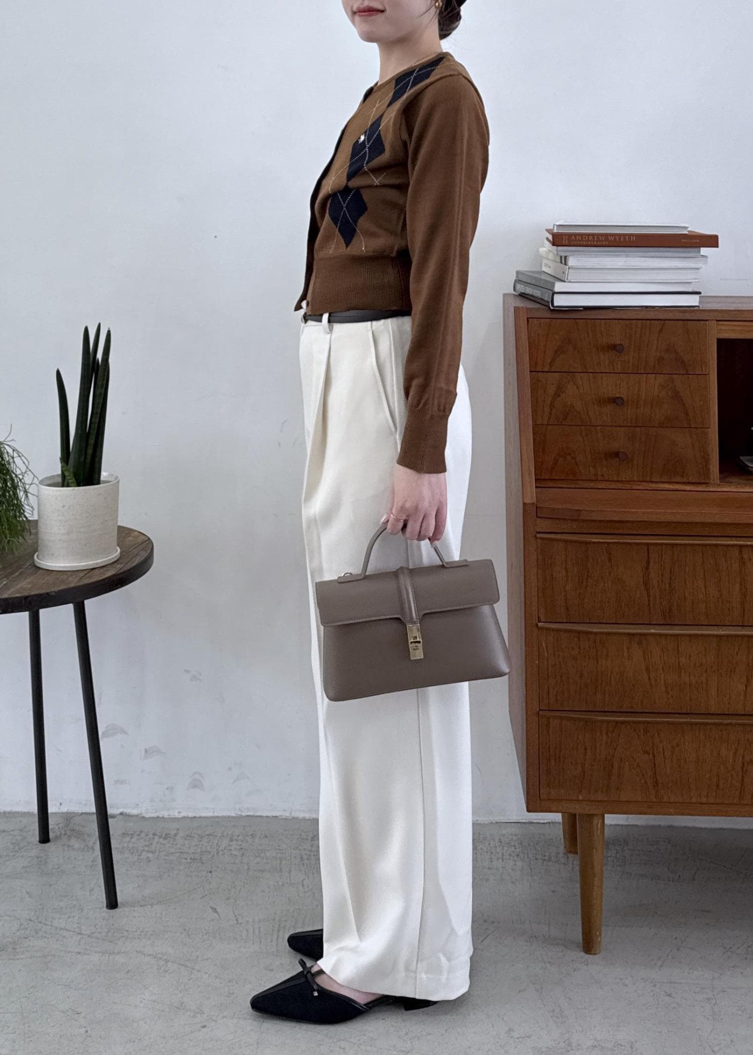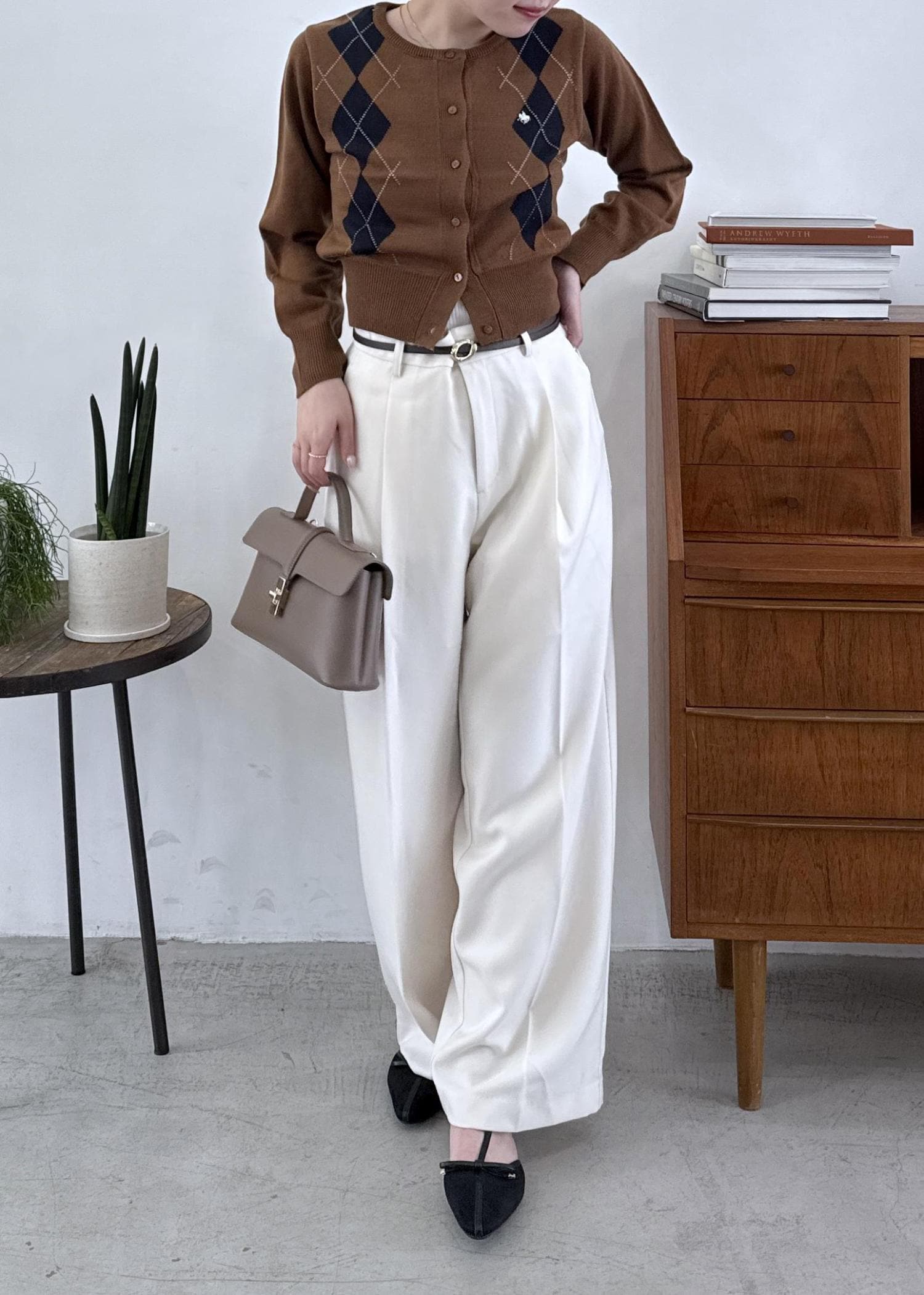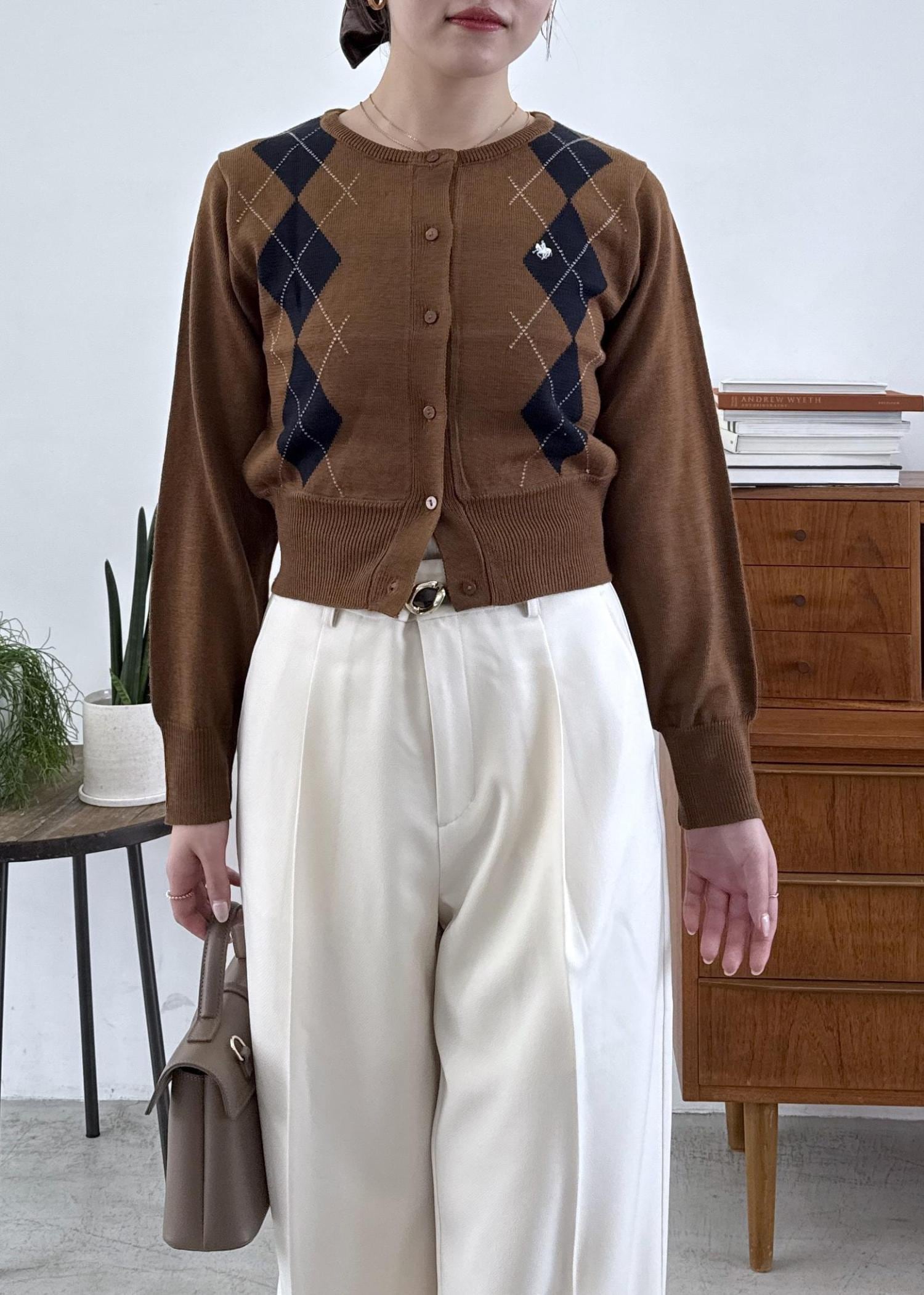 秋らしいアーガイル柄のコンパクトカーディガンをメインに、大人きれいめパンツスタイルに!