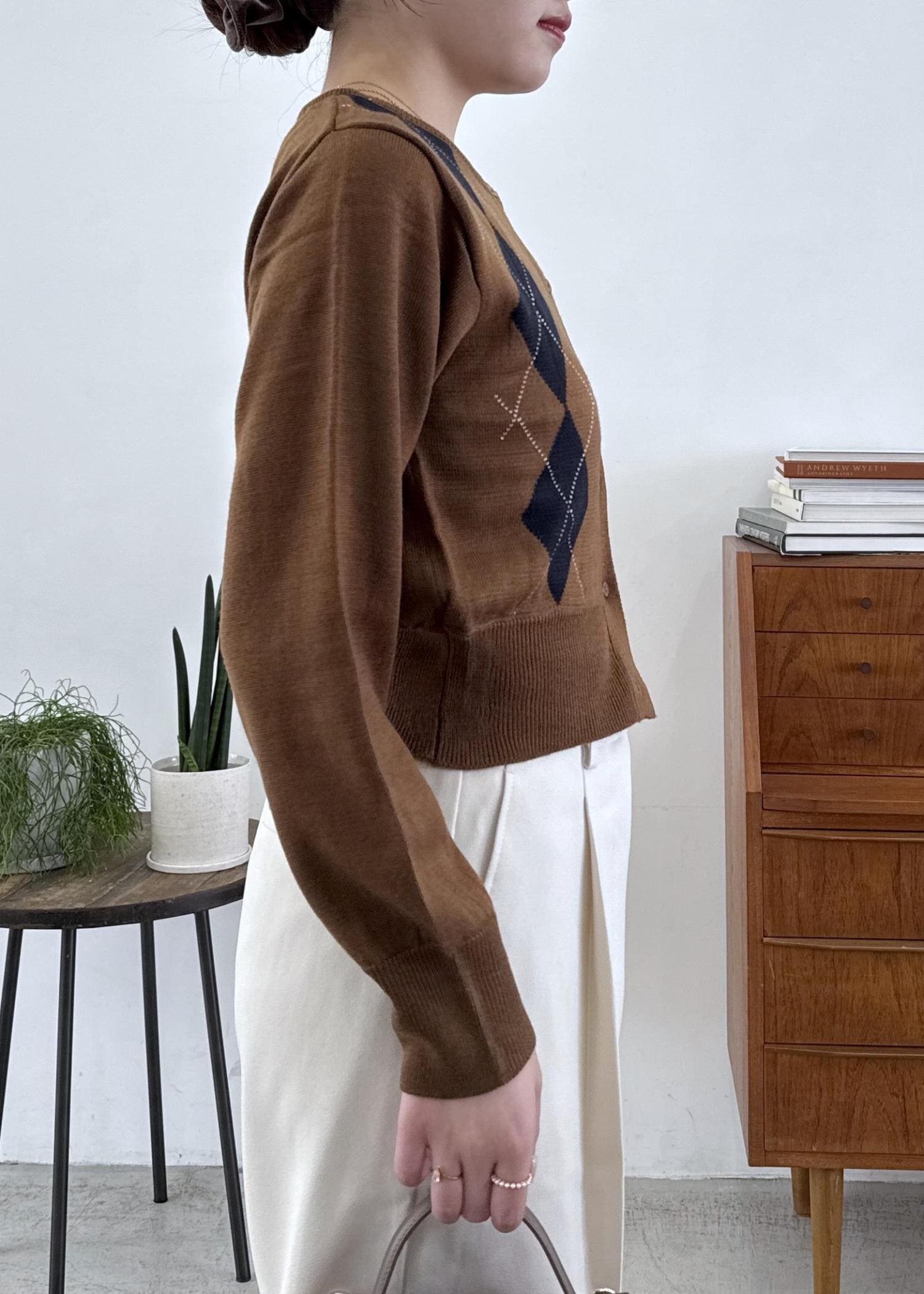VIS【POLO BCS】VIS別注アーガイルニットカーディガンキャメル / F¥7,920レビューかなりコンパクトなシルエットなので、シアーやレースのインナーを敢えて見せるスタイルをおすすめします◎