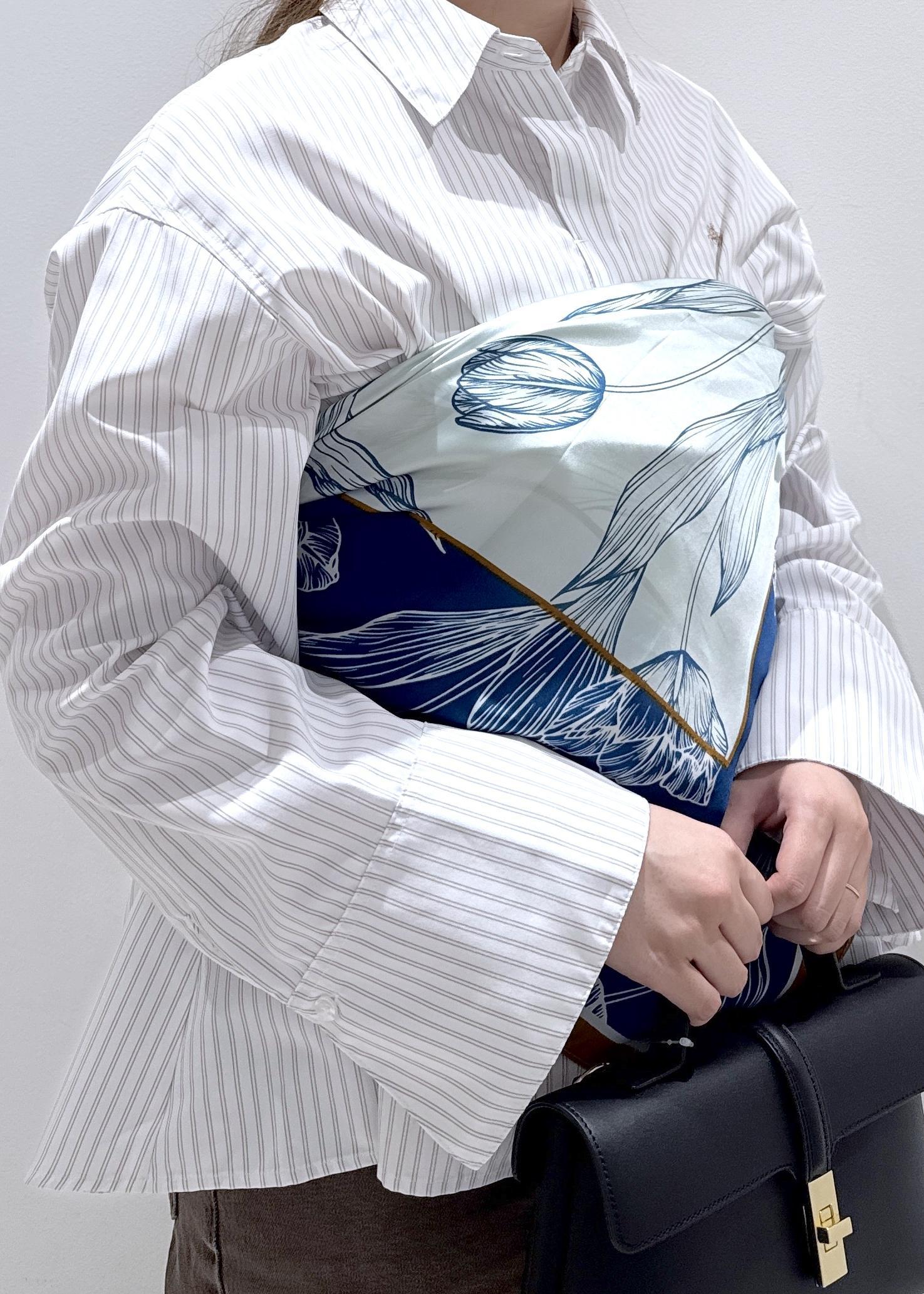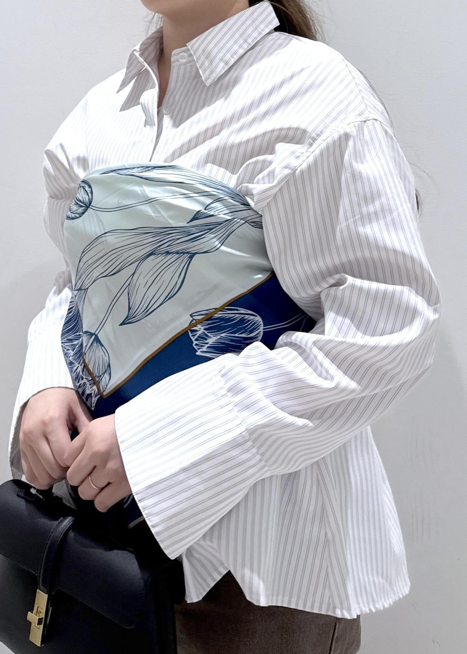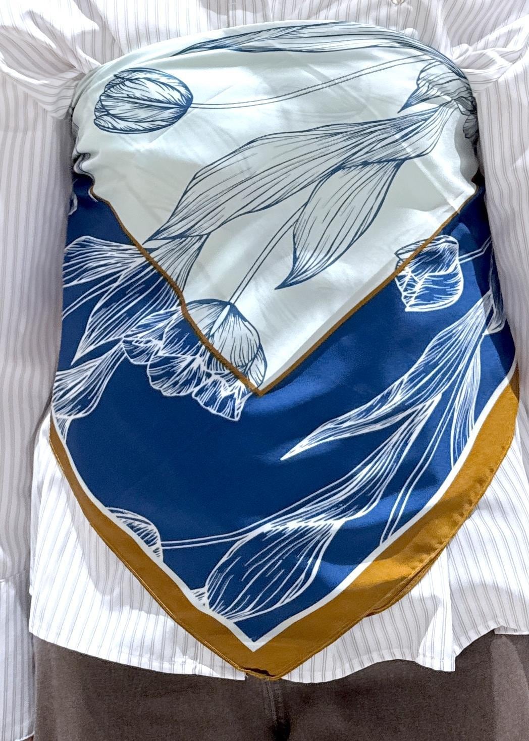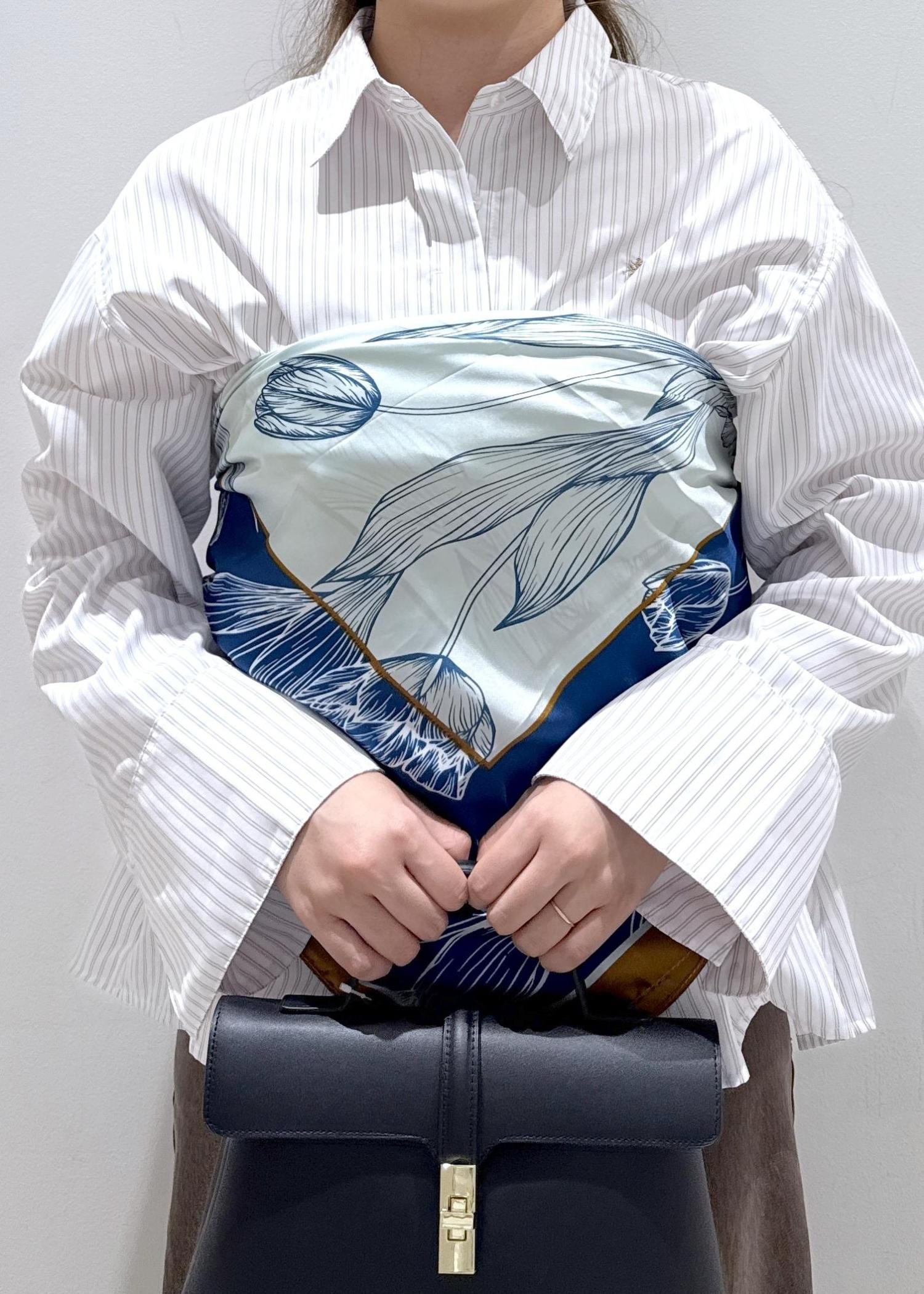 ポリエステル素材の正方形型の90cmのサイズになります。大判ストールスカーフになるので、腰や肩に巻いてもたっぷり余裕感が有り◎肌触りも柔らかくサラッとしているので巻きやすいです。チューリップ柄なので、綺麗目なコーディネートや甘いフェミニンにもに合いそうです。付けるだけでポイントになるので一枚持っておくとオススメですよ♪