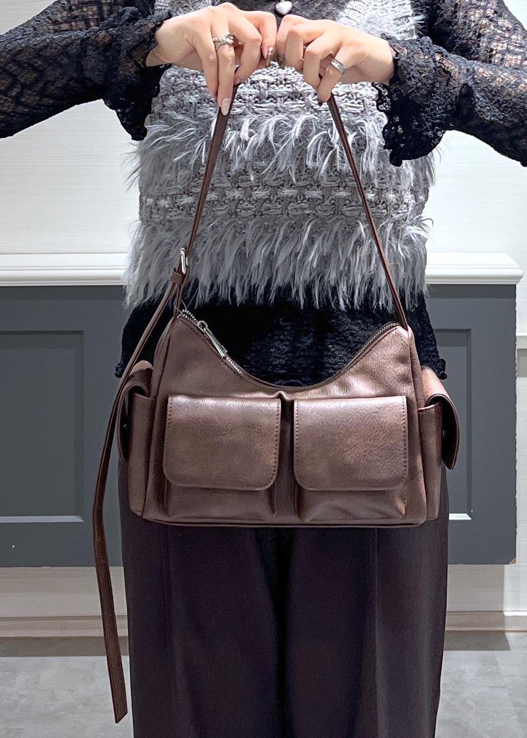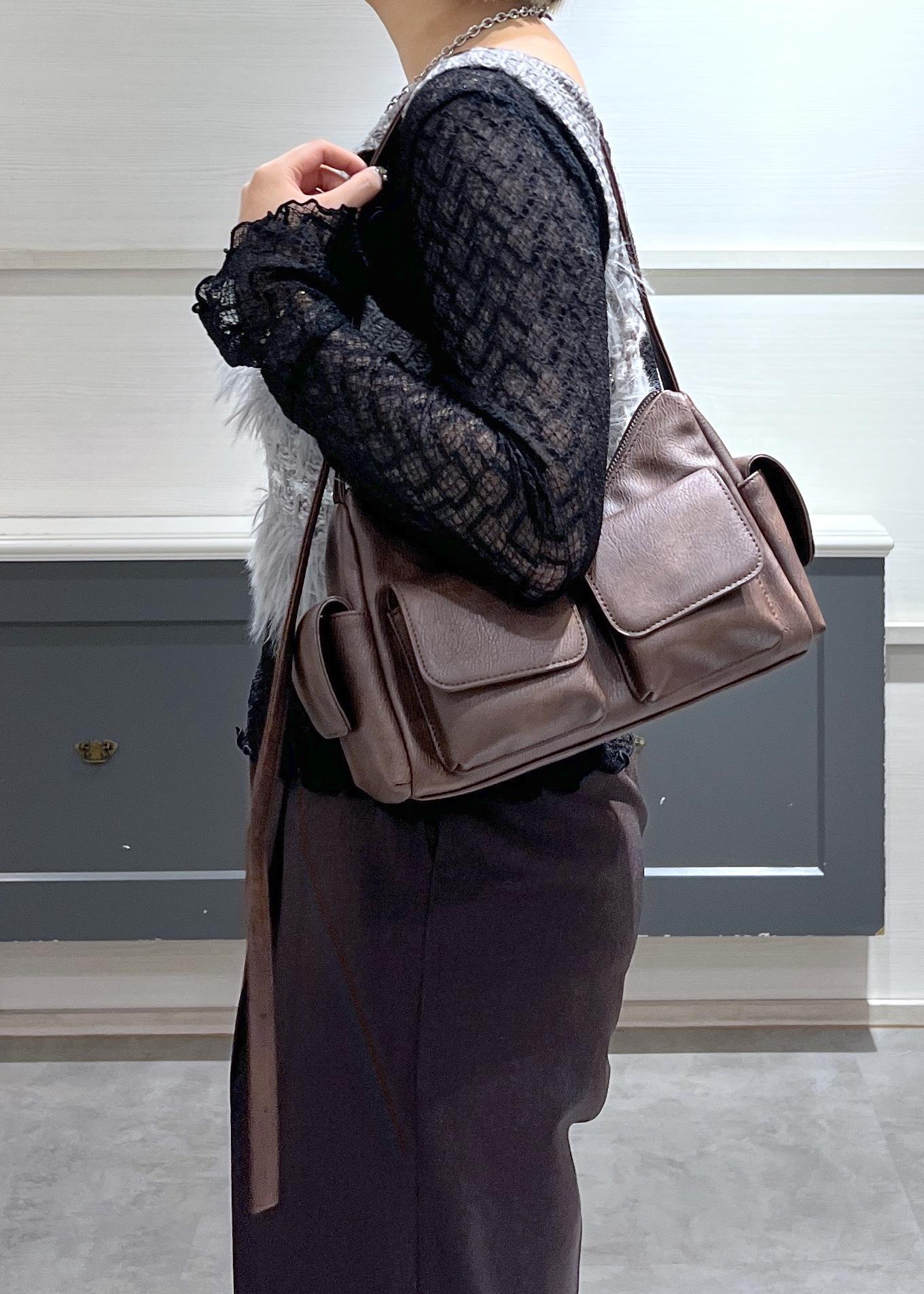 秋らしいビンテージ加工のバッグにシルバーのネックレスが