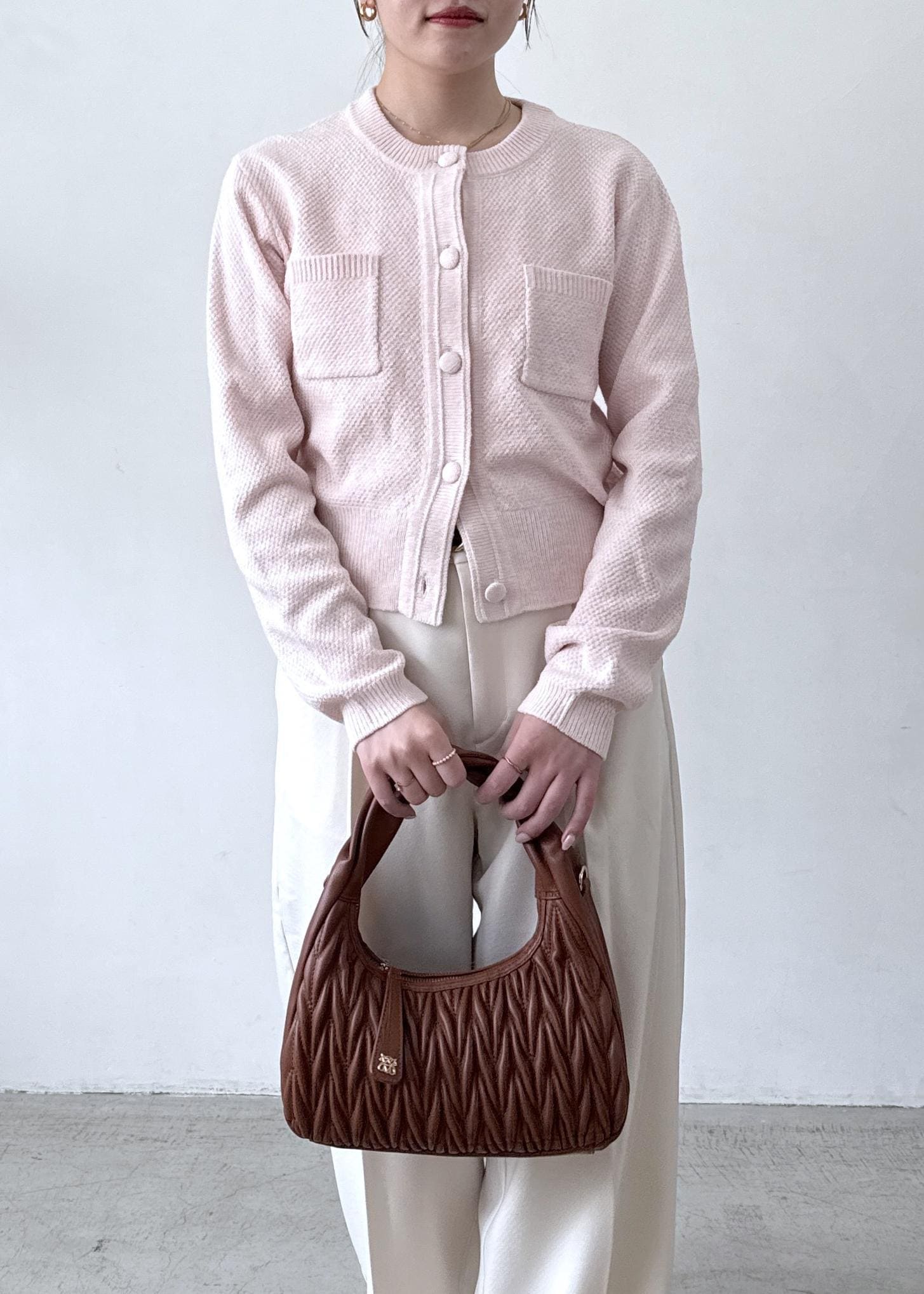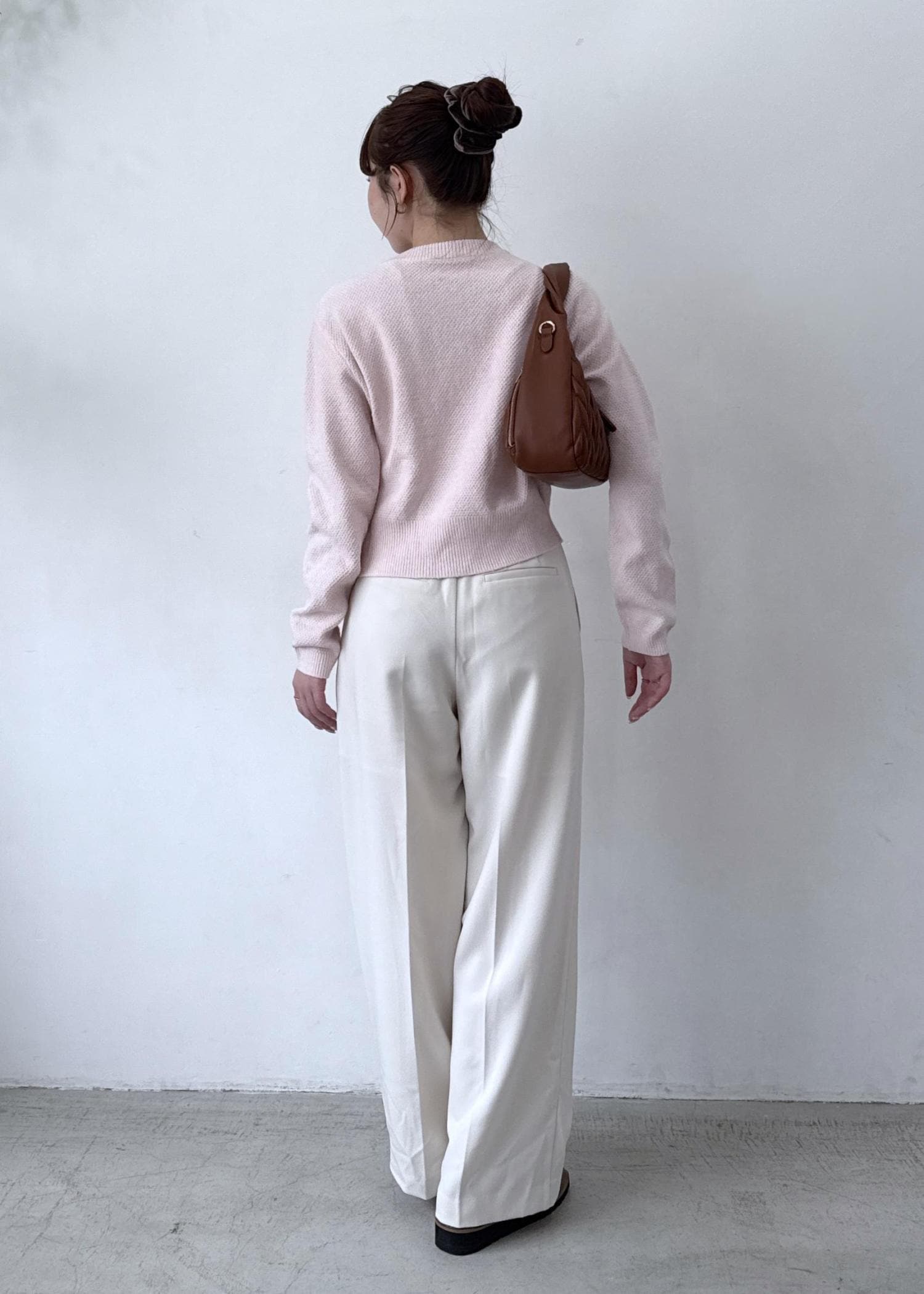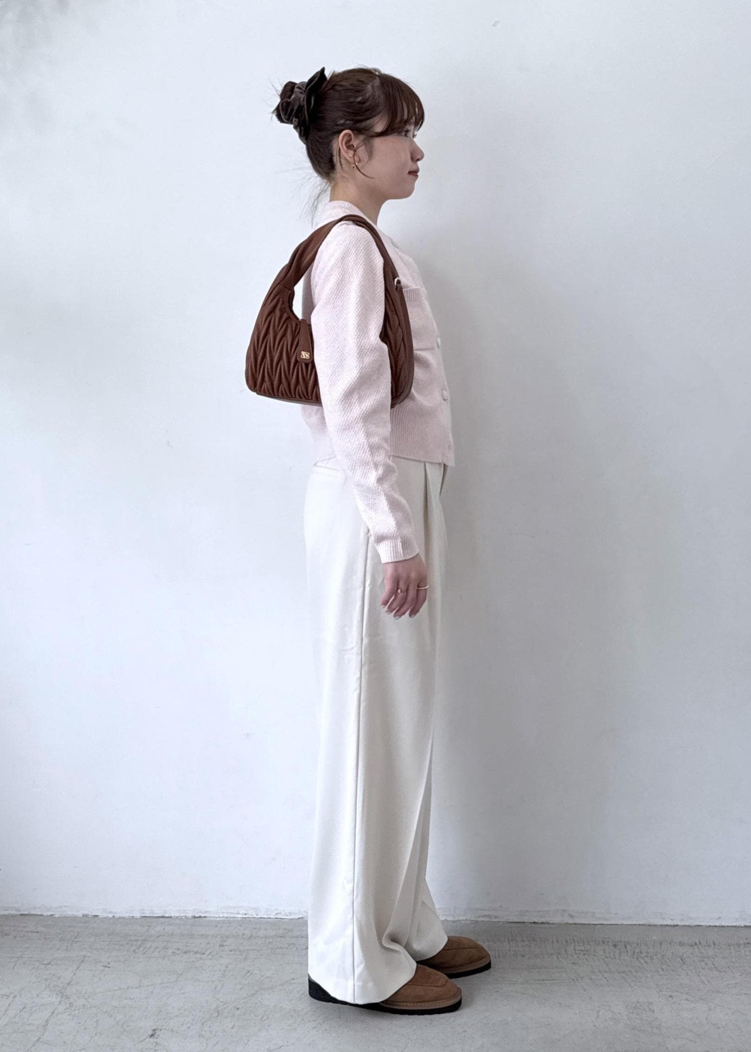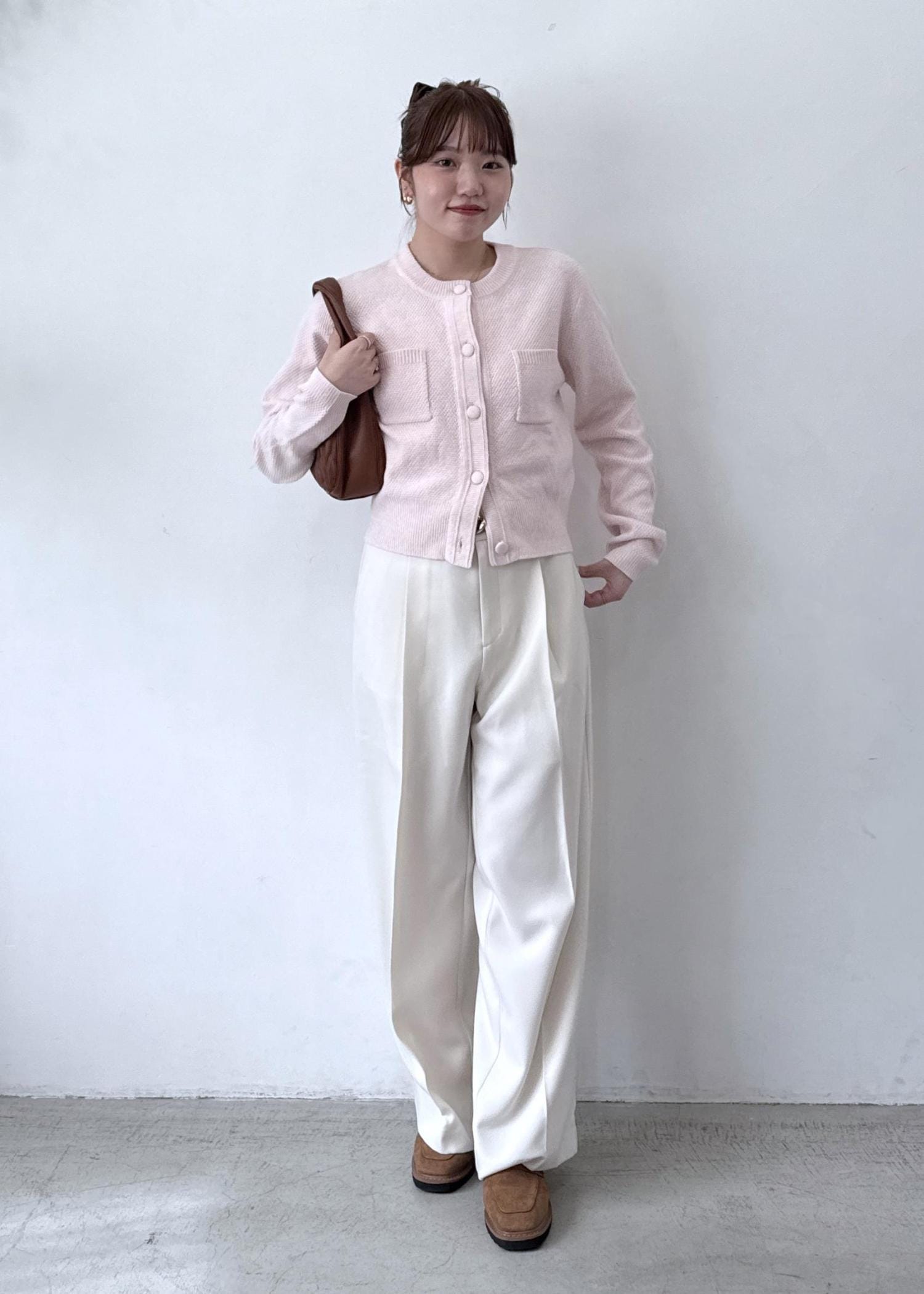 小物に、ブラウンを持ってくることで、淡いコーデにまとまりが出るのがポイントです!