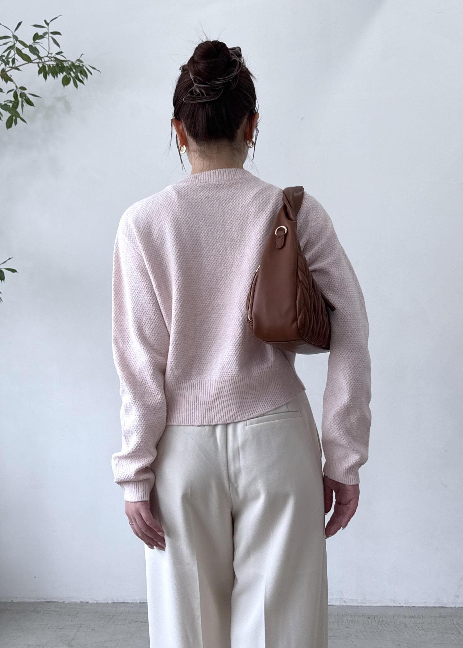 淡いピンクと秋らしいブラウンの合わせで、カジュアルだけど女性らしく!お出かけスタイルに◎