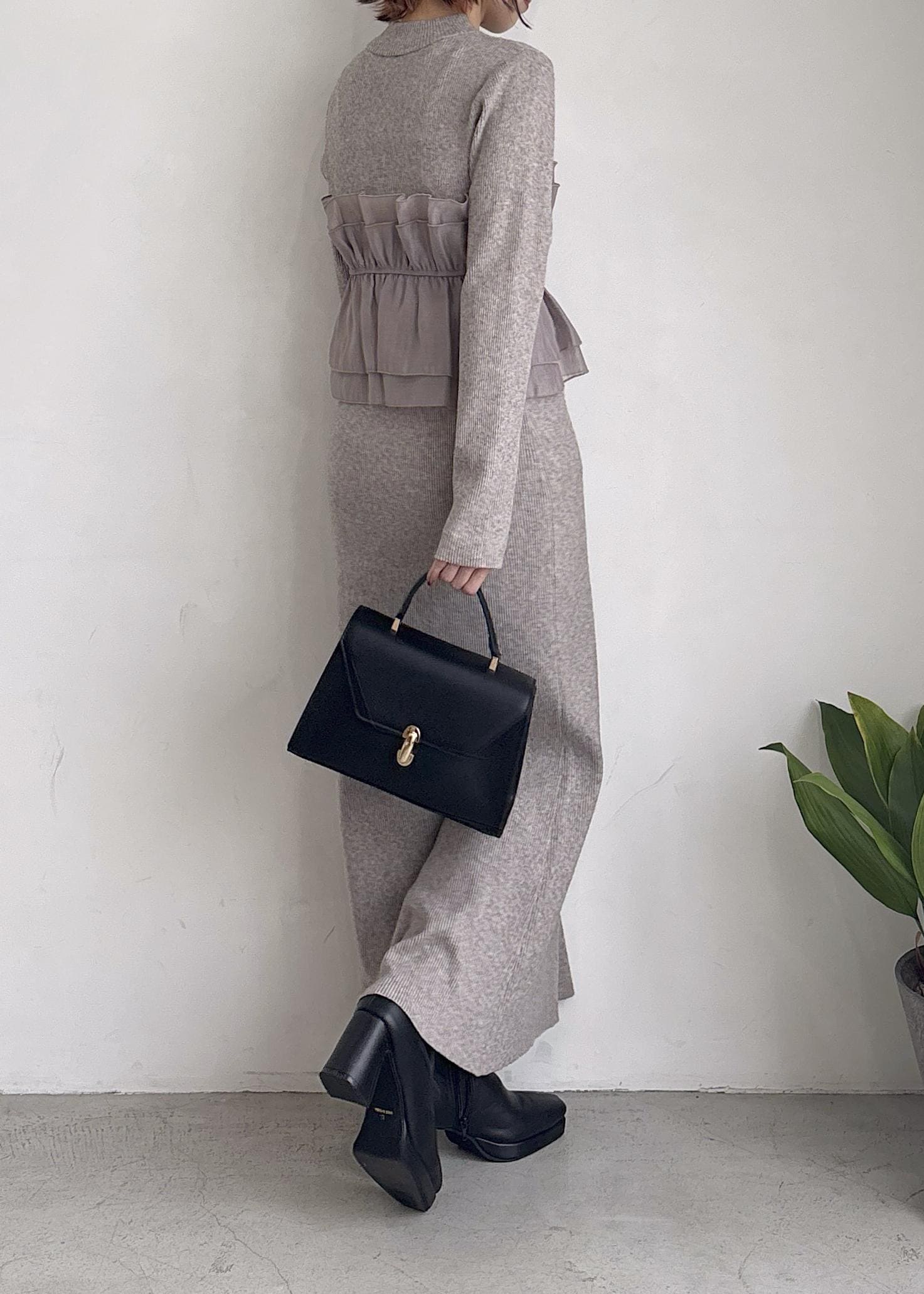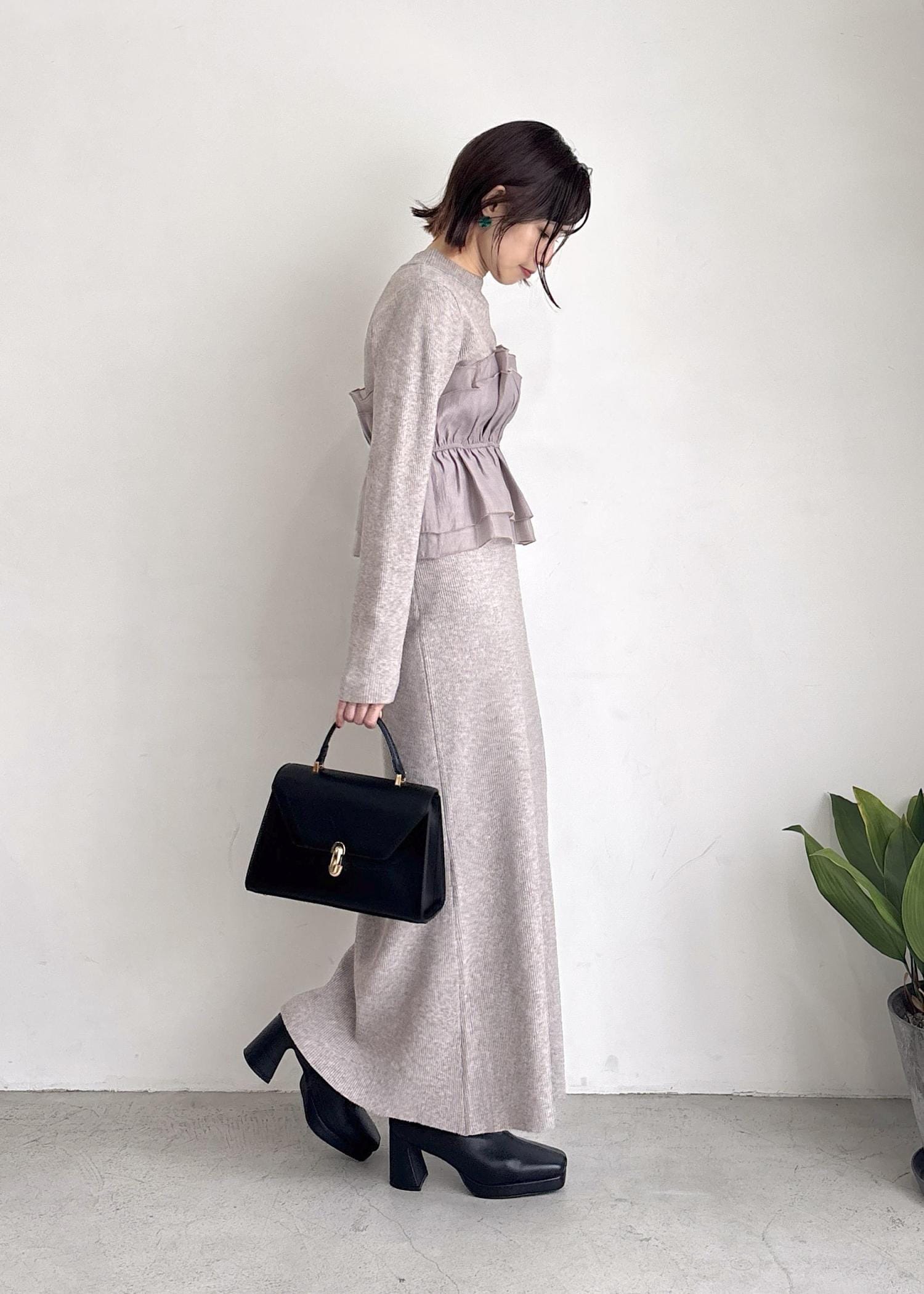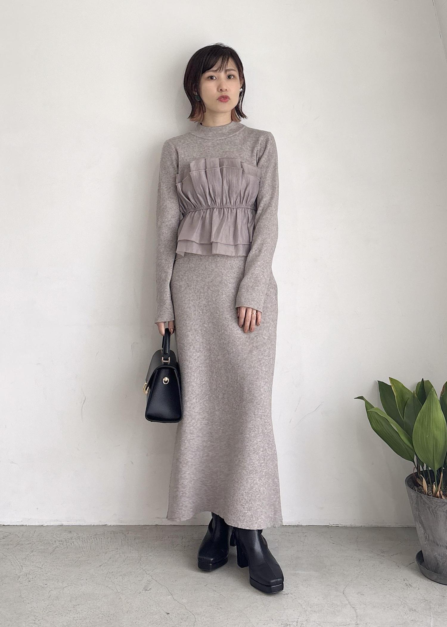 VISで毎シーズン好評のビスチェドッキングニットと、今回はセットアップで着用できるスカートも登場です♪グレー系の色合わせで淡色カラー、小物はぶらっくでスッキリとした印象にまとめました◎秋何着ようかお悩みの方、セットアップで揃えておけば着回し力がありオススメです。