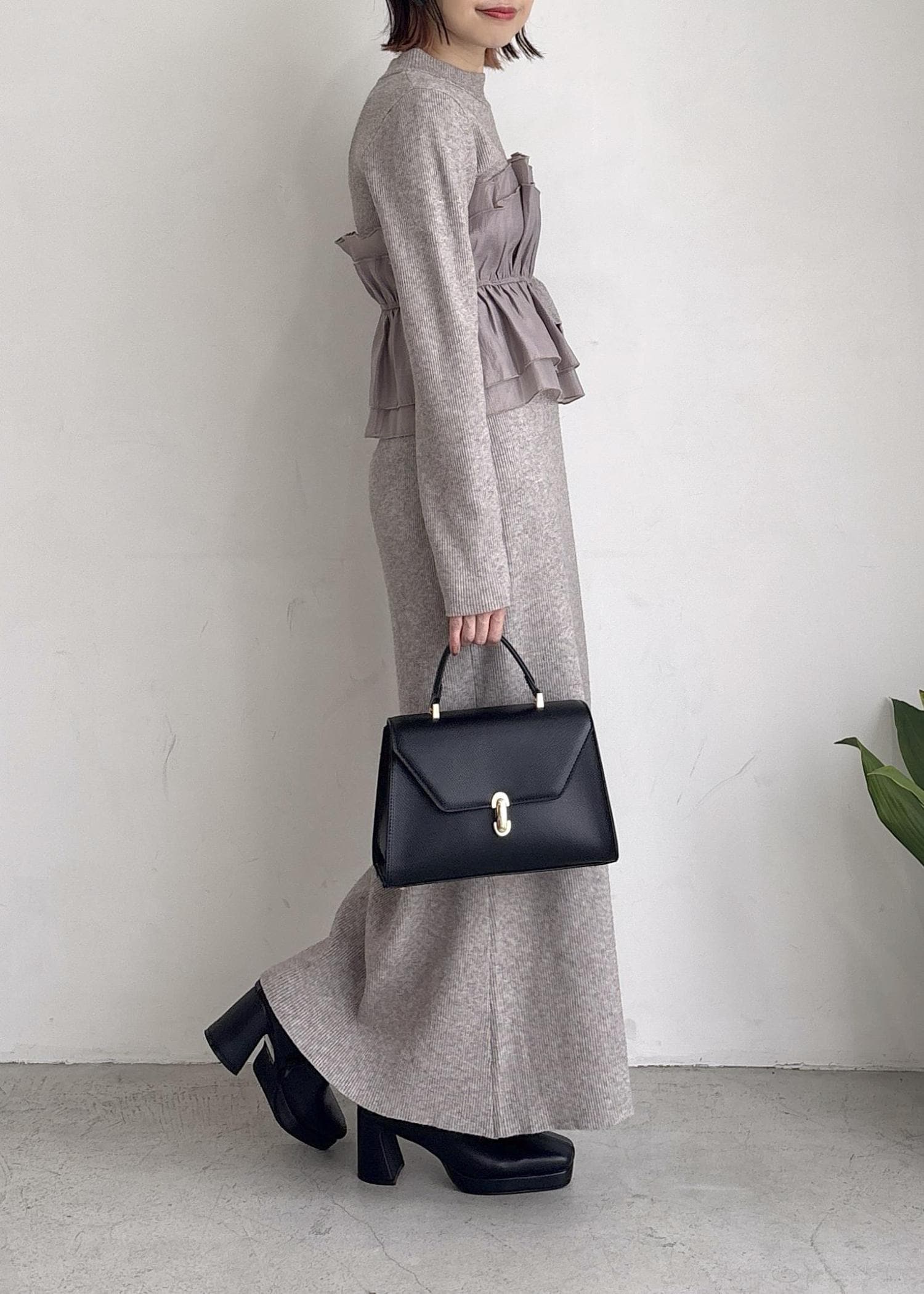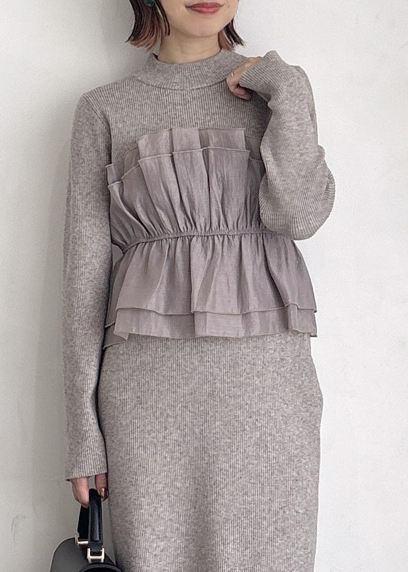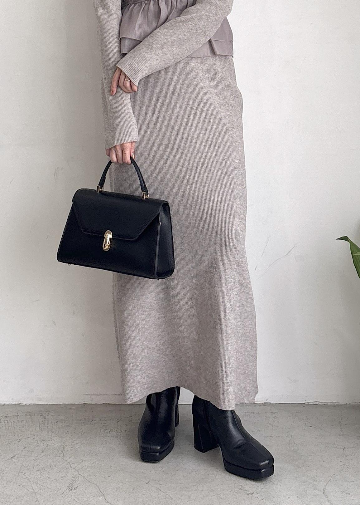 VISで毎シーズン好評のビスチェドッキングニットと、今回はセットアップで着用できるスカートも登場です♪グレー系の色合わせで淡色カラー、小物はぶらっくでスッキリとした印象にまとめました◎秋何着ようかお悩みの方、セットアップで揃えておけば着回し力がありオススメです。